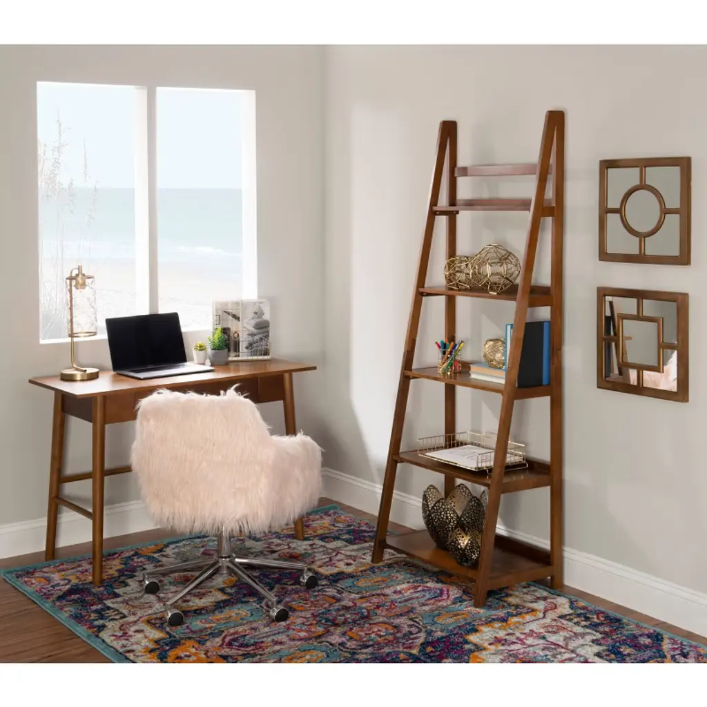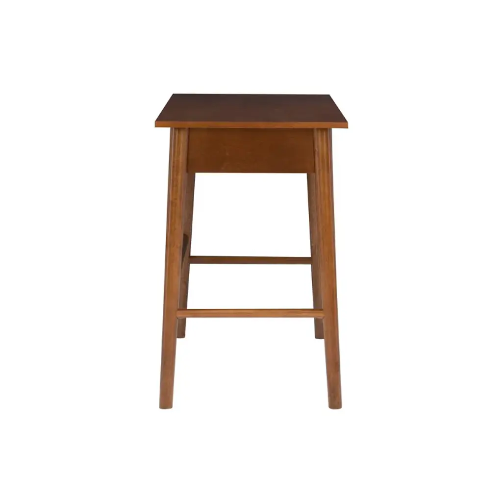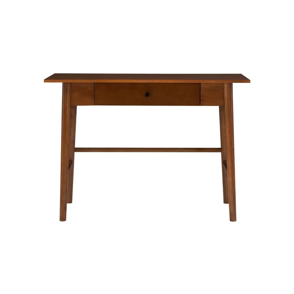 Whether you’re working from home or just need a comfortable place to pen correspondence, this modern desk is an elegant addition to your home. Its midcentury design features sturdy rounded legs set at an angle and an expansive workspace. The front drawer, adorned with a simple black knob, provides storage for supplies. Finished in a warm walnut shade birch veneer, this desk will complement any decor or room, including the office, bedroom, kitchen or living room. It’s most at home with similar pieces in the same collection.Overall Width: 42”Overall Depth: 19”Overall Height: 30”Floor to Apron Height: 24.4”Drawer Width: 20.7”Drawer Depth: 10.86”Drawer Height: 2.55”