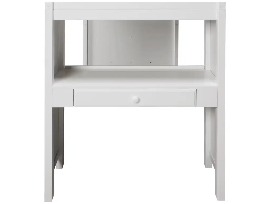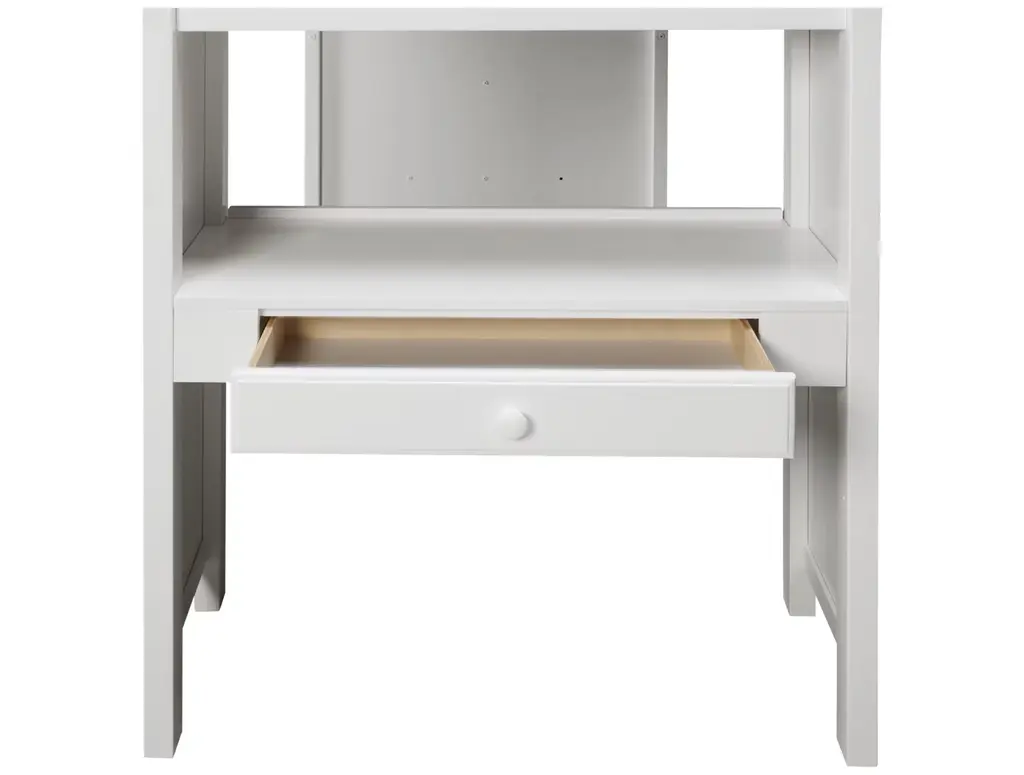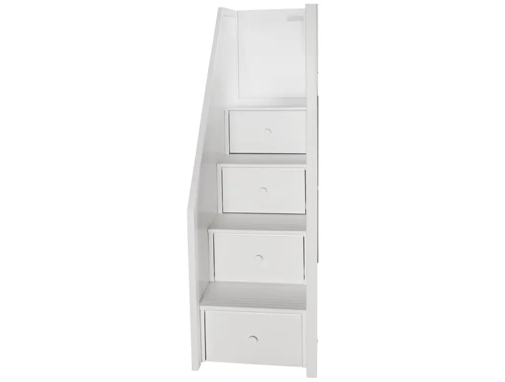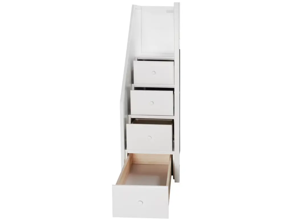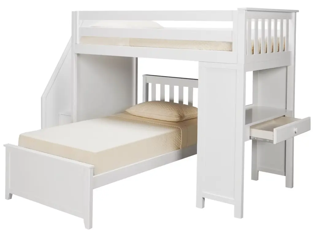 Outfit your kid's room with one furniture piece! The MaxWood Furniture Chester Twin Loft Bed with Desk features an ingenious multifunctional design that lets your child sleep comfortably and store their essentials all in one unit. Made of solid wood, this traditional-style twin loft unit includes two twin beds with slatted headboards, a staircase on the left side with four storage drawers, and a desk with one center drawer on the right side. Available in other finishes.