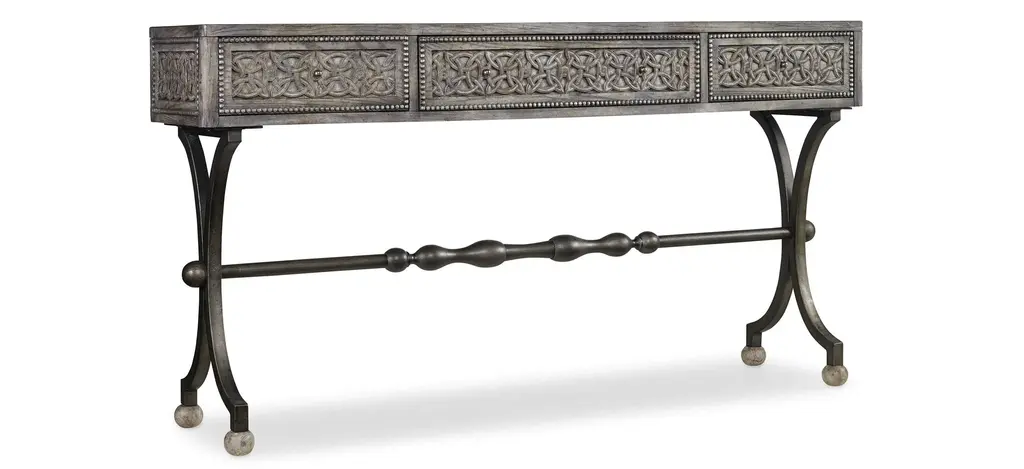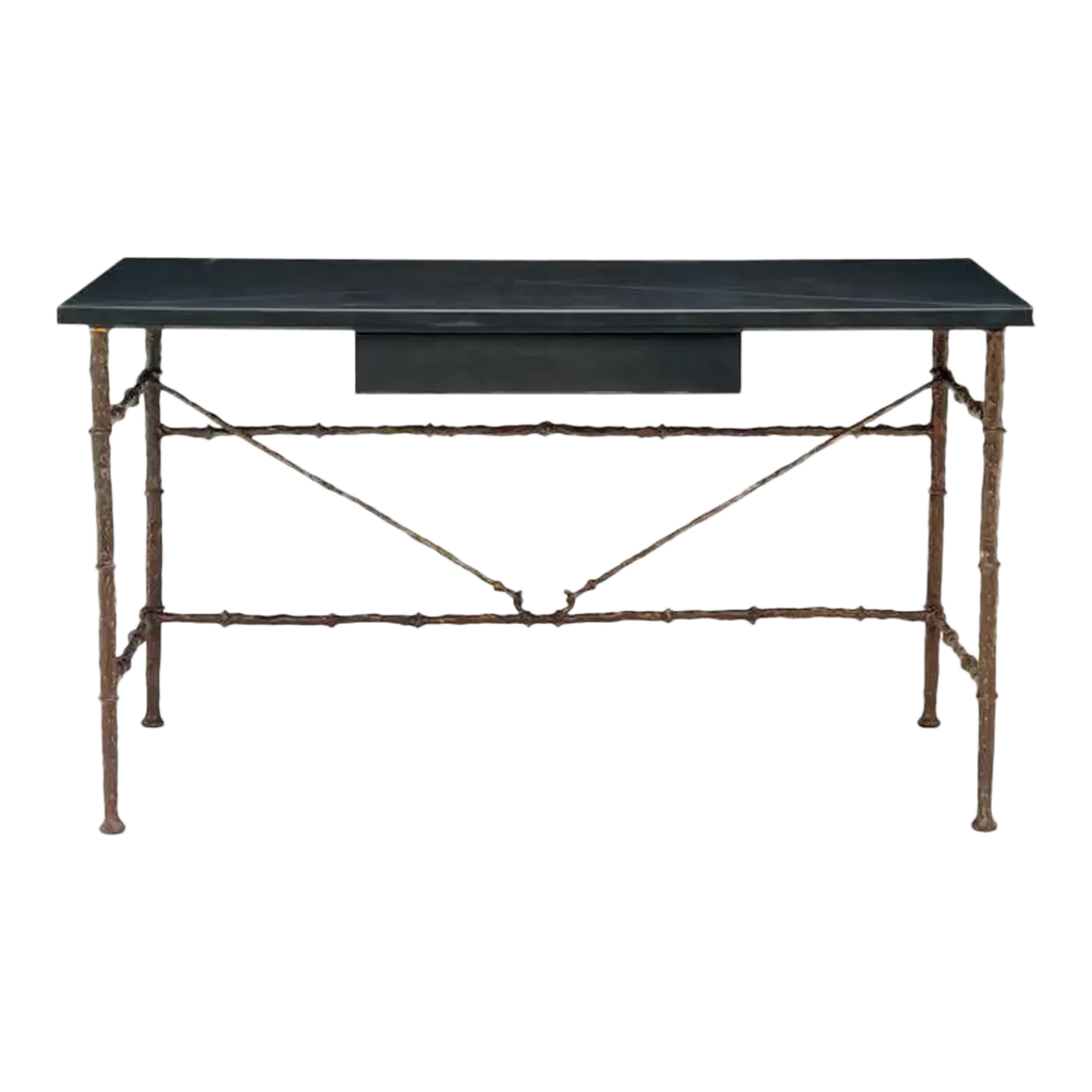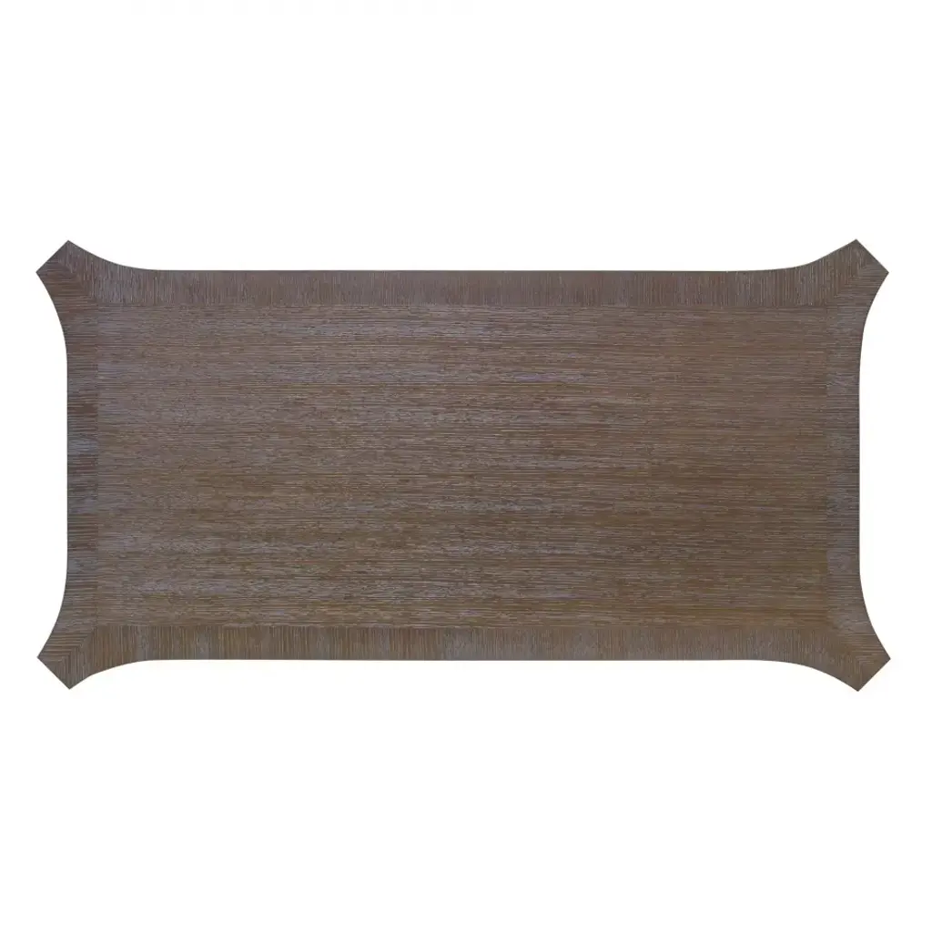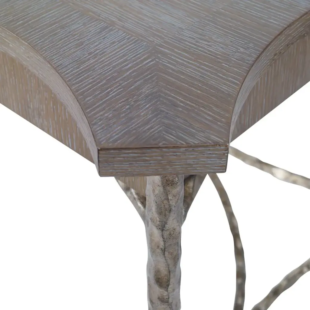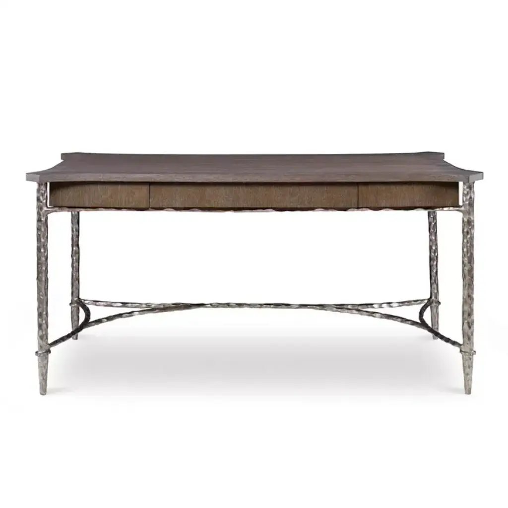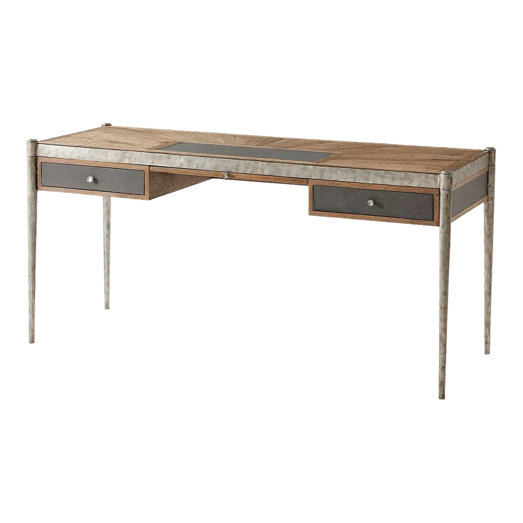 Made of brushed American White Oak with a driftwood ceruse finish. Legs are made of aluminum with antique silver metal leaf. Three drawers.