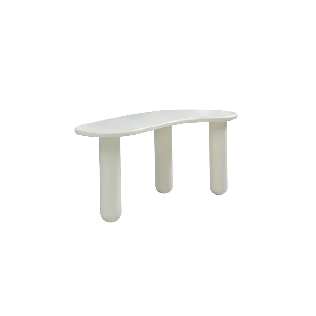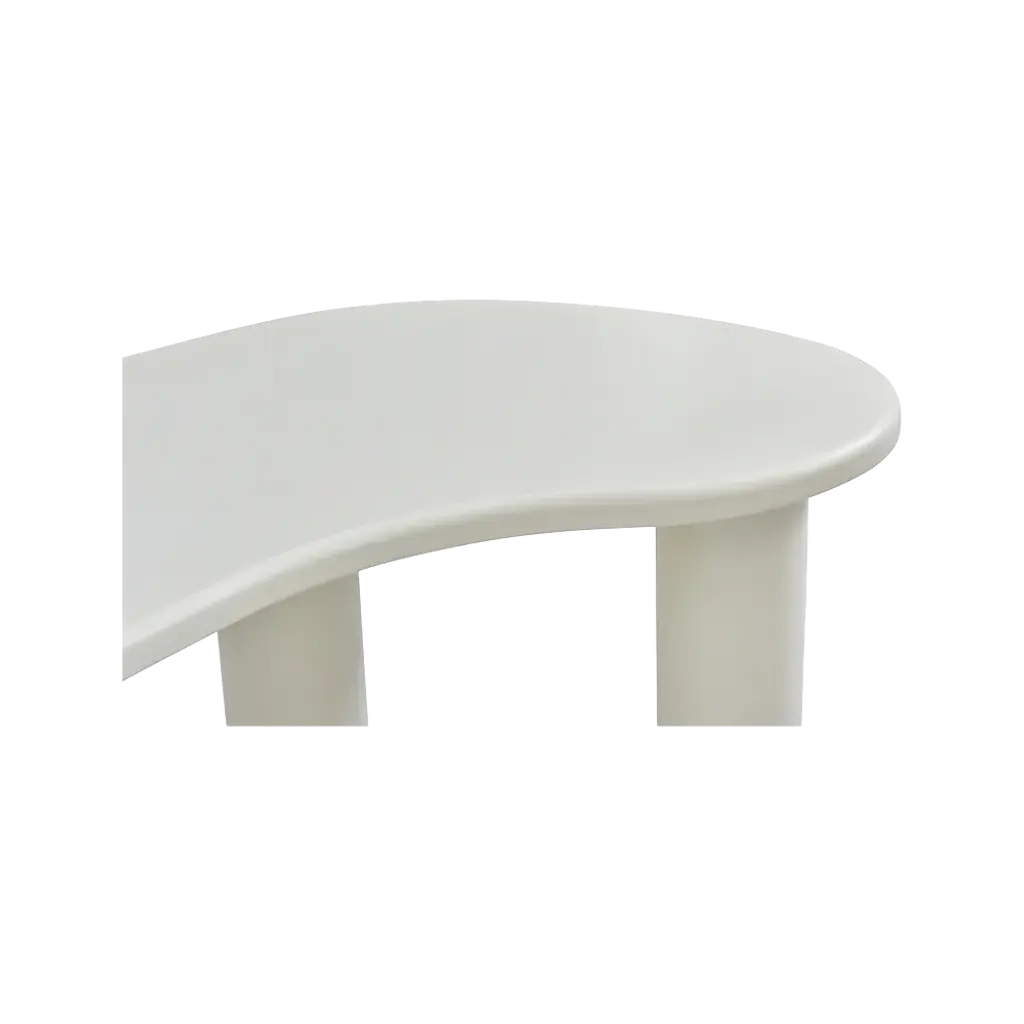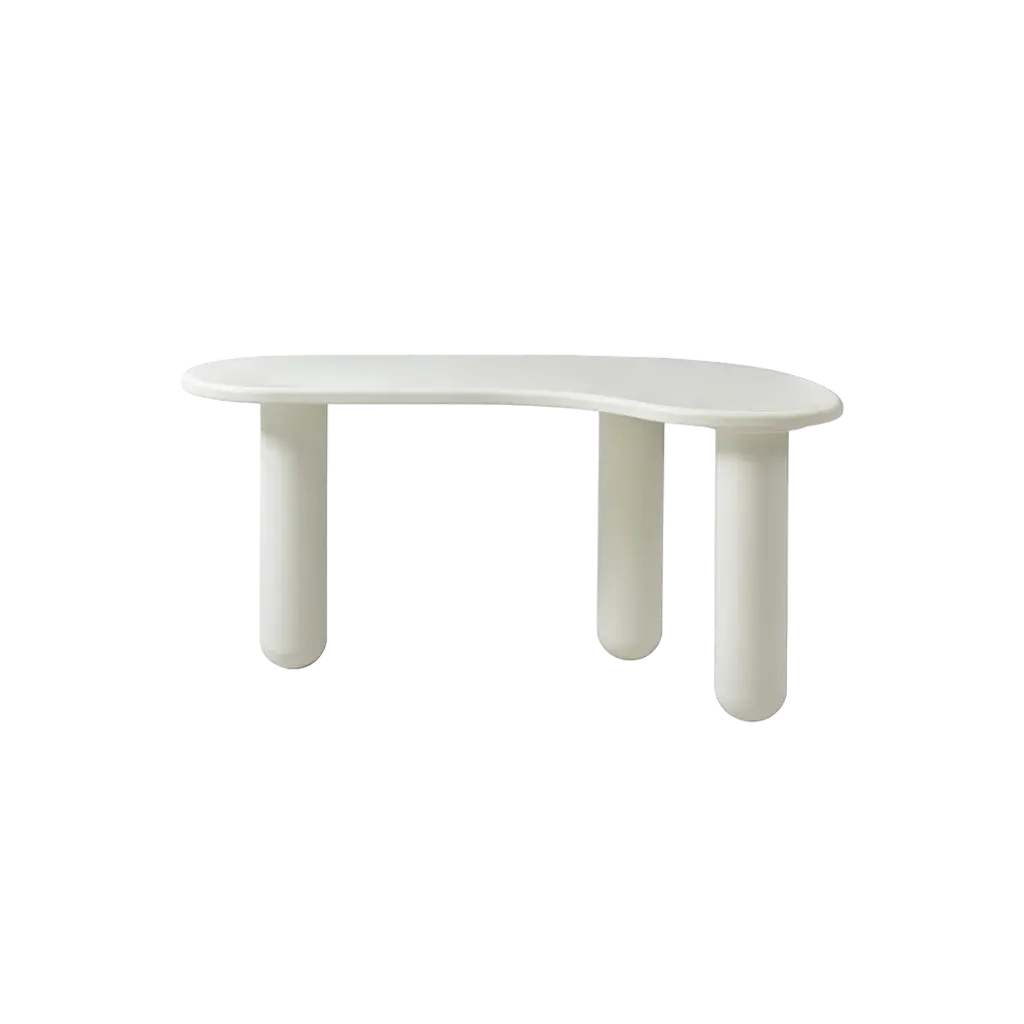 The Cielo Desk in Alabaster is a sculptural masterpiece of modern design, featuring a curved, bean-shaped top that evokes fluidity and elegance. Its supported by three substantial, rounded cylindrical legs in the same soft, neutral alabaster finish. Its minimalist form and subtle curves add a touch of artistic sophistication, perfect for displaying decor, serving as a creative workstation, or enhancing minimalist interiors with its serene, matte aesthetic.