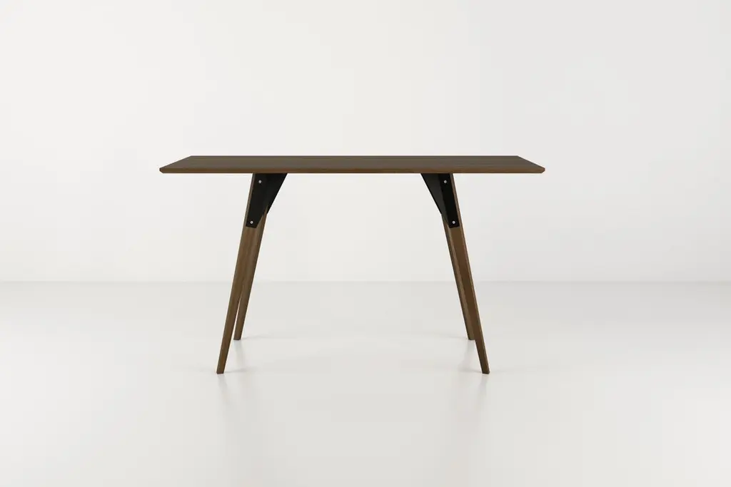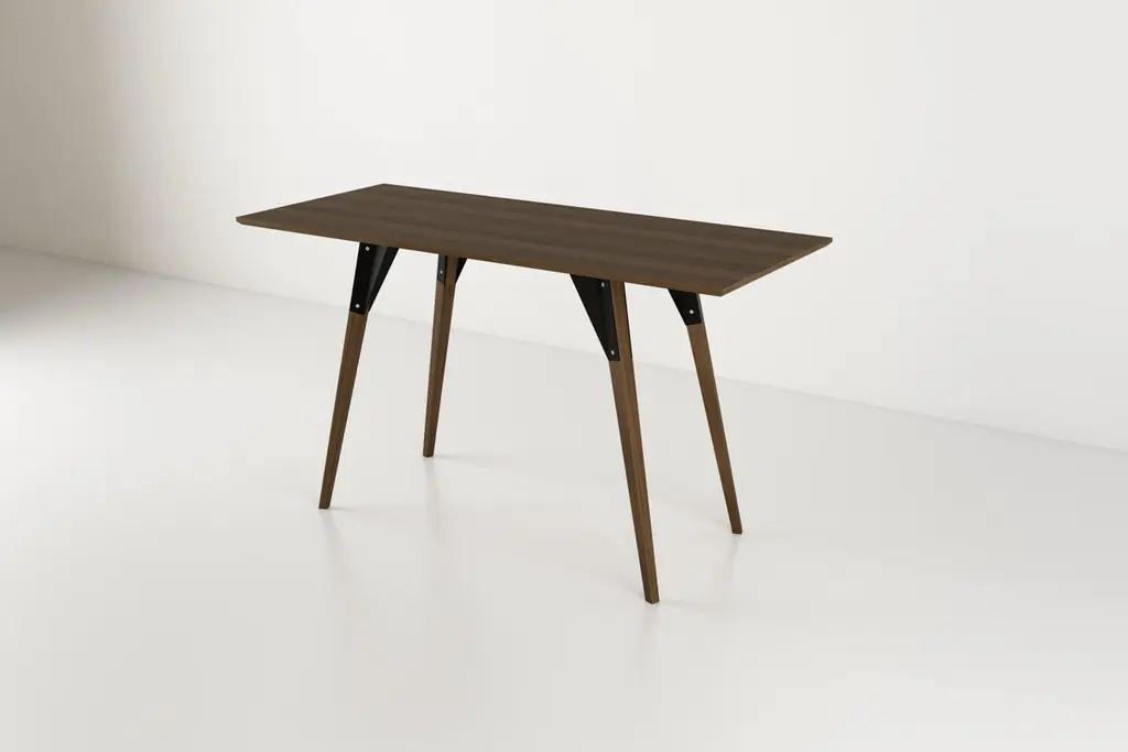 The Clarke Collection comes in ten different table top sizes, two wood species, and two metal finishes. The exposed stainless steel bolts blur the line between Scandinavian and Industrial styles.