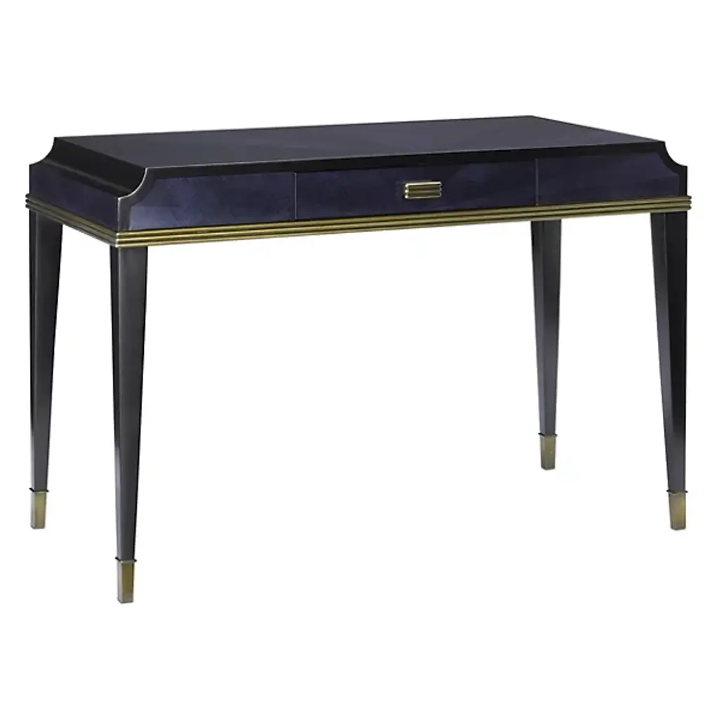 Classic French Black Desk with a tooled inset leather top writing surface, the ebonized and polished finish with brass trim and capitals, with frieze drawer and raised on square tapered legs. Dimensions: 60" W x 29" D x 30" H.
