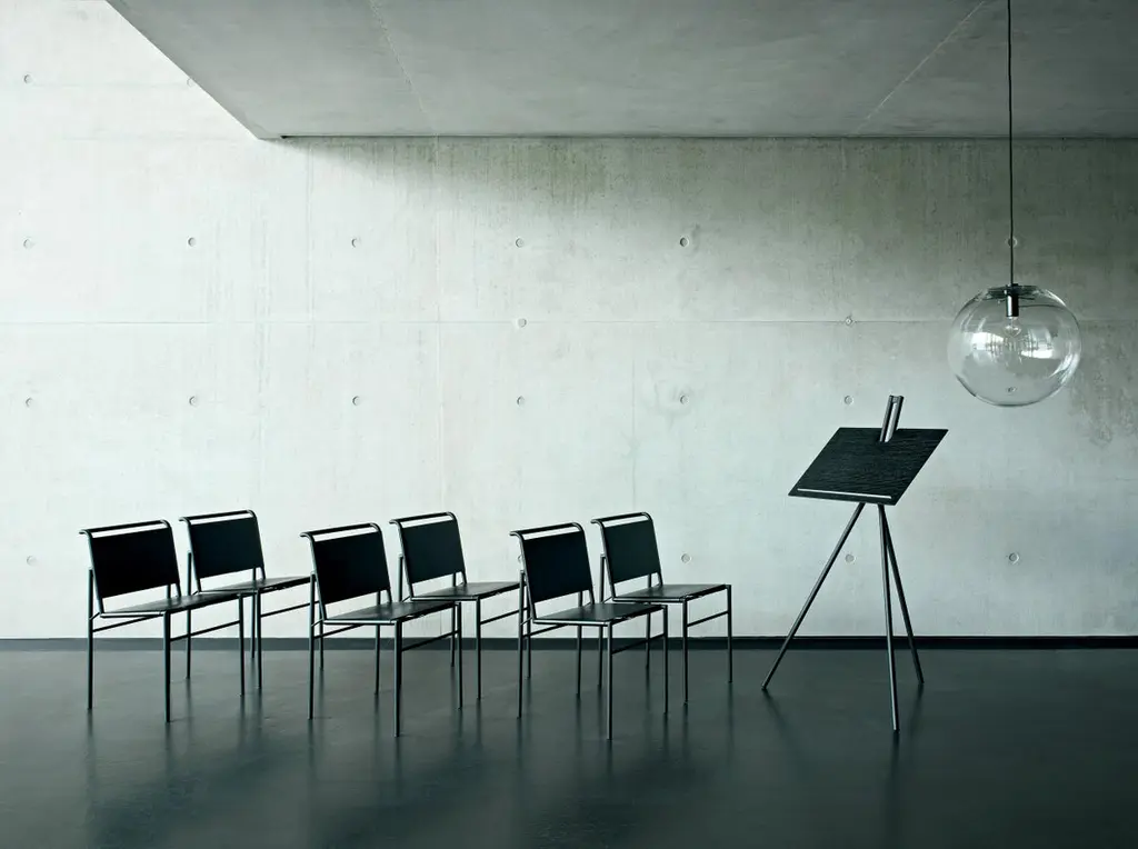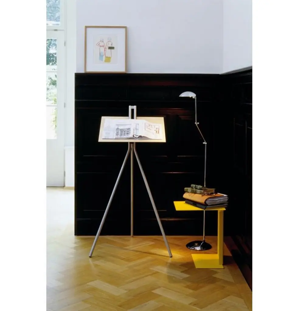 Notos is an essential object in a household or office where artistically inclined persons live and work. That is because this unprecedented, multifunctional piece of furniture transforms itself in no time into a standing desk or a note stand or an easel or a mobile table for the slide presentation or for your champagne reception. The top can be tilted at five different angles and the height is infinitely variable between 115 and 135 cm. The young team Kühl & Krob have succeeded in combining function, variability and a clear, timeless aesthetic in a design achievement of remarkable quality.Materials: Standing desk. Infinitely variable height adjustment. 5 angles of tilt. Foldable. Tabletop in plywood. Frame of powder-coated steel, fine texture. Dimensions: W 76 cm, D 63 cm, H 138 cm.Available in : Black & chrome Maple & chrome.