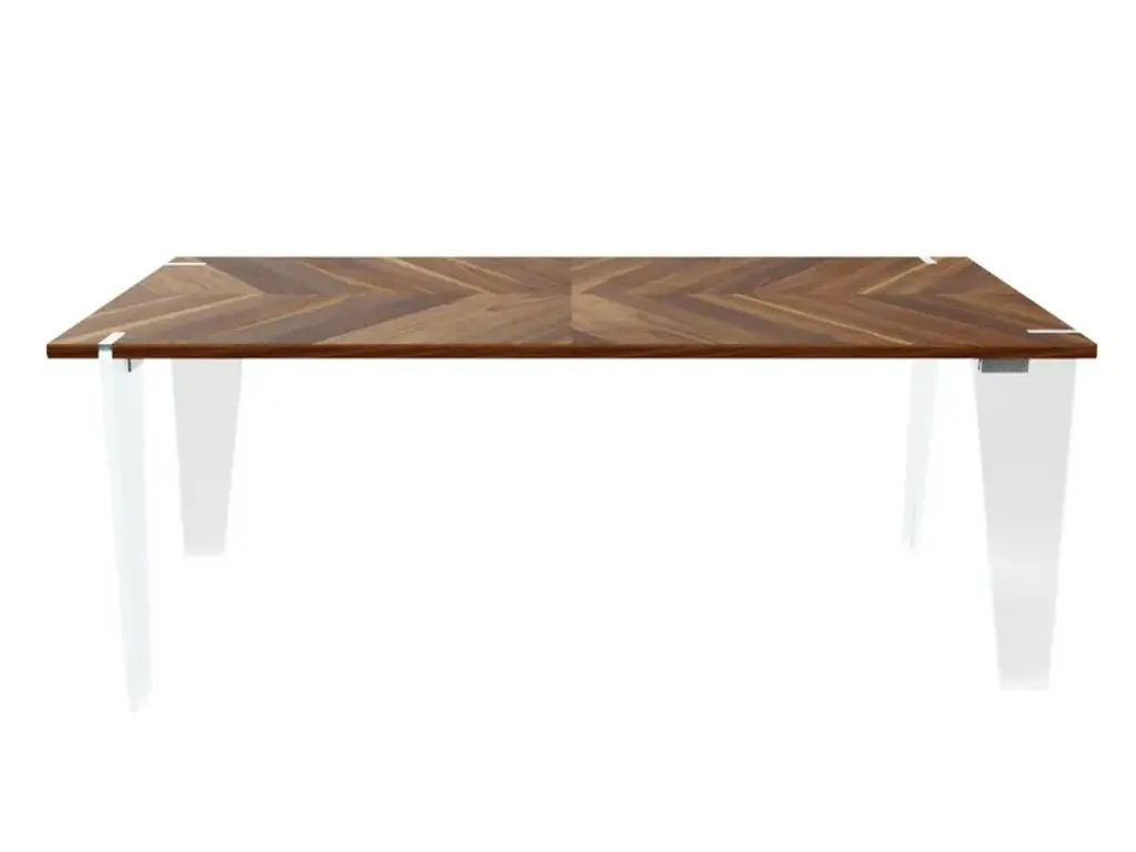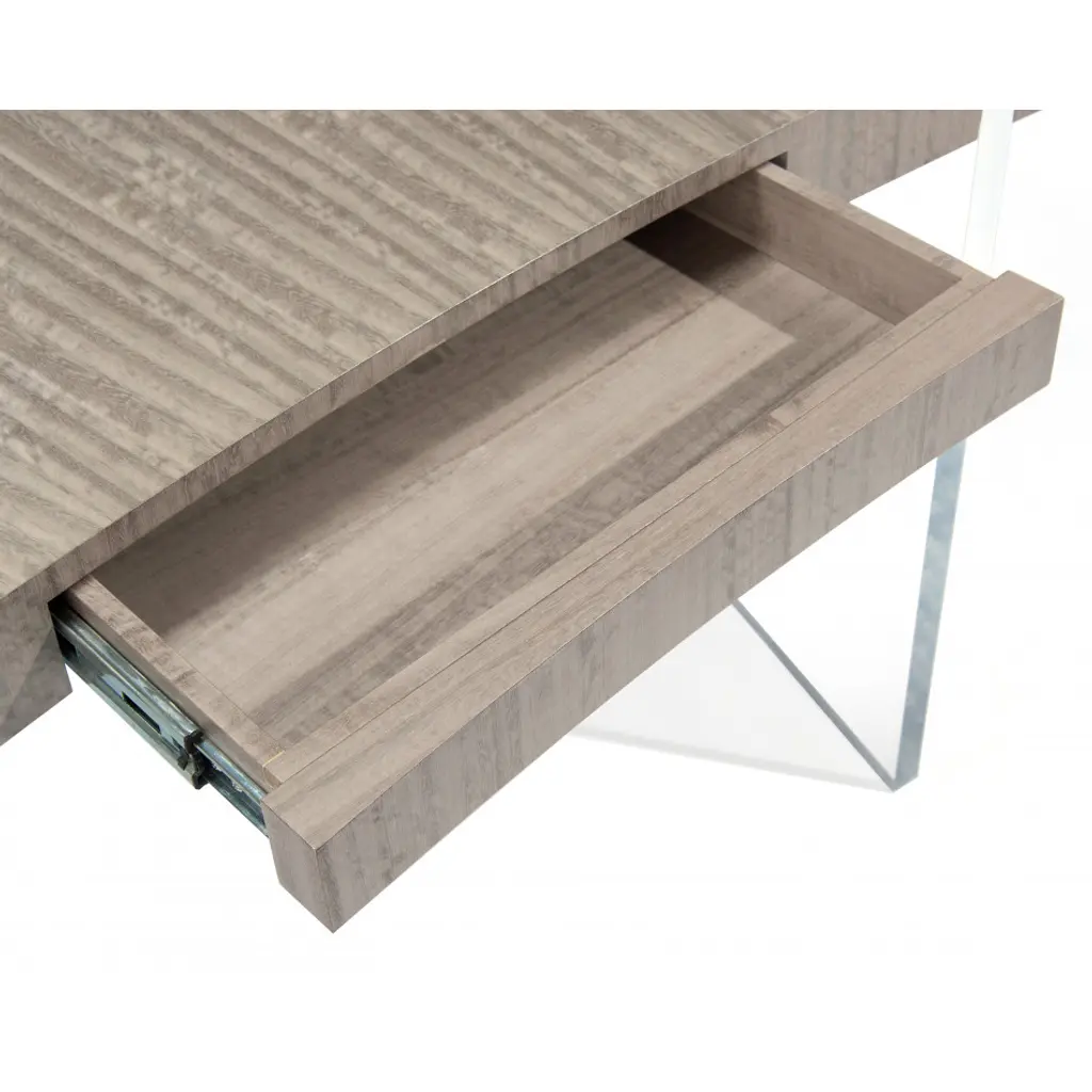 This curved desk, finished in grey figured eucalyptus, has two acrylic slab supports dissecting its top. The single drawer features a concealed handgrab and metal drawer runners.