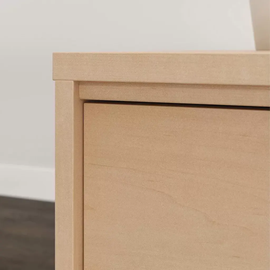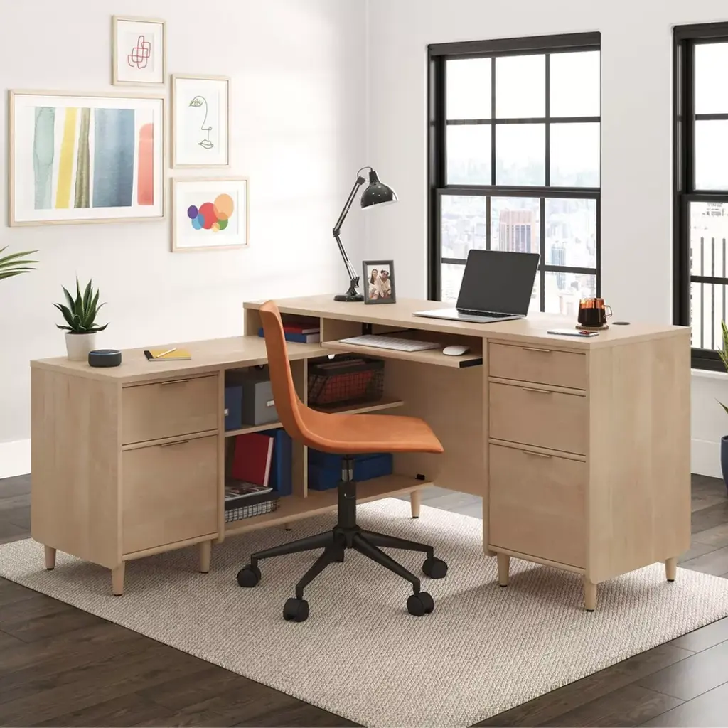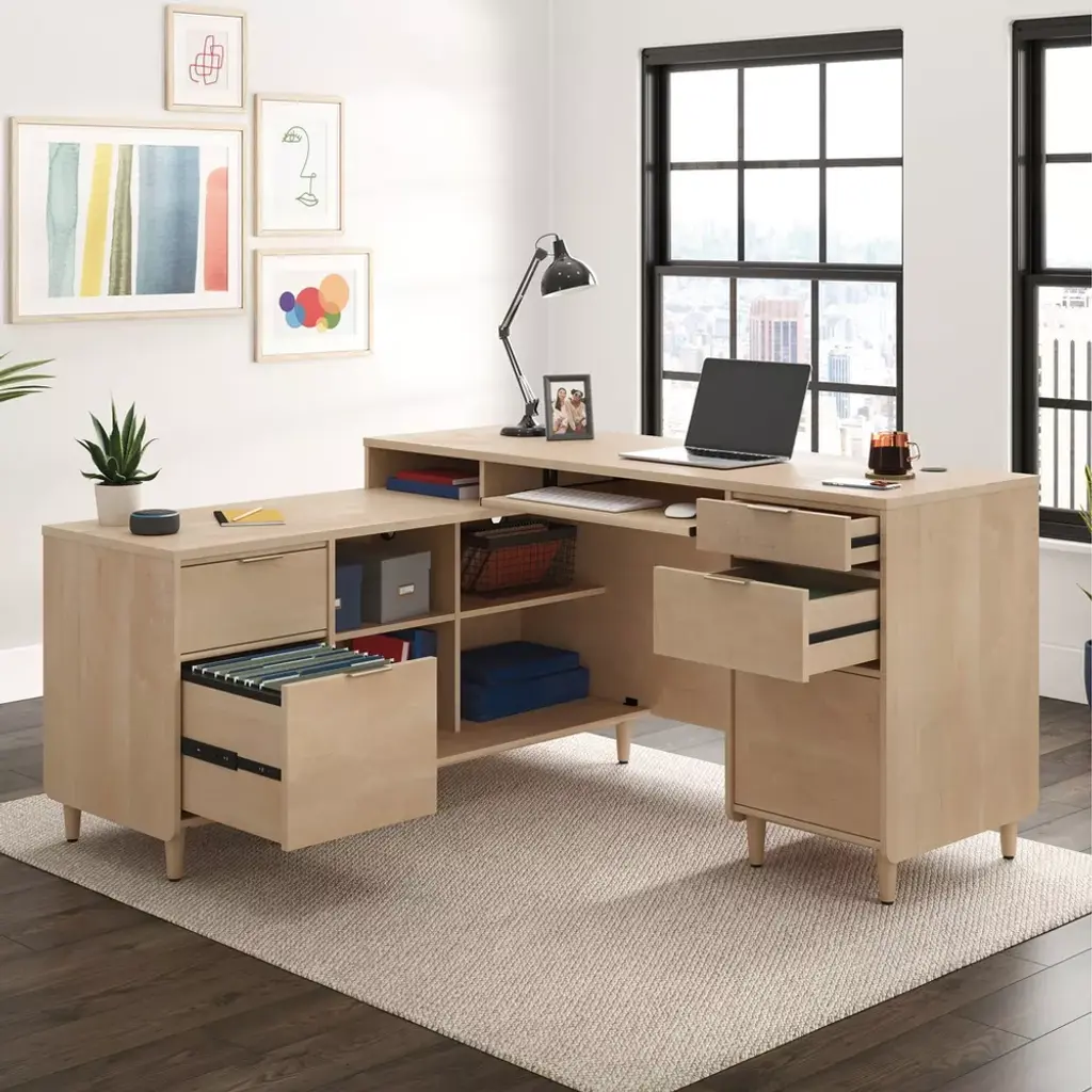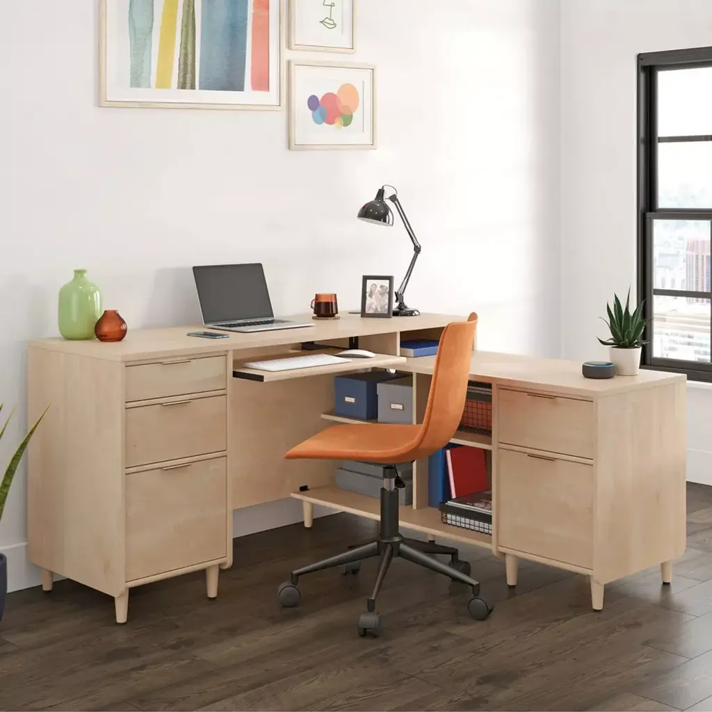 Give yourself the stylish workspace that the L-shaped desk with drawers from the Clifford Placecollection provides. Never run out of workspace – an L-shaped home office desk provides you with an abundance of tabletop space for all your office essentials like your laptop, important papers, notepads and much more! This home office desk features a slide out keyboard/mouse shelf that opens and closes on smooth metal runners. This L-shaped desk with storage includes three easy gliding standard drawers on metal runners, and two file drawers with full extension slides that accommodate letter-size hanging files. Cubbyhole storage allows for easy access and placement of books, bins and folders. The multiple grommet holes and pass-throughs allow you to keep all your cords and wires neat and out of the way. For versatility and ultimate customization, the return can be fastened to the left or right side to fit the needs of any room in your home. Finished on all sides in Natural Maple and accented with solid wood feet, handsome mid-century modern desks, like this one, will take your office space to a whole new leve
