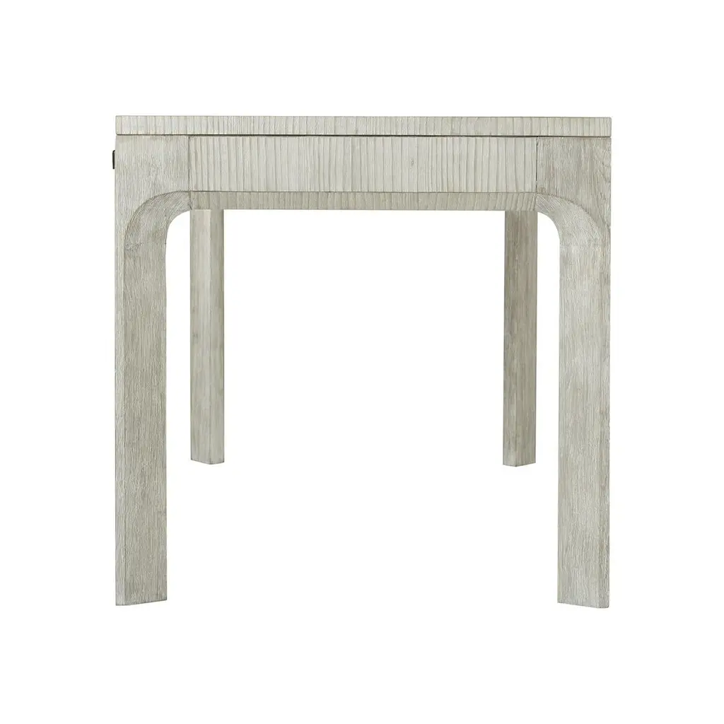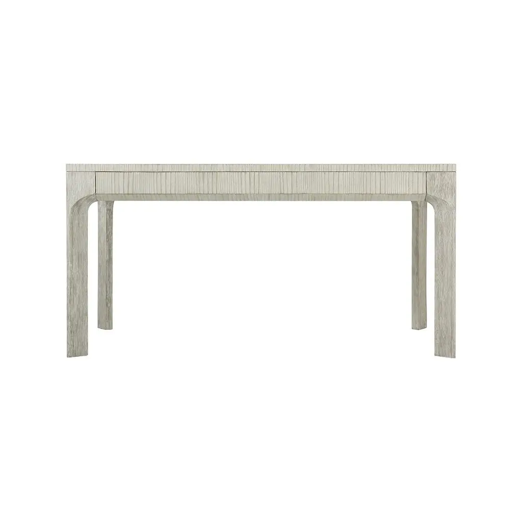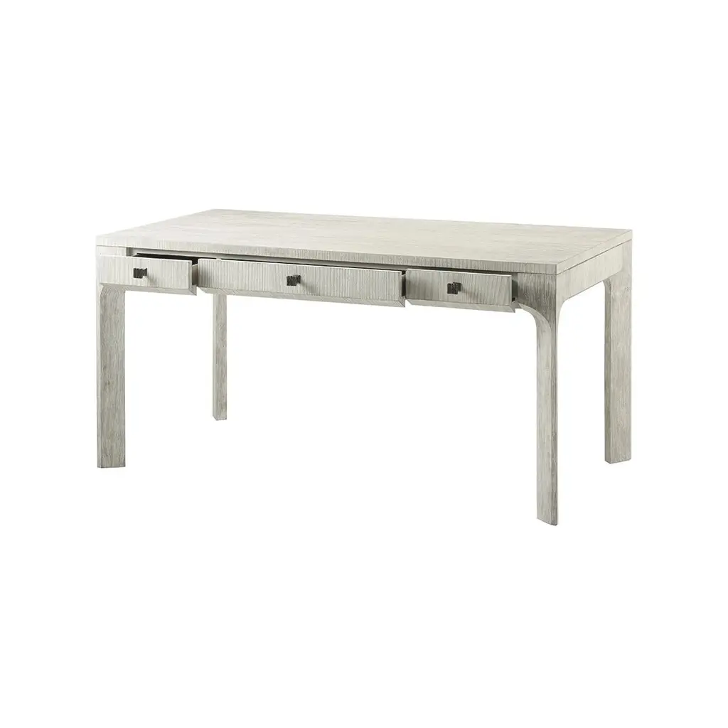 handcrafted wire-brushed cerused pine in a light and subdued Sea Salt finish, the desk displays three functional drawers with organic ribbed metal knobs in our Dark Sterling finish and a beveled-shaped cross-section.Dimensions: 60" W x 30" D x 30" H