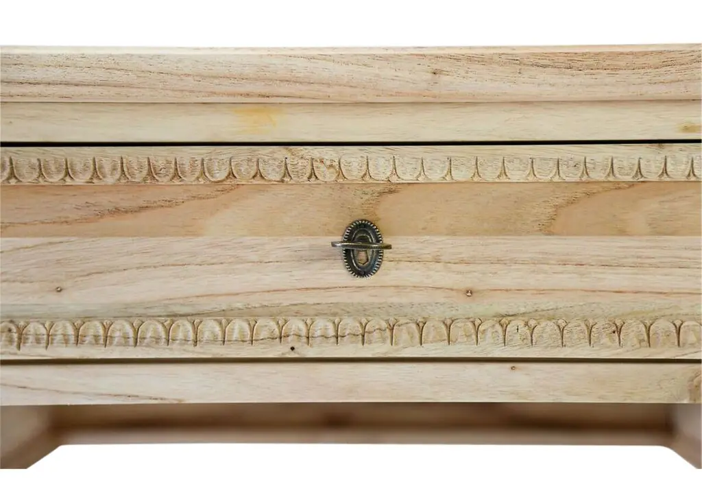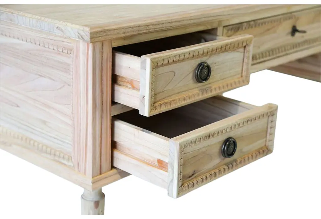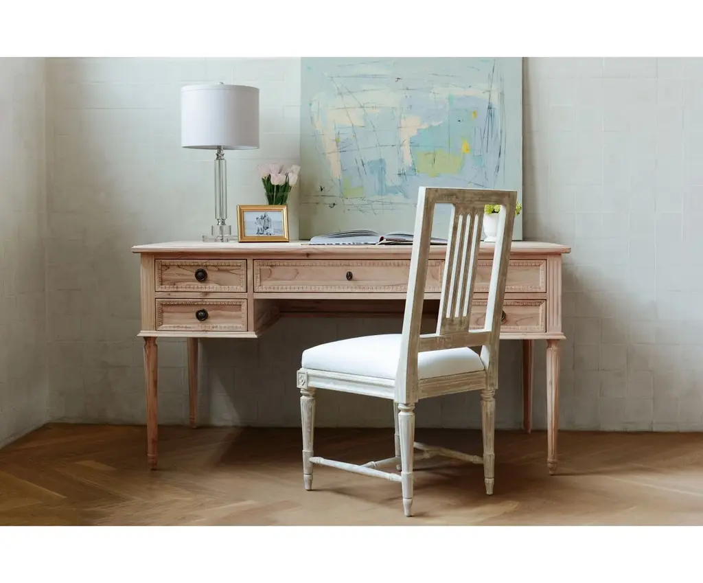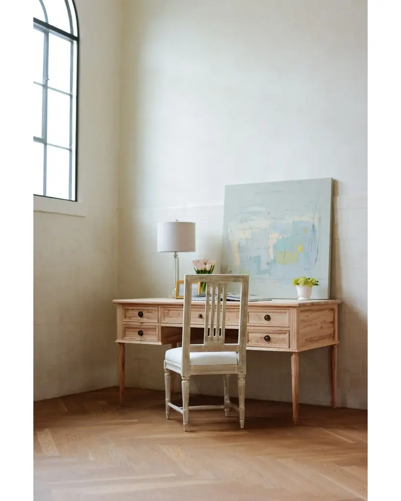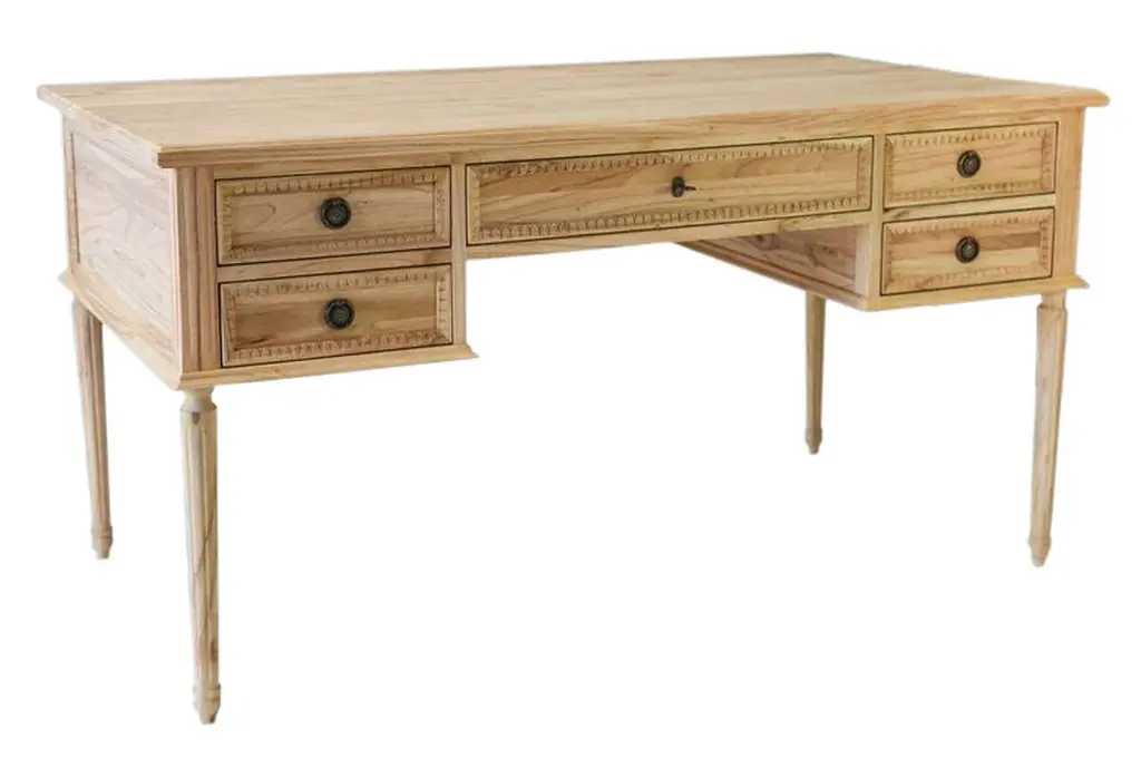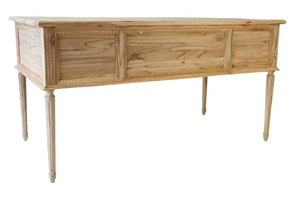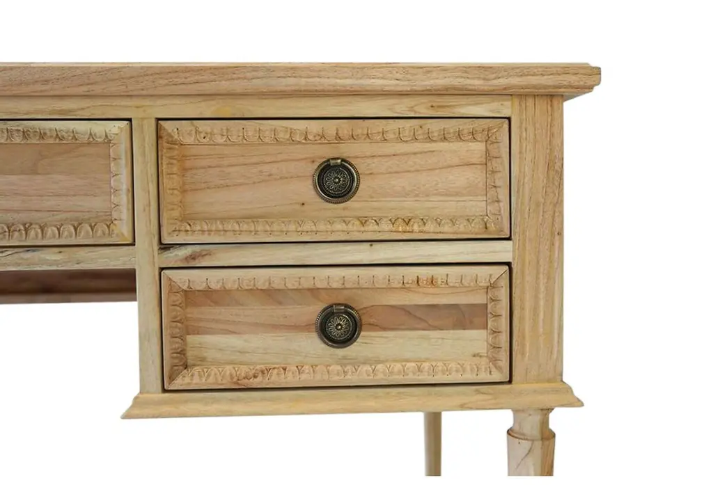 Masterfully carved of mindi wood, this four-drawer desk radiates Louis XVI-inspired allure with ballerina legs, hinged brasses, and a fluted frieze. We love how the wood shows off a swirling, organic grain.