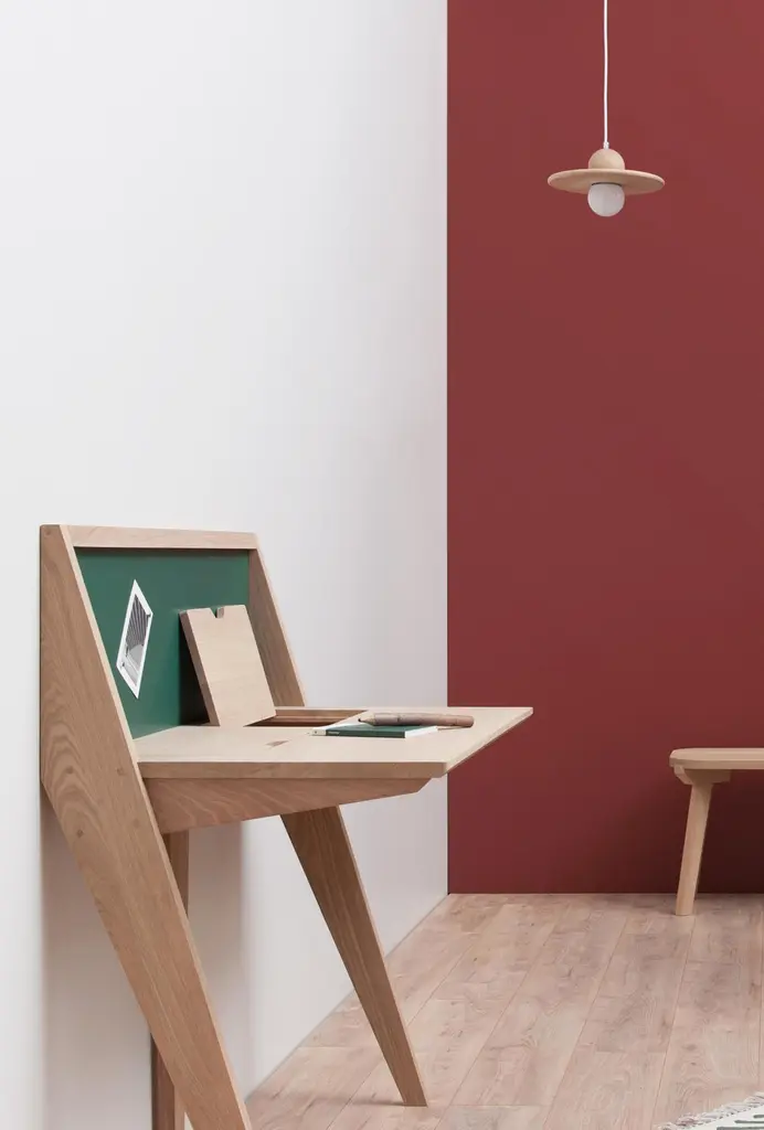 Leaning against the wall, the COMPAS desk is ideal for small places. Simple lines, original design and still so functional: 2 removable flaps giving access to storage space for computer tablets, paper, pencils. It features also a USB port and a magnetic space to hang cards and documents.The colours of the back and the flaps can be customized (see our range of colours). Supplied with a USB port, a power cord and a wall fixing bar. Solid French oak, except for the back in veneered oak. Made in Anjou (France).