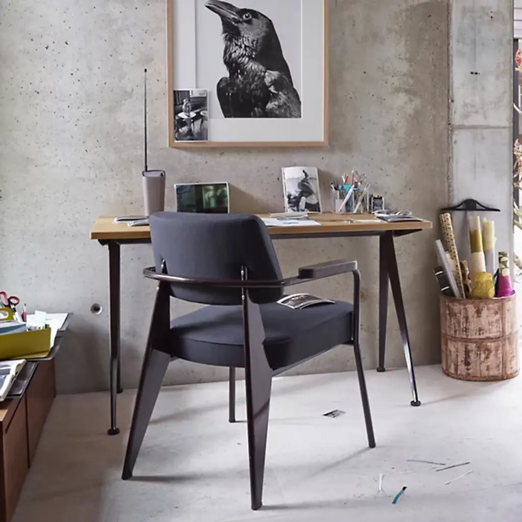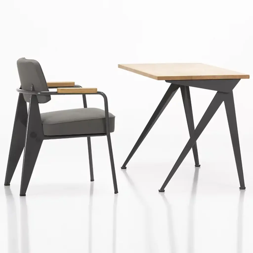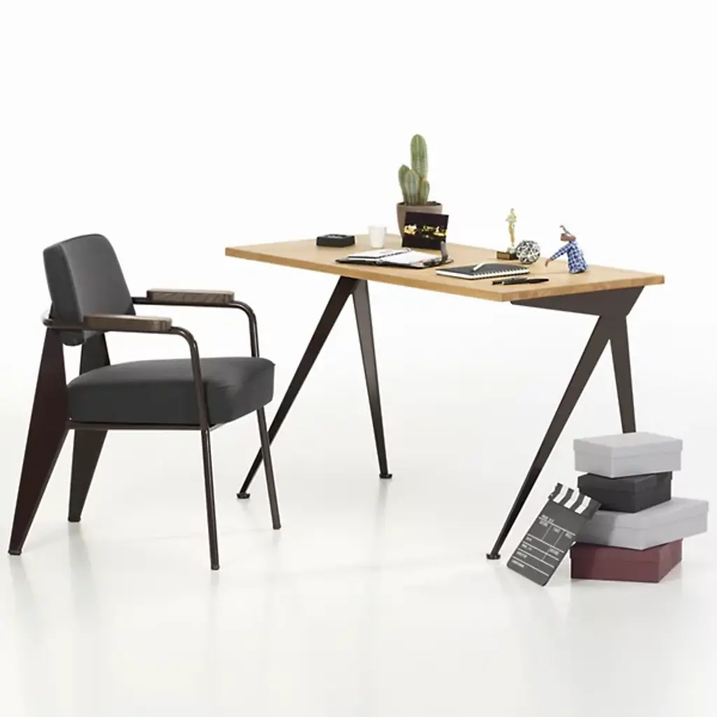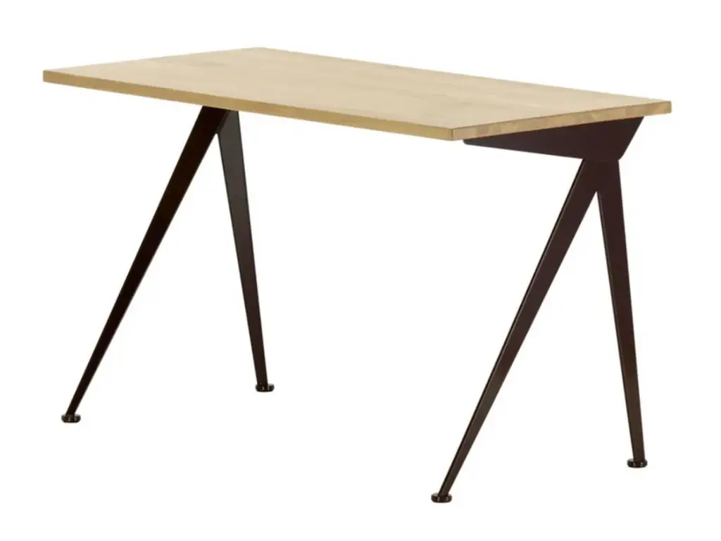 Designed by Jean Prouve in 1953, the Vitra Compas Direction Desk is architecturally intriguing and minimalist at the same time. The slim splayed legs are evocative of the points on a compass (or "compas," in French). The compact solid wood top adds natural balance to the industrial molded sheet steel legs while still maintaining the overall clean-lined look.