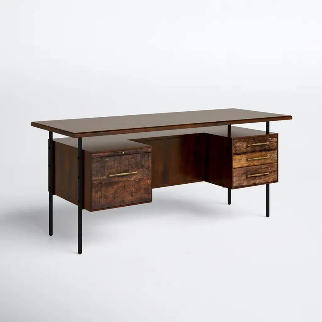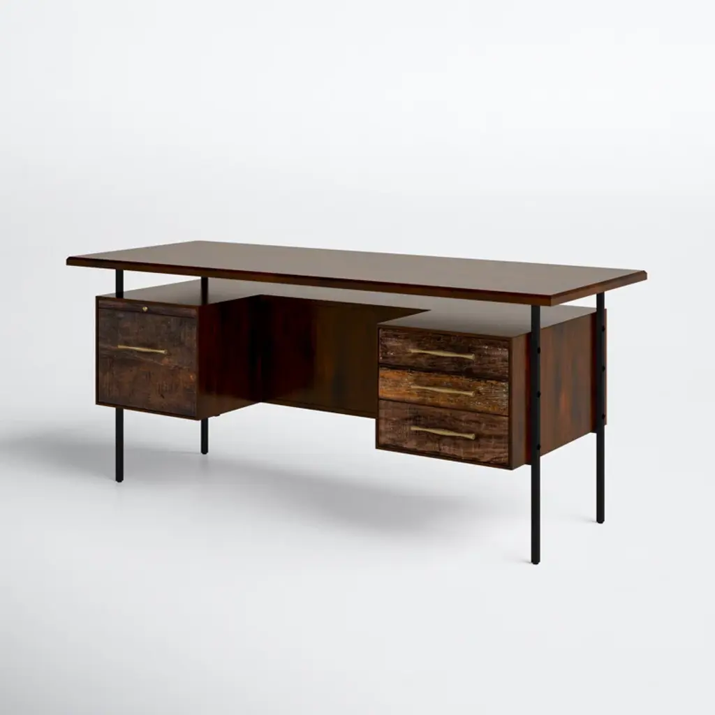 This mid-century-inspired lawyer's desk offers heavy-duty storage with two-sided cabinetry. A floating top and simple iron legs keep the look light and modern. Solid guanacaste case with reclaimed Peroba wood door- and drawer fronts.