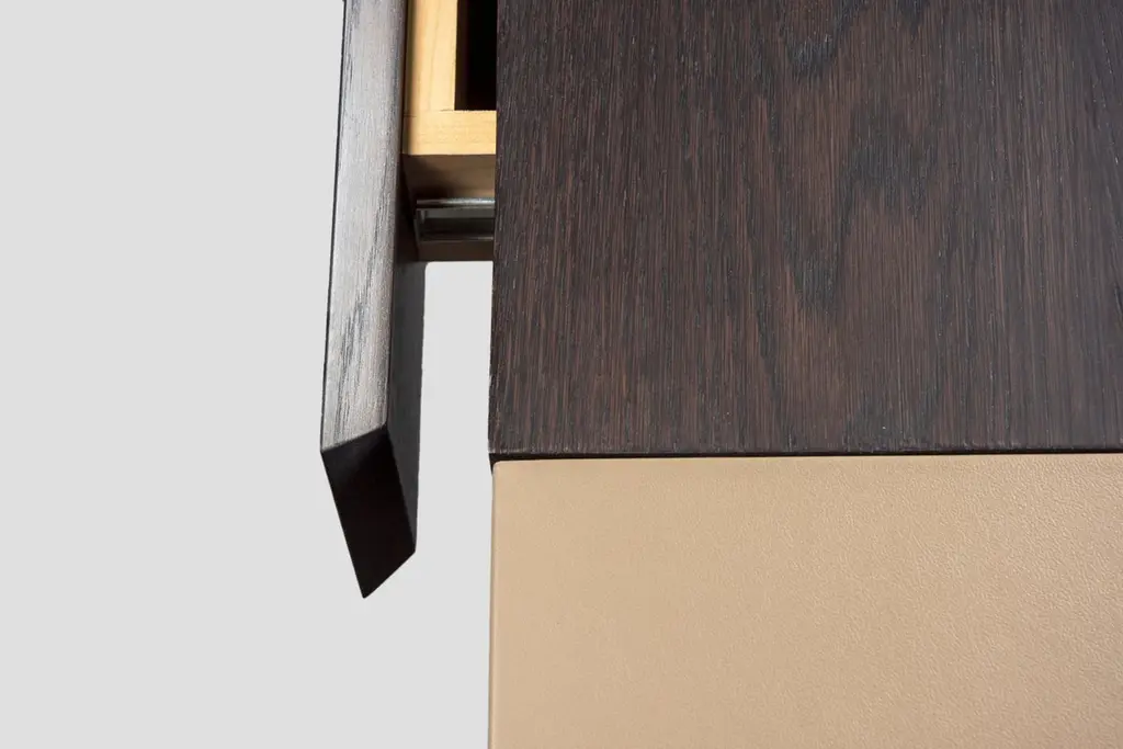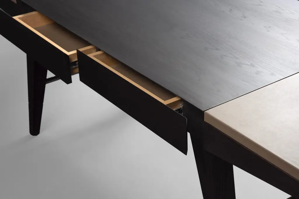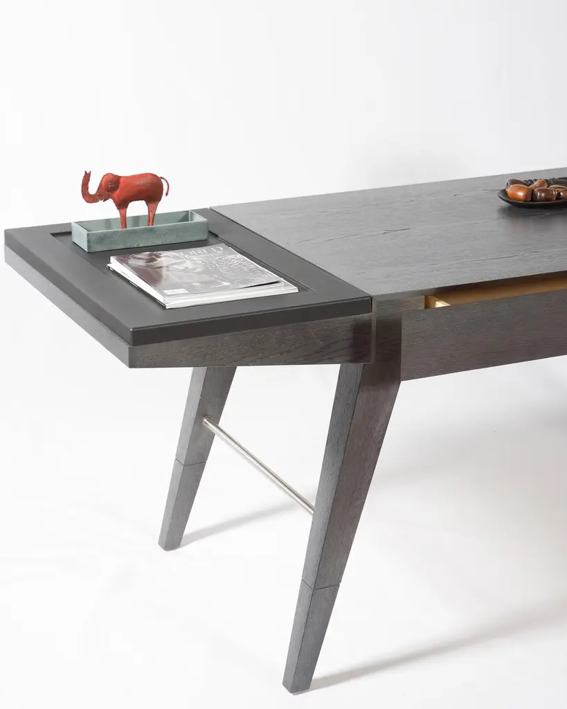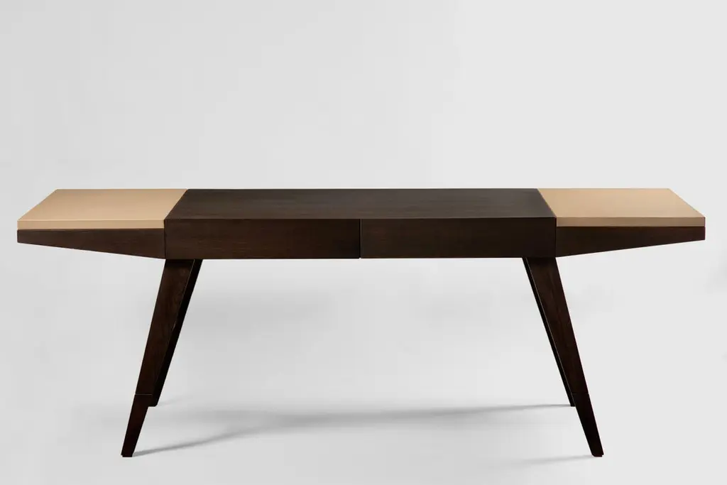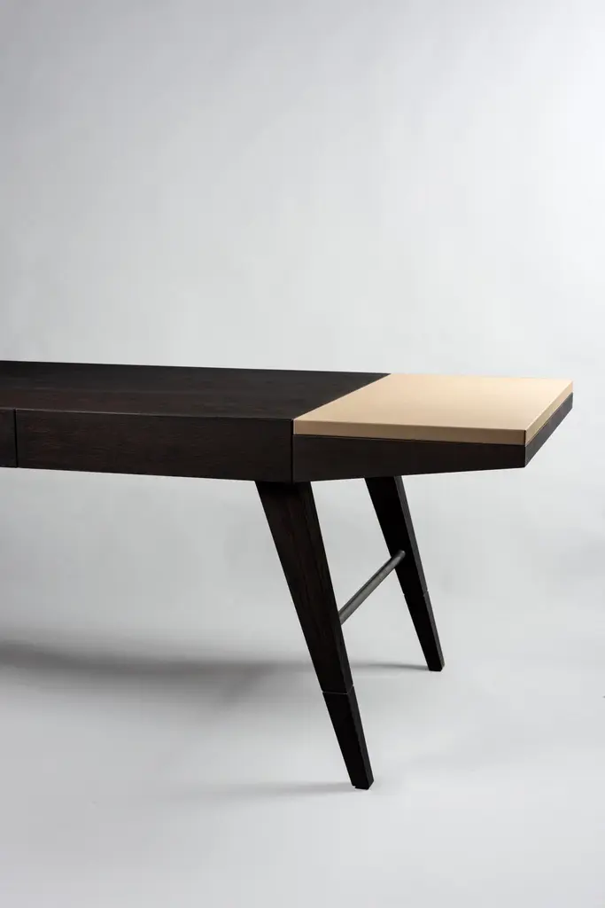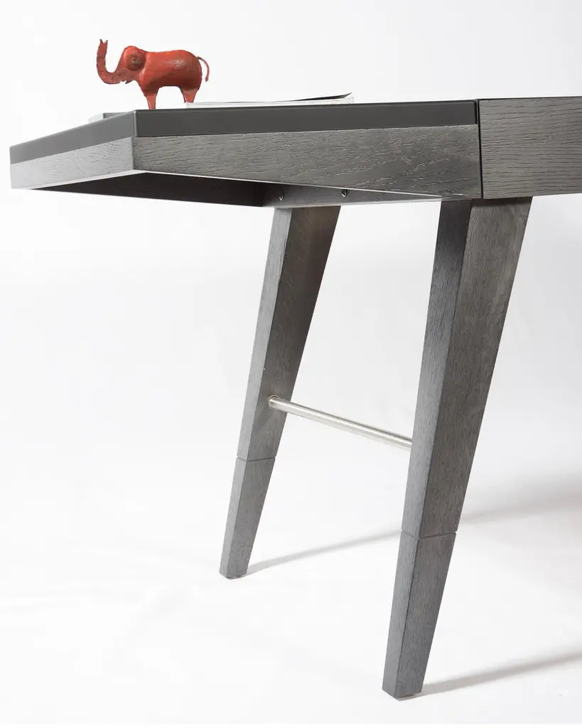 Constantine writing desk from Blackbarn bronze age collection by Mark Zeff, oak stand with metal and leather side panels.Bronze Age collection by Mark ZeffBronze Age is a furniture collection designed by Mark Zeff. Zeff takes inspiration from his favorite designers from Art Deco and 1940s French Modernism, using bronze as the main material to form the foundation of this collection. The pieces are handsome and masculine, handcrafted in USA by the finest craftsmen using exquisite leathers.