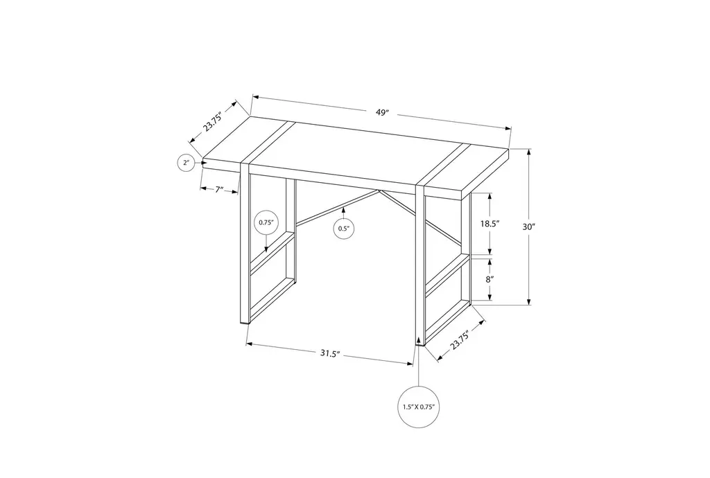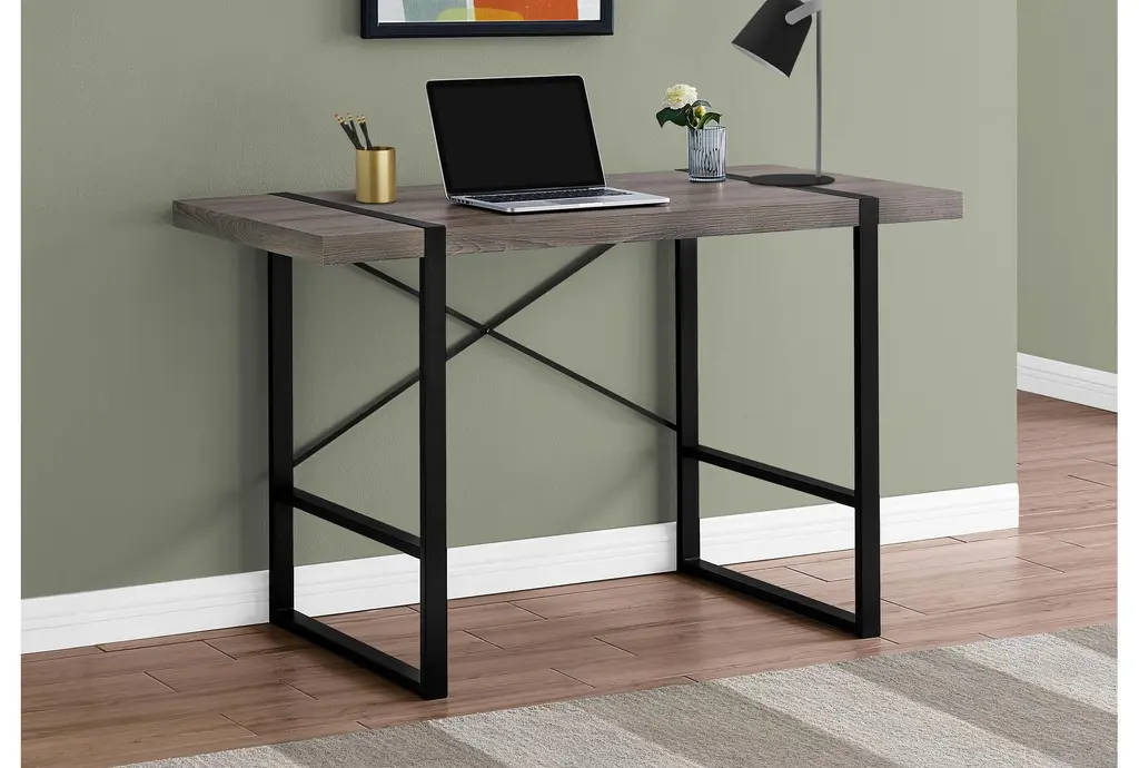 The Contempo Modern Brown 49" Computer Writing Desk is a stylish and functional addition to any home office. With its industrial-inspired design, this desk features a thick-panel desktop in a dark taupe wood-look finish, complemented by robust metal legs in a black finish. The X-shaped metal bar on the back provides additional support and a decorative touch, making this desk both practical and visually appealing.