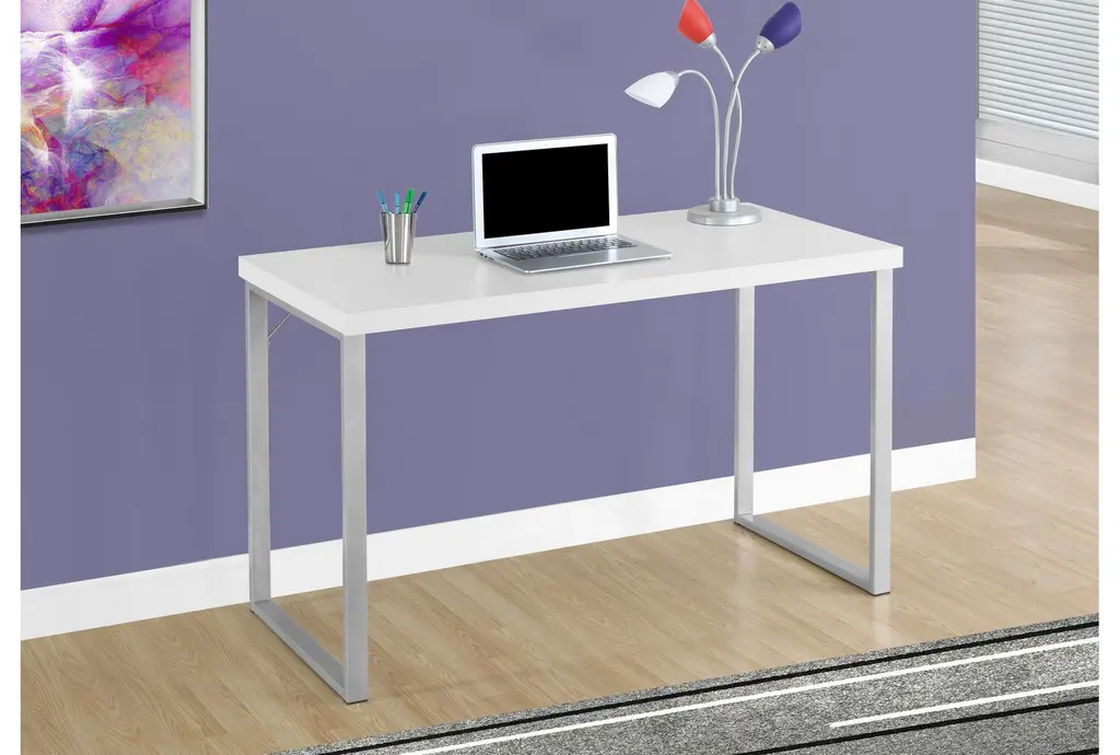 The Contempo Modern White 47" Computer Writing Desk is a perfect blend of style and functionality, ideal for any modern workspace. Its sleek white finish and contemporary design make it a versatile addition to small homes, apartments, condos, or dorm rooms. Crafted from high-quality materials, this desk ensures durability and ample workspace for your laptop, lamp, and writing materials.