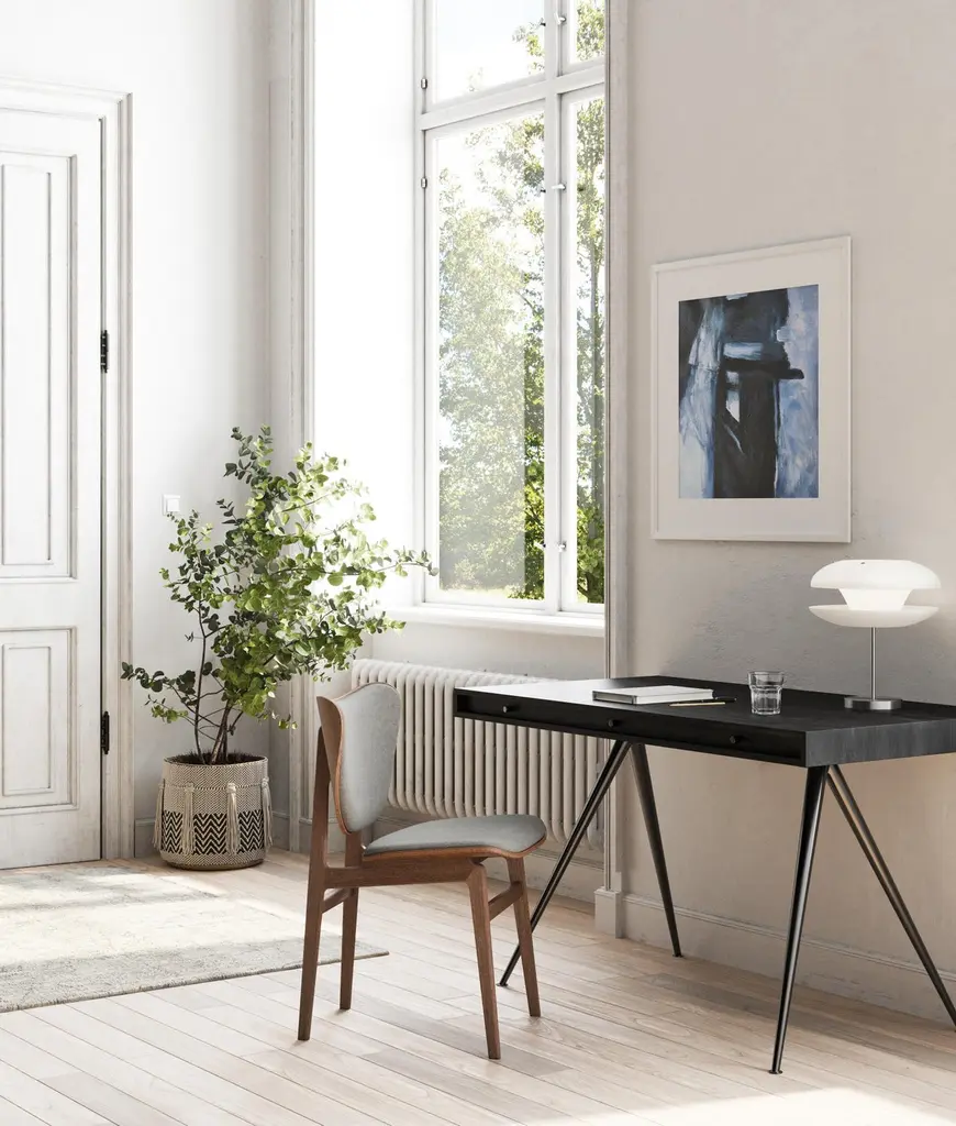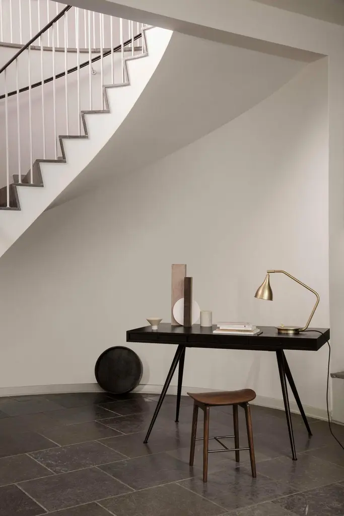 'JFK' Home DeskSigned by Kristian Sofus Hansen & Tommy Hyldahl for NORR11Dimensions: H. 76 cm x W. 130 cm x D. 65 cm Model shown: Black Ash Wood Aluminium legs in matte black finish_________________With its pure and simplistic design, the 60s inspired JFK Desk is designed for the stylish home office. The desk has a slim table top of ash with three inbuilt drawers and a hidden space for a powerbank, making it easy to power a laptop, table lamp or smartphones. The tabletop is made of FSC certifed ash. Coated with water-based clear lacquer. The table legs are made of aluminium and has a matte black powder coating. Each table leg has a felt glide underneath. NORR11 is a design company founded in 2011 with a vision to continously create design that sparks curiosity. They are driven by the desire to challenge boundaries and barriers between time periods, design directions, cultures and materials. They believe in creating pieces with character, balancing form, function and comfort.