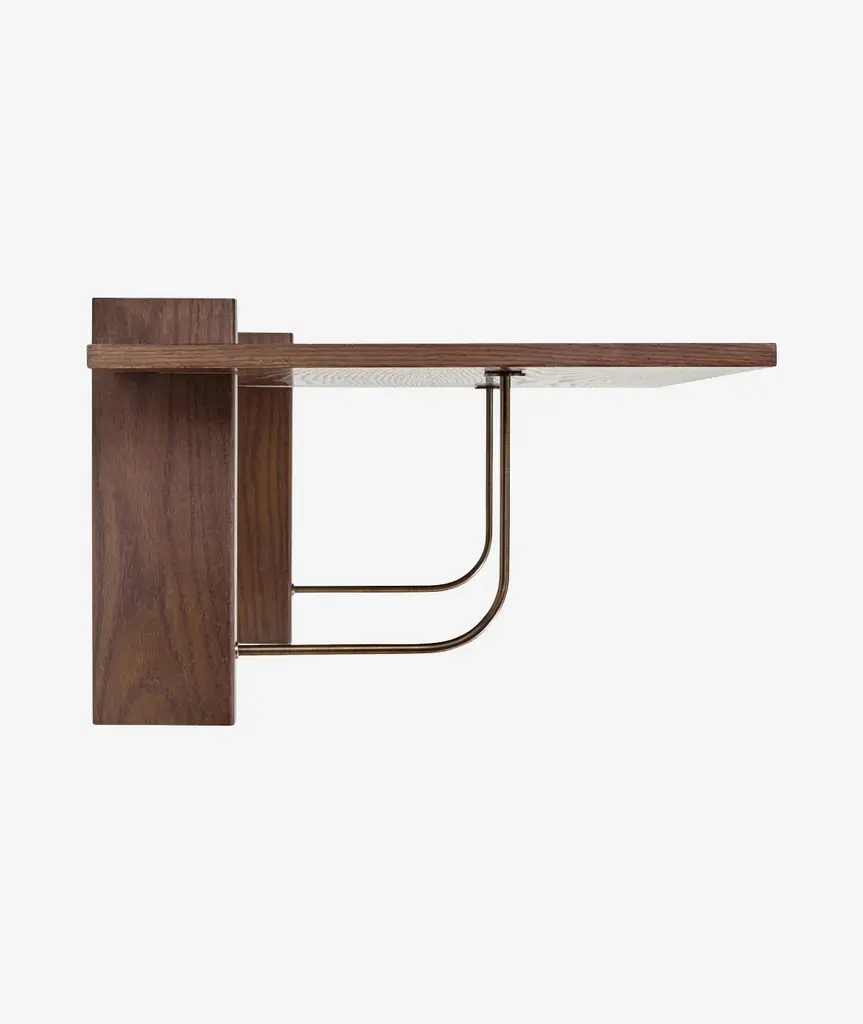 Designed to seamlessly transition into home settings, catering to remote work and the need for stylish yet functional home office furniture, the Corbel Wall Desk delivers a flexible, space-saving solution particularly beneficial for smaller spaces. The shelf takes its name and design cues from architectural weight-bearing brackets traditionally made from stone or wood. This inspiration infuses the design with a sense of structural elegance. Designed with a small distance to the wall for neat cord management, solid wood edges enhance the table top's durability, while the smooth linoleum desk surface contributes to a practical and professional workspace. The wall-mounted design can be paired with the series shelf to create a minimalist home office setup.