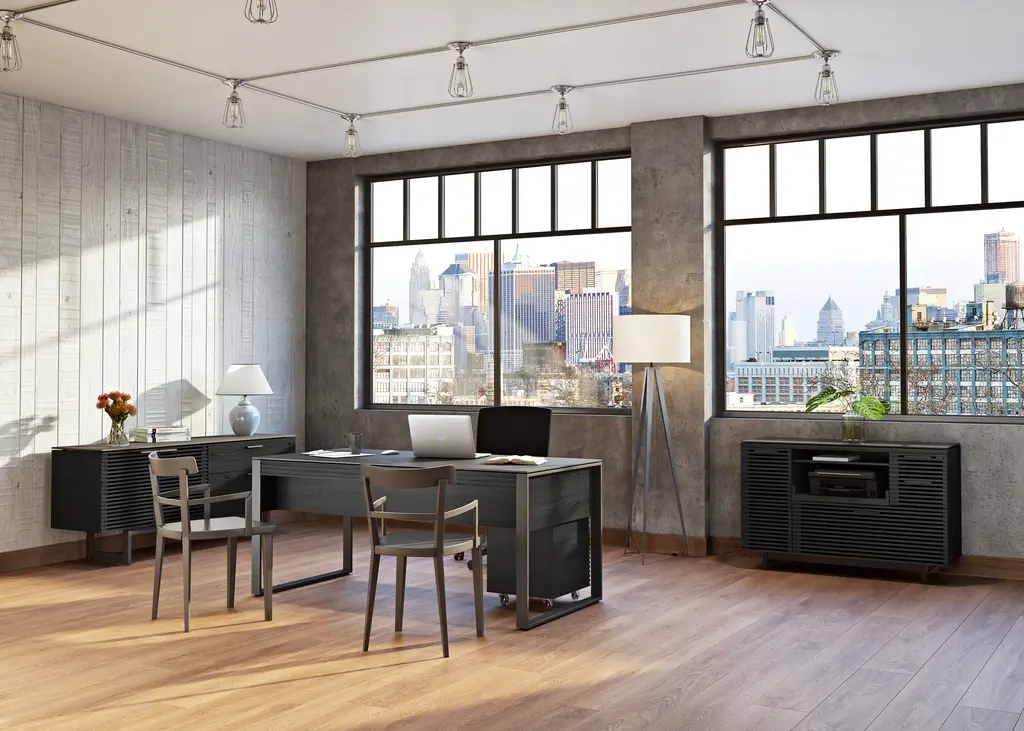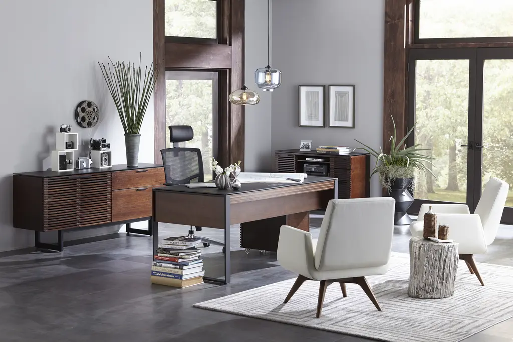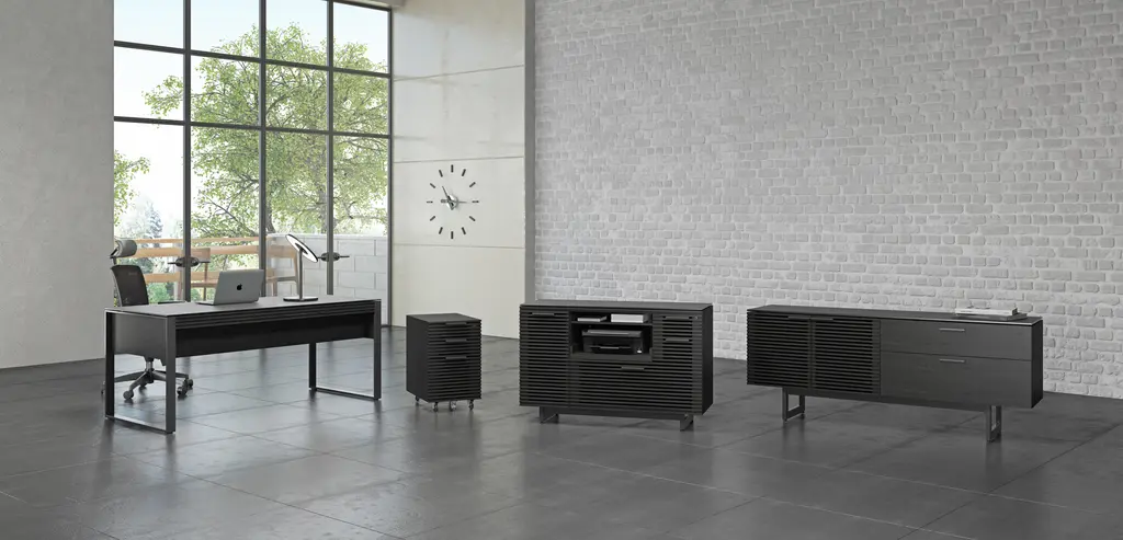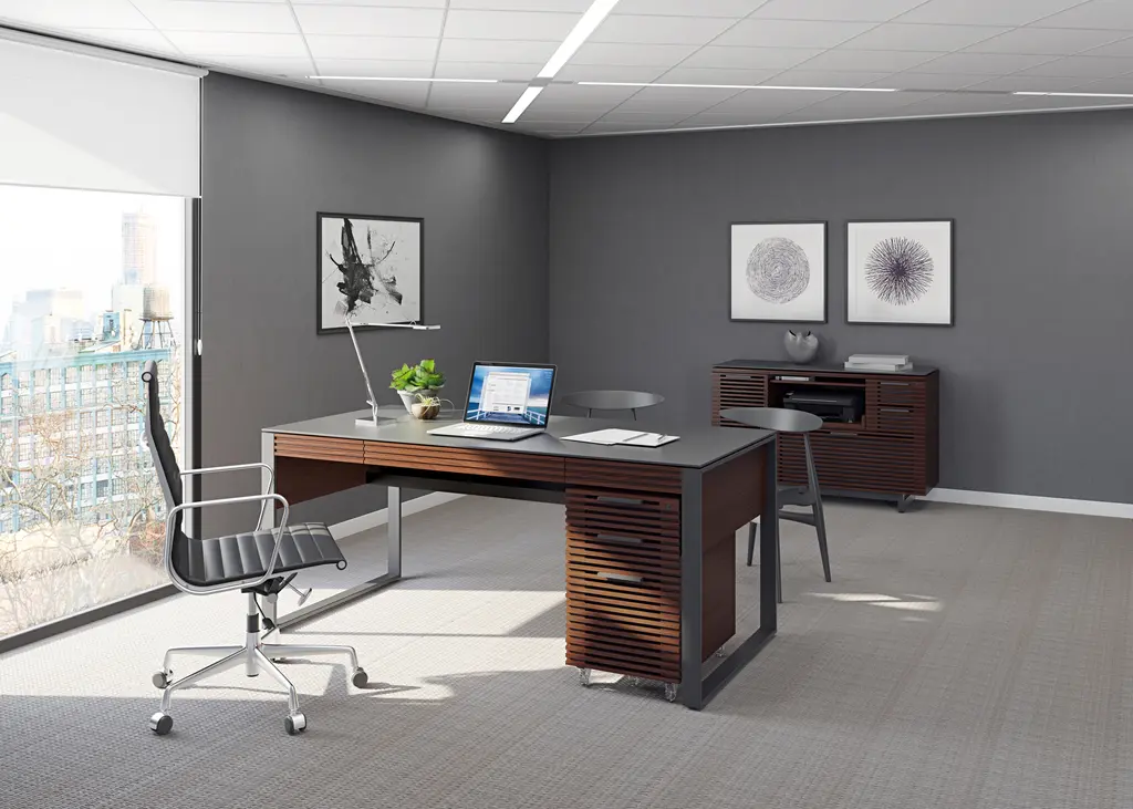 A thoughtfully composed workspace that includes a hidden flip-front keyboard drawer and a modesty panel for comfortable cross-desk collaboration. Enjoying your work environment makes any workday go more smoothly with the Corridor 6521 Executive Desk. The clean lines and refined styling of Corridor Office are not only pleasing to the eye, but are engineered to keep you organized, efficient and inspired. Executive Style The keystone of the Corridor Office collection, the impressive styling of the desk commands respect. Productivity at Hand The generously-sized keyboard drawer includes a rear storage area for recharging small devices; a flip-down front blends into the desk when not in use. Lined with non-slip material, contents stay secure while work stays comfortable. Satin-Etched Glass Desktop This highly durable tempered glass surface has an uniquely soft finish. Smooth to the touch, it provides protection from dings, scratches, and even fingerprints. MAKING BEAUTIFUL DESIGN PRACTICAL. For too long, people in the market for high-end home and office furniture have had to make a choice between pieces that are strikingly beautiful, but short on functionality, and pieces that are highly functional, but aesthetically not up to par. At BDI we’re eliminating the need to choose, by applying the principles of high-end modern and contemporary design to practical, everyday furniture use. Since 1984, we’ve been dedicated to creating uniquely functional, beautifully streamlined, and rigorously executed furniture. The features that we’ve made standard — including easily adjustable shelves, fingerprint-proof glass, hidden wheels, flow-through ventilation, and meticulously thought-out cord-management systems — are a result of our ongoing dedication to beautifully practical design.