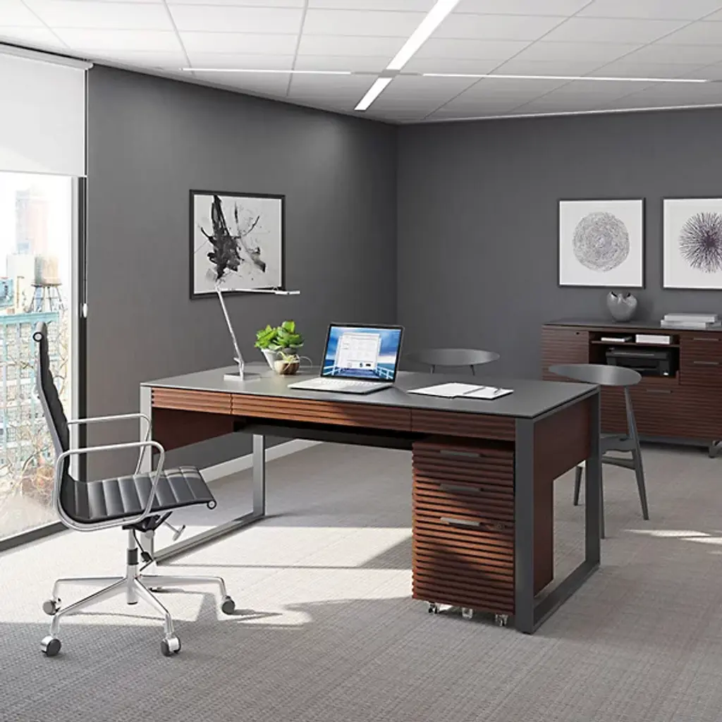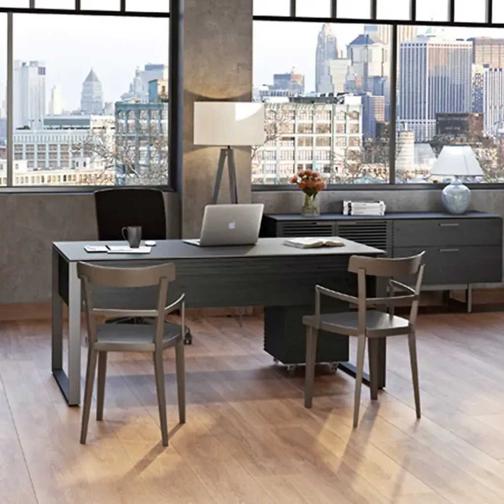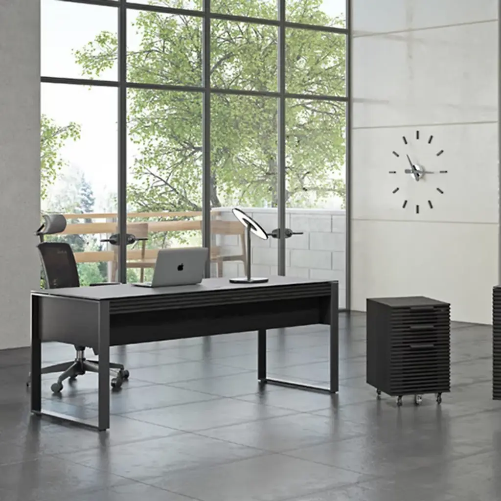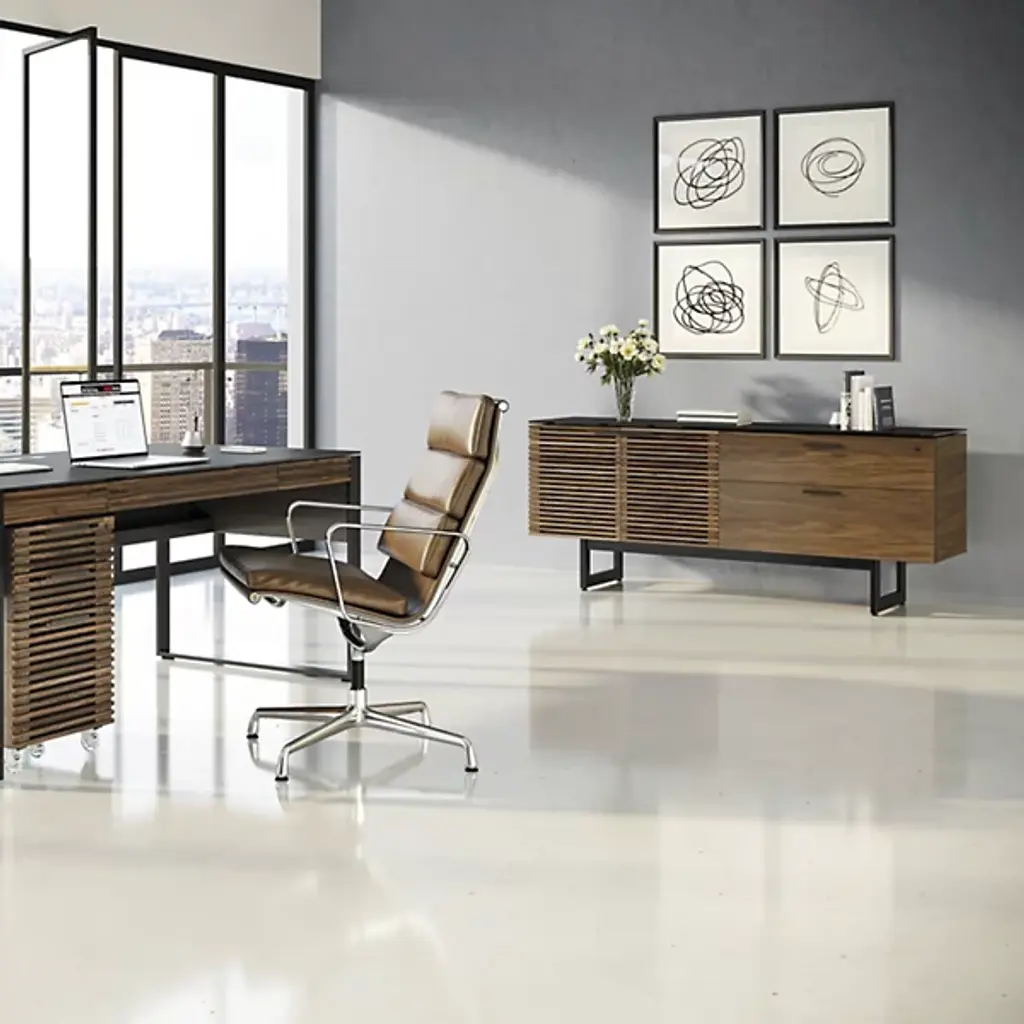 There is no place the Corridor collection cannot go, a fact now proven by the line of Corridor office furniture. The BDI Corridor Executive Desk is completely closed, but replicates the collection's signature open slats with a raised pattern on its wood drawers and back. A glare-free black Satin-Etched Tempered Glass top, multi-function keyboard tray and 2 storage drawers make the Corridor Executive Desk a pleasure to use.