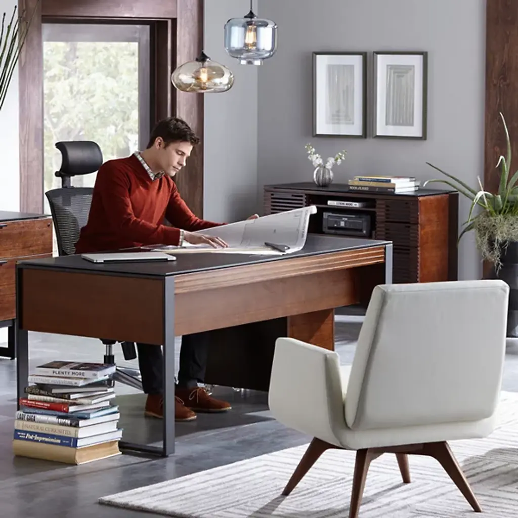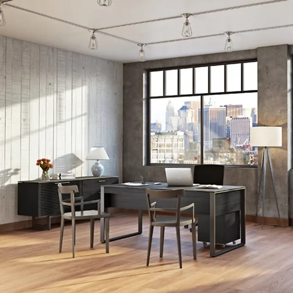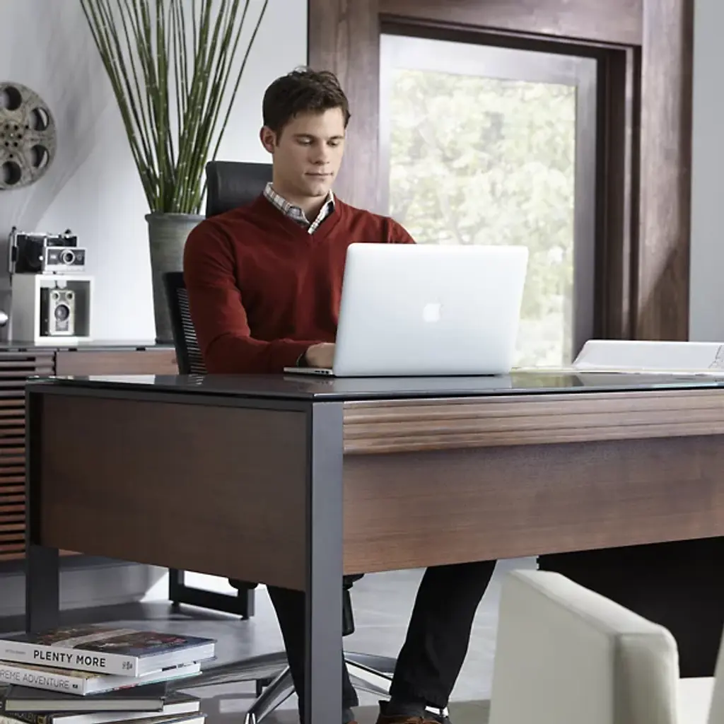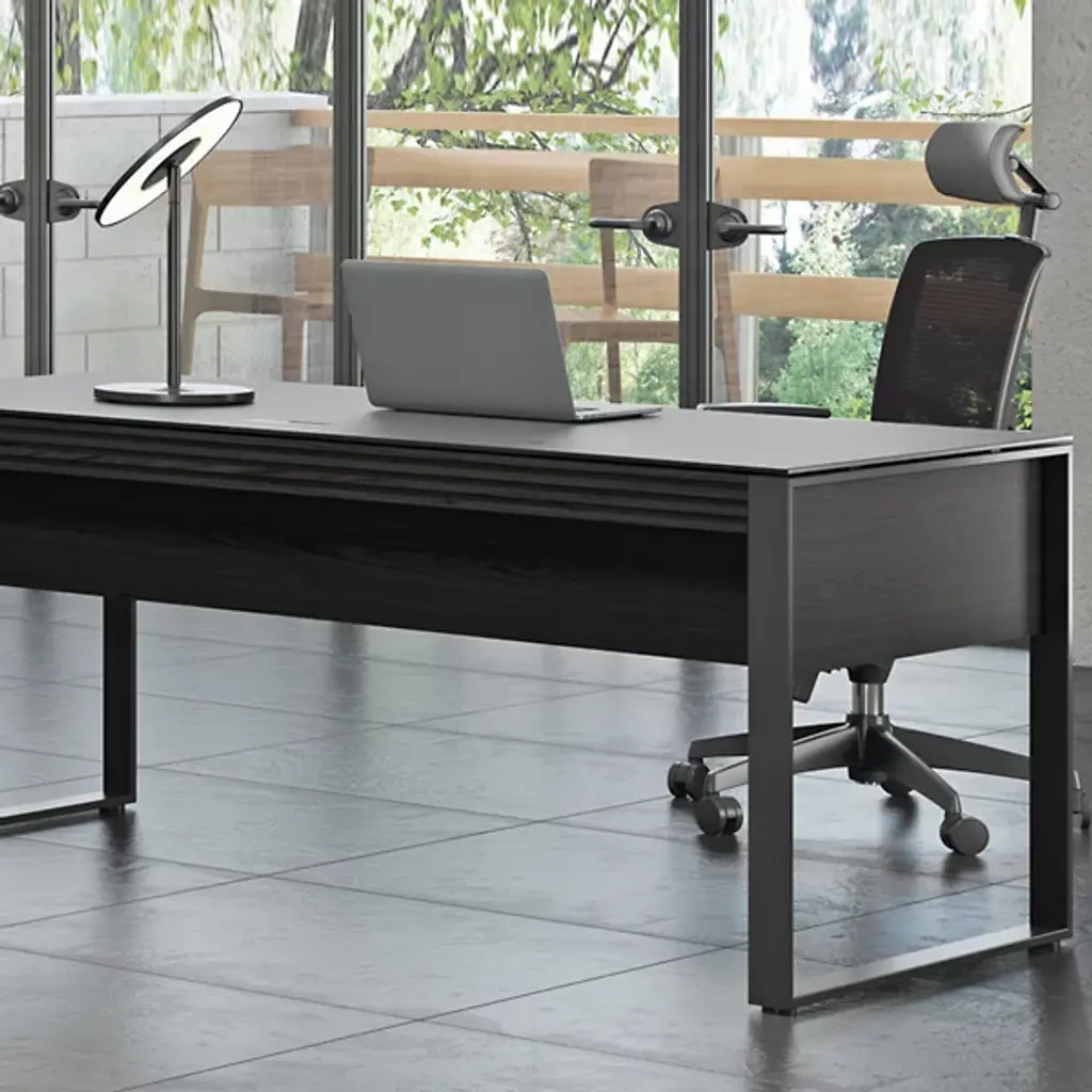 There is no place the Corridor collection cannot go, a fact now proven by the line of Corridor office furniture. The BDI Corridor Executive Desk is completely closed, but replicates the collection's signature open slats with a raised pattern on its wood drawers and back. A glare-free black Satin-Etched Tempered Glass top, multi-function keyboard tray and 2 storage drawers make the Corridor Executive Desk a pleasure to use.