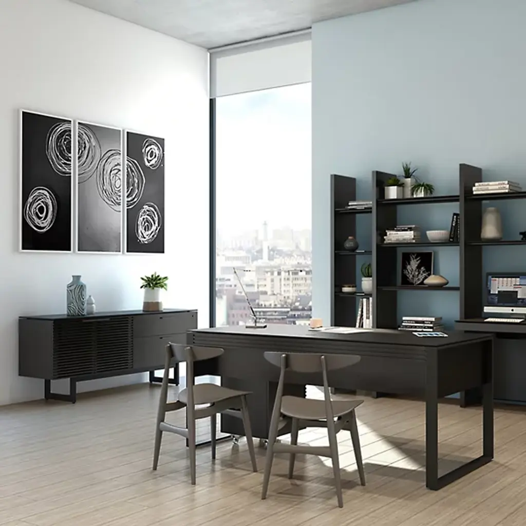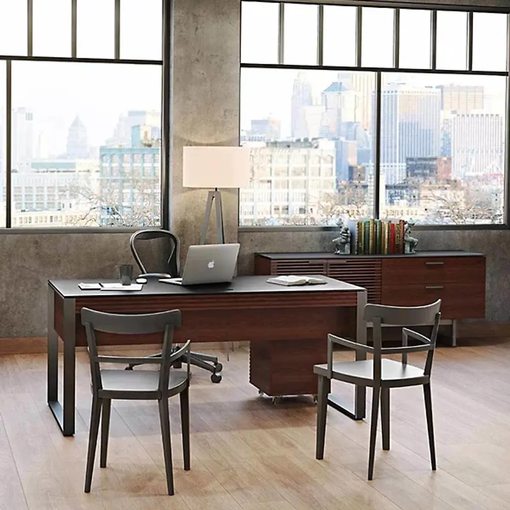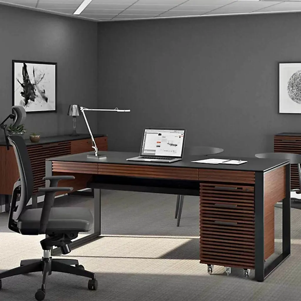 There is no place the Corridor collection cannot go, a fact now proven by the line of Corridor office furniture. The BDI Corridor Executive Desk is completely closed, but replicates the collection's signature open slats with a raised pattern on its wood drawers and back. A glare-free black Satin-Etched Tempered Glass top, multi-function keyboard tray and 2 storage drawers make the Corridor Executive Desk a pleasure to use.