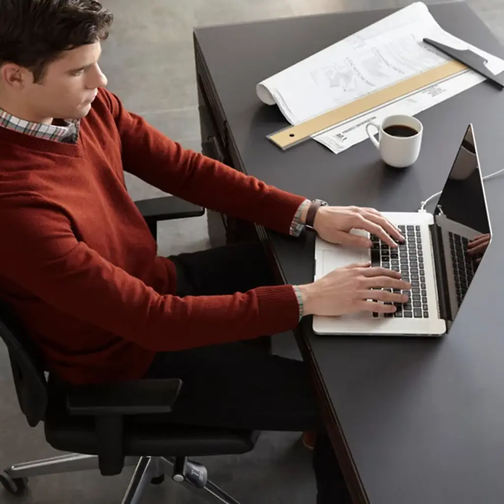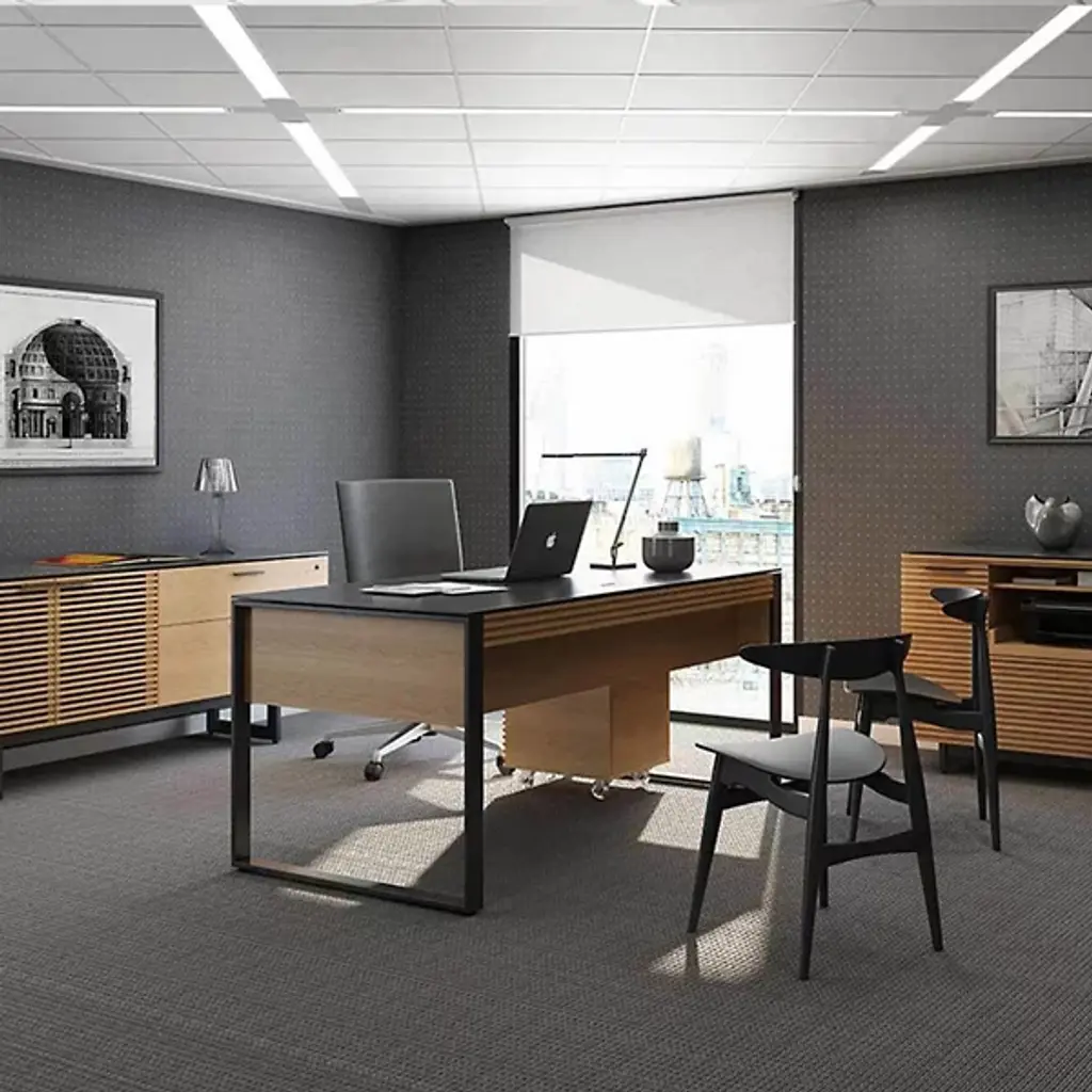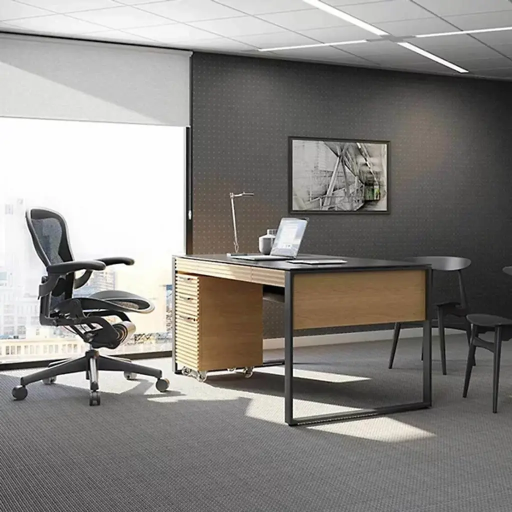 There is no place the Corridor collection cannot go, a fact now proven by the line of Corridor office furniture. The BDI Corridor Executive Desk is completely closed, but replicates the collection's signature open slats with a raised pattern on its wood drawers and back. A glare-free black Satin-Etched Tempered Glass top, multi-function keyboard tray and 2 storage drawers make the Corridor Executive Desk a pleasure to use.