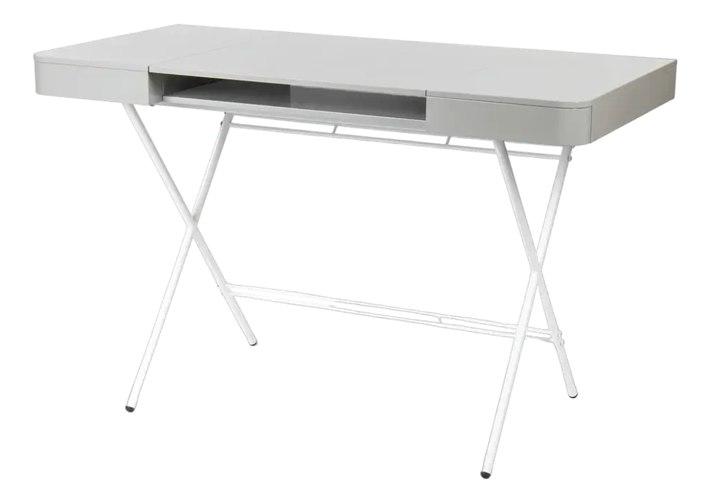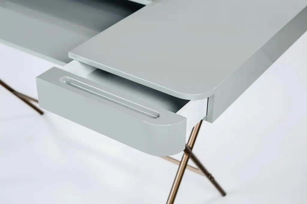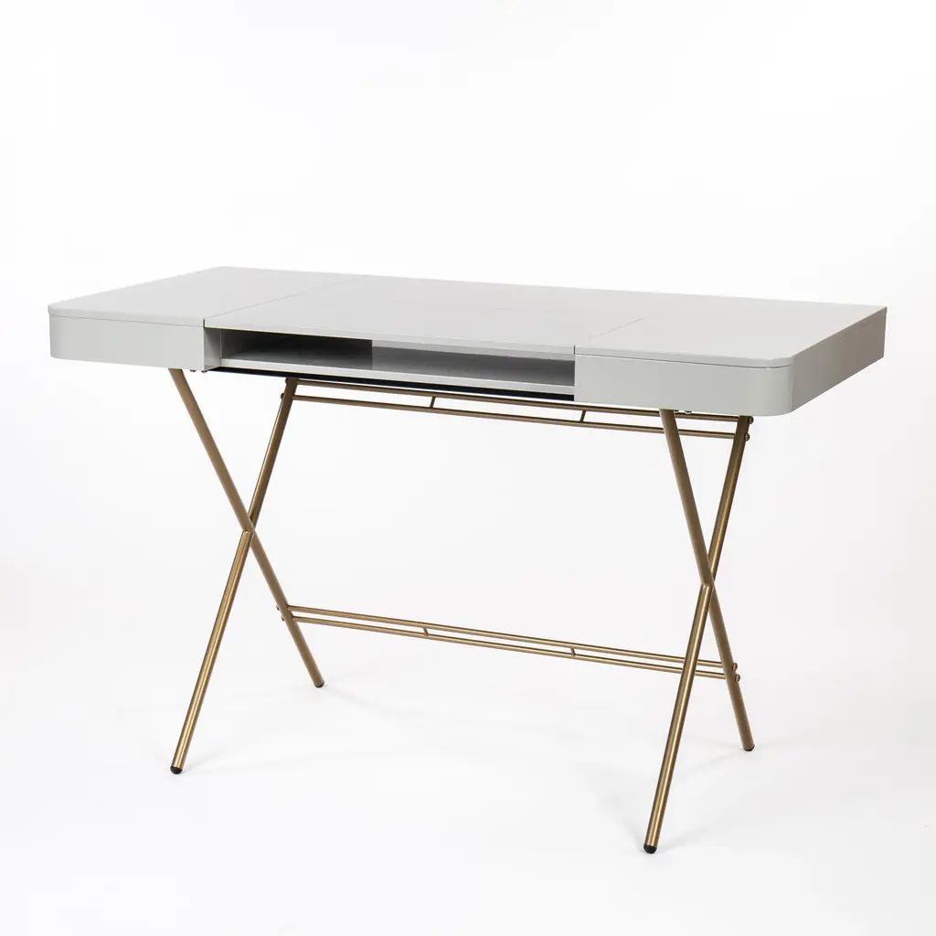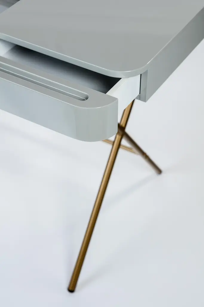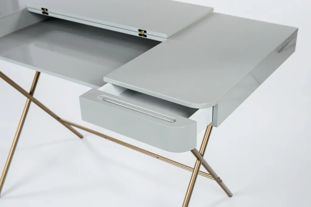 The Cosimo desk was designed by the architect Marco Zanuso Jr. in 2017 for luxury French furniture brand, Adentro Paris. The central panel of the desktop folds back to reveal a hidden shelf below, and integrated drawers on either side provide ample storage space. Its frame brings lightness and elegance. Ideal for a contemporary home office space, the Cosimo desk comes in various finishes. The top desk finish of this version is made of grey glossy lacquered MDF and it features slim crossed legs with a gold metal lacquer.