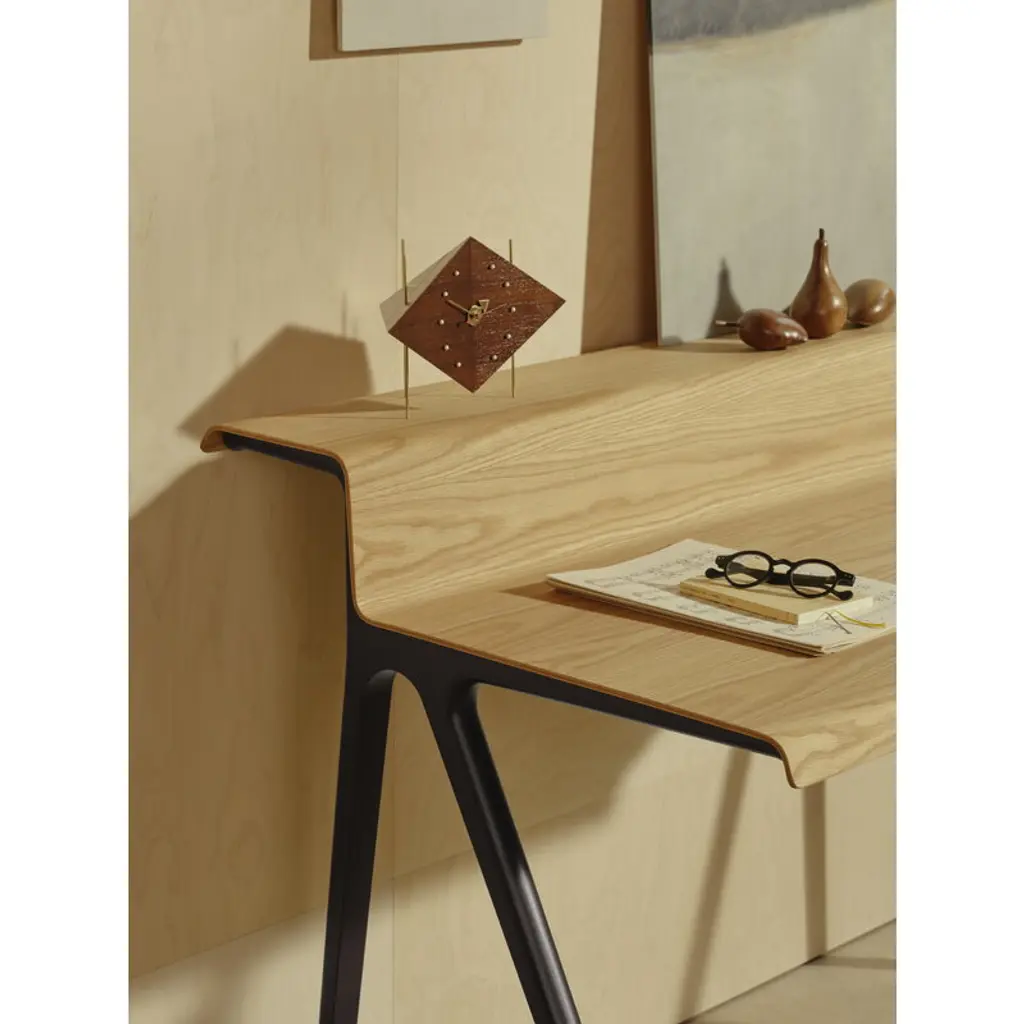Vitra's Courier desk is a minimalist workstation created by French designer Ronan Bouroullec, featuring a curved oak veneer top and slender aluminum legs with softly rounded lines. Also known for his work as a visual artist, Bouroullec has given the desk a light, flowing shape reminiscent of a line drawn with a Japanese felt-tip brush. The side profile of the desk brings to mind a serif – the small decorative strokes found at the ends of classic typefaces. This reference is echoed in the desk's name, as Courier is one of the most iconic serif fonts. Despite its extremely pared-down appearance, the Courier desk offers ample surface space, adorned with subtle wood grain patterns and complemented by a raised back edge. There's room for all the essentials – a computer, monitor, desk lamp, stack of books, and perhaps a small houseplant or a framed photo. If you need additional storage, you can place a stylish stationery organizer or a small drawer unit on top of the desk.
