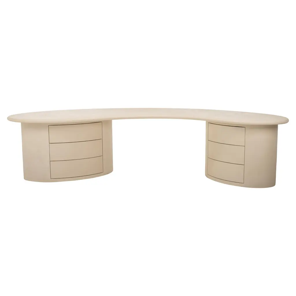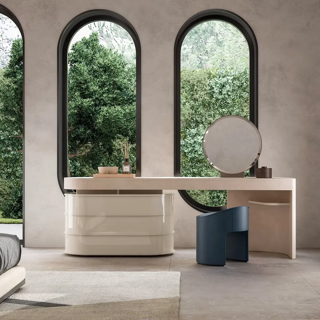 In the design of this vanity desk, all the corners and the edges got round and beveled for receiving the light’s sapient game, for inspiring calm and serenity, and for stimulating social relations and conviviality. The shape is also essence: the usage of smooth lines, colors, and materials benefits our mind gifting us with personal spaces which can grant wellness to us and to the people we care about. Glossy lacquered structure. Top and side covered with leather.