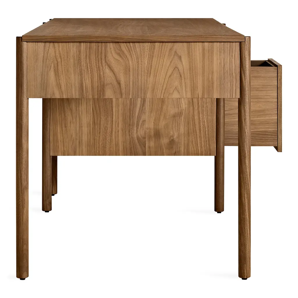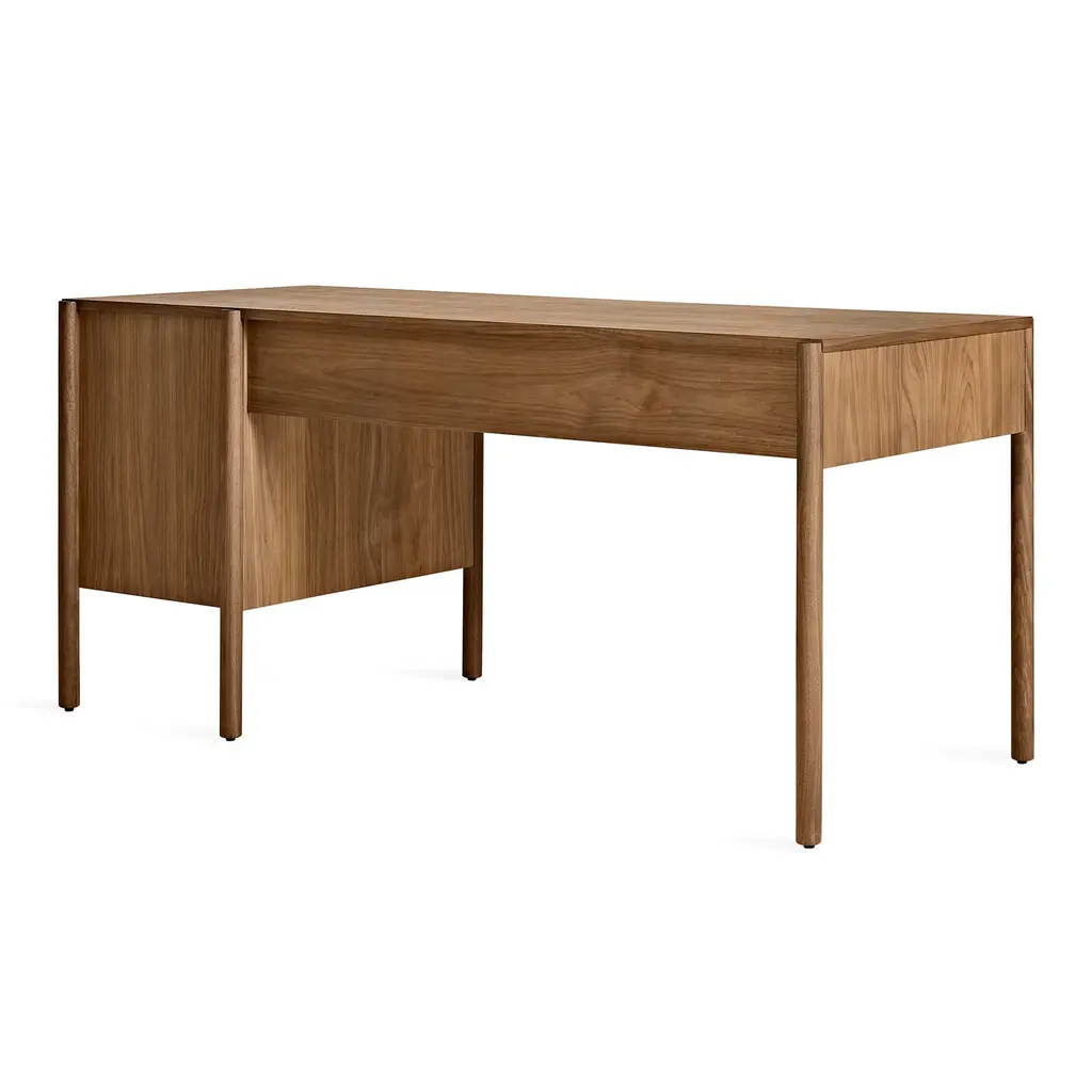 Warm wood pairs with slim dowel legs to create a sophisticated desk that’s up to any task. Two semi-cantilevered drawers keep office organization top priority. Round cutouts act as pulls and eliminate visual clutter while giving a nod to the leg shape.