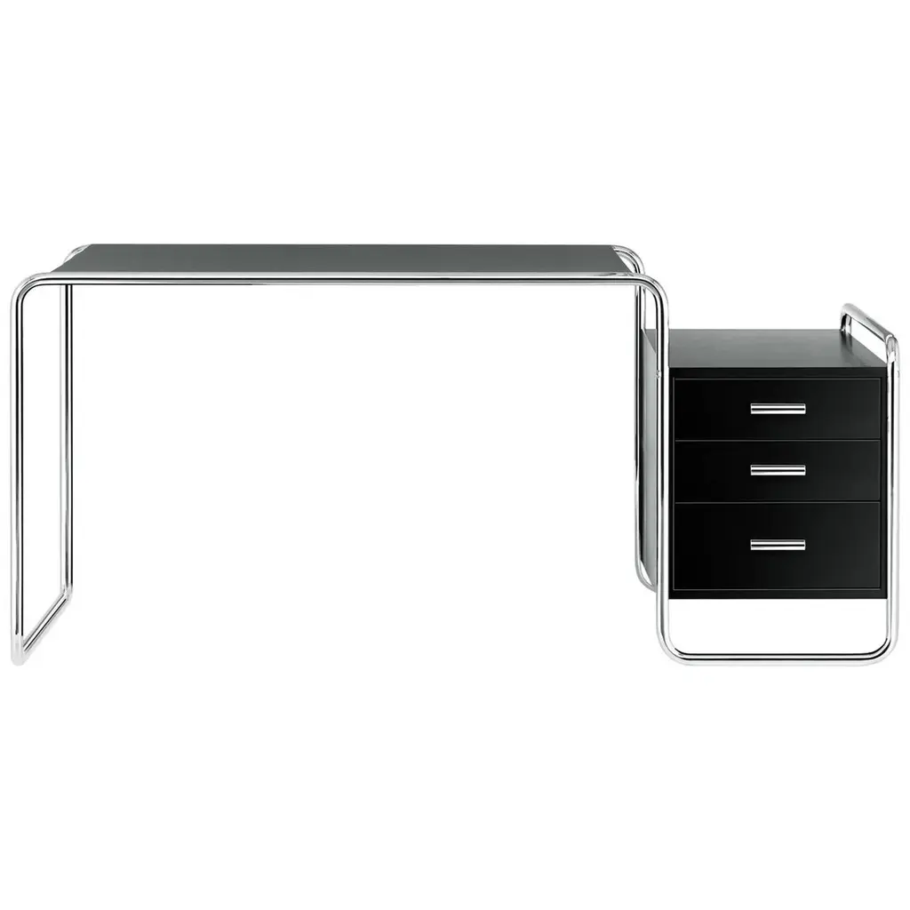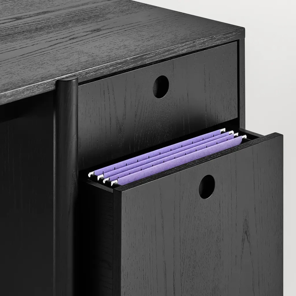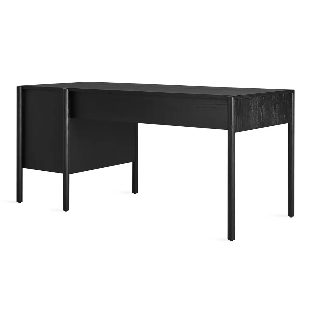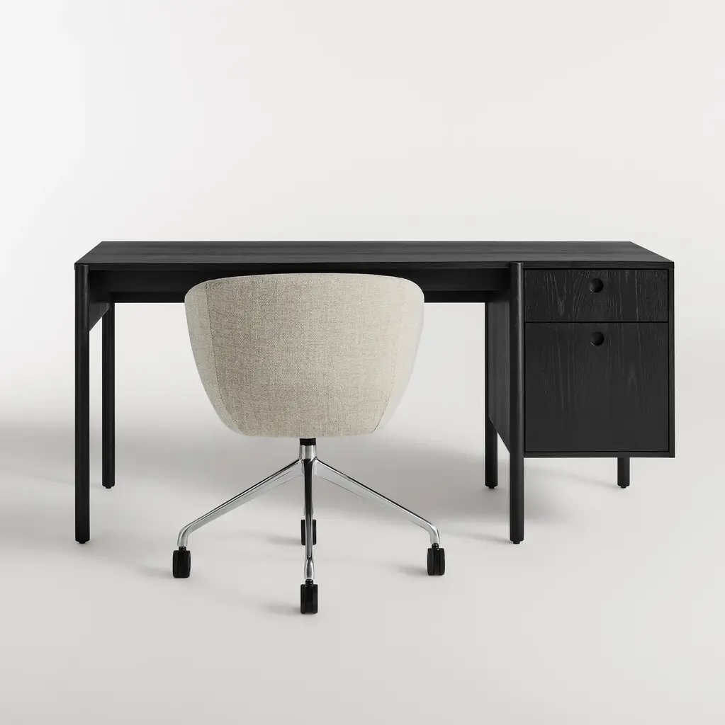 Warm wood pairs with slim dowel legs to create a sophisticated desk that’s up to any task. Two semi-cantilevered drawers keep office organization top priority. Round cutouts act as pulls and eliminate visual clutter while giving a nod to the leg shape.