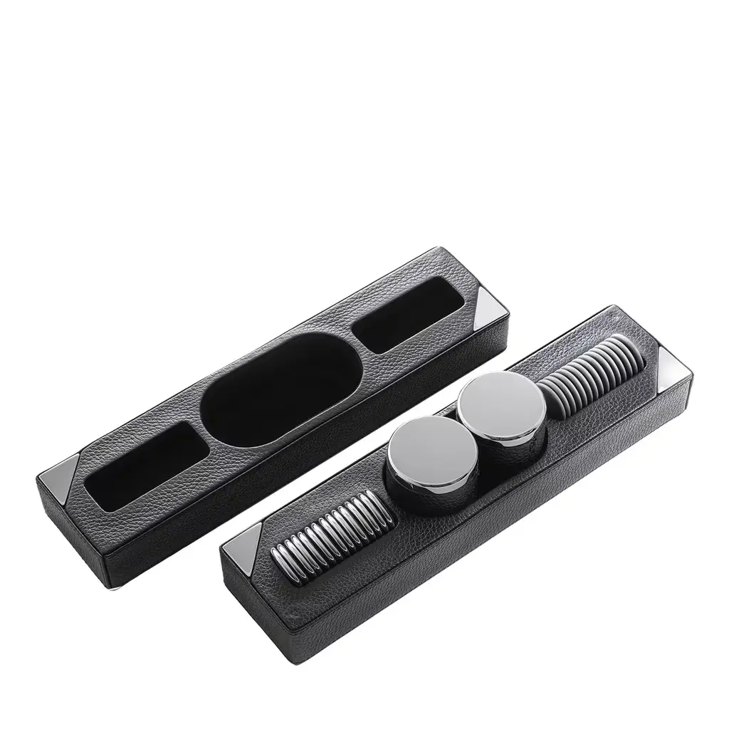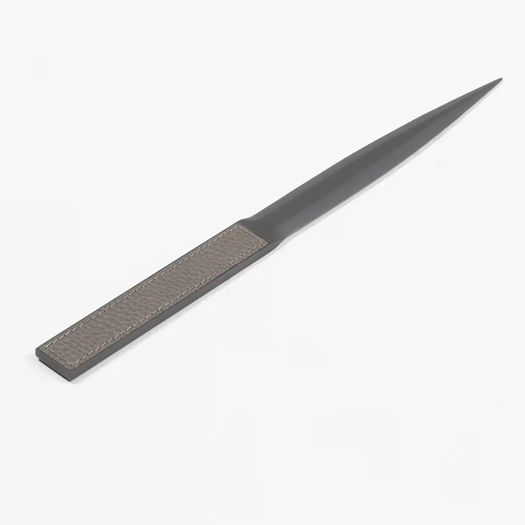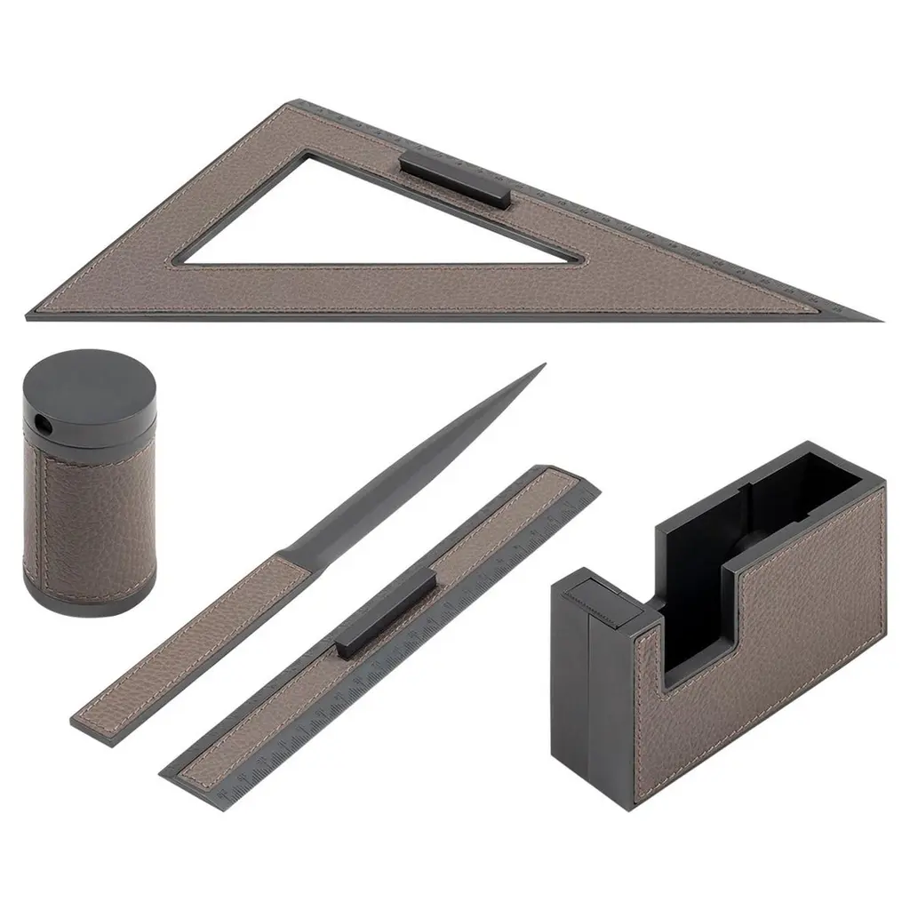 Exquisitely distinguished by a clean and essential design, this desk set will infuse subtle sophistication in any home office or study. Composed of a ruler, triangle ruler, pencil sharpener, paper-knife, and tape dispenser, each piece flaunts a sharp and bold geometric design carved from burnished bronze-finished metal, and enriched with refined leather inserts.