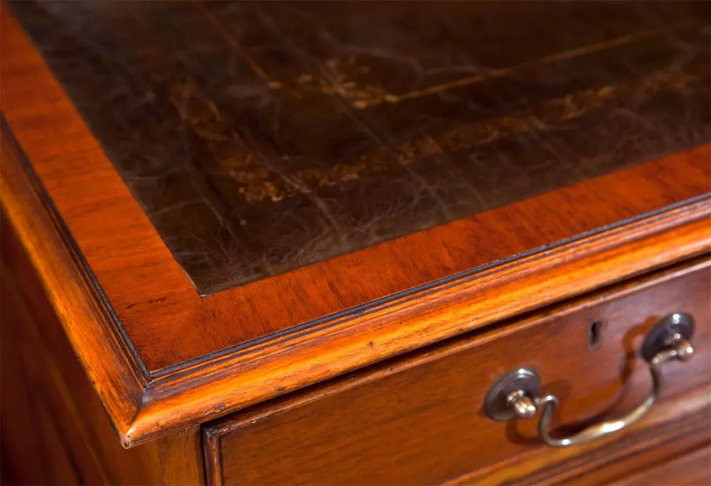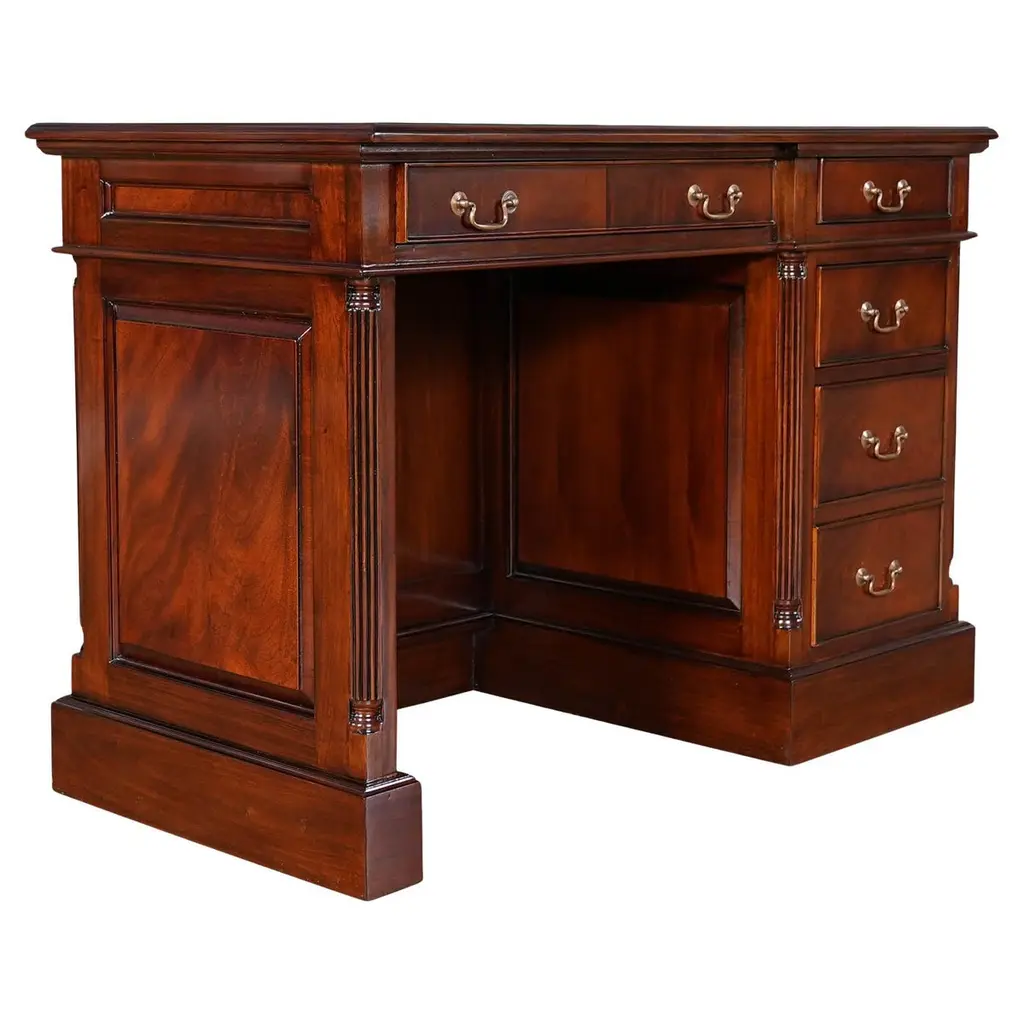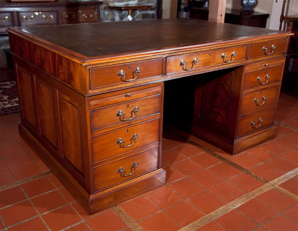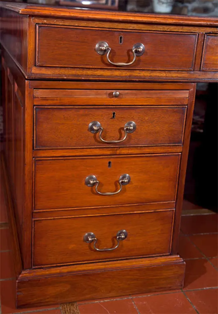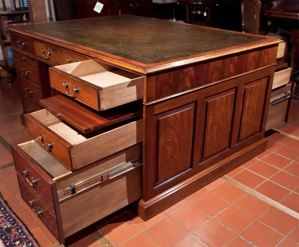 Featuring handsomely grained mahogany on raised side panels, this partners desk would make an attractive addition to any office. From its antiqued, hand tooled leather top to its four file drawers and slides, it combines form and function flawlessly.
