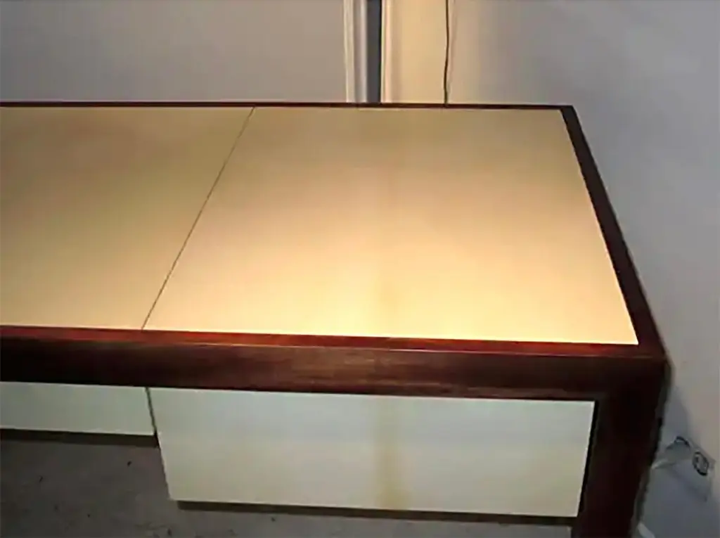 Custom Mahogany And Parchment Desk Featuring Three Central Drawers