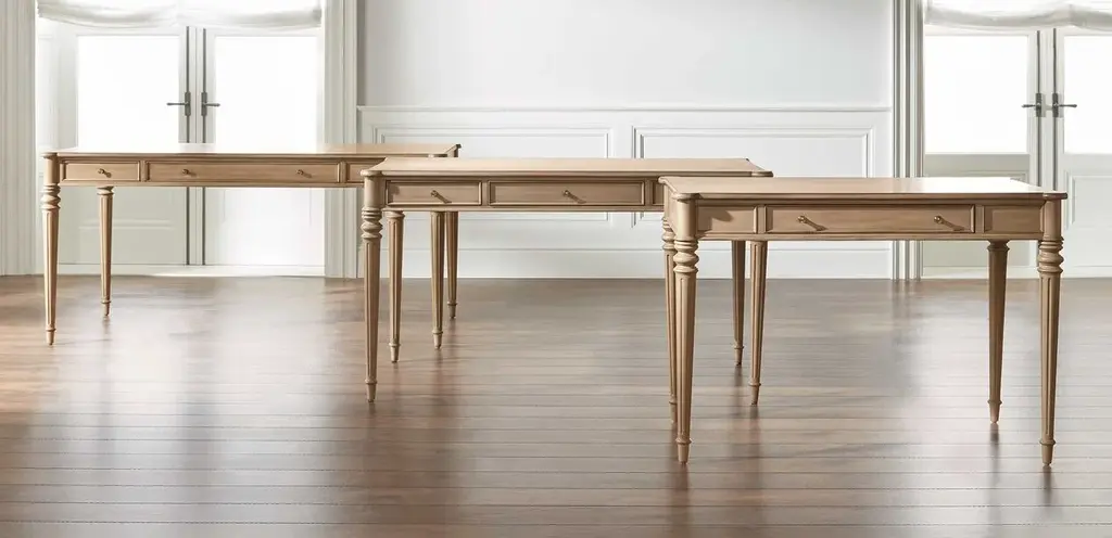 Add some creative expression to your home office with our turret-corner desk, crafted with rounded turrets at each desktop corner and edge molding around each drawer front. Opt for the elegant, sophisticated Emily leg, with its turned top and fluted carvings, or choose our Bamboo leg, capped with a metal ferrule, for nature-inspired global vibes.