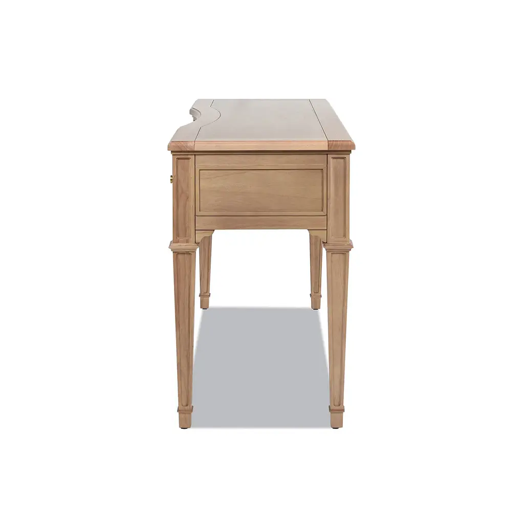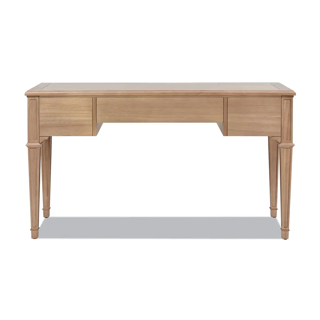 Beautifully constructed home office desk with elegant design suitable as a statement piece in your workspace; Constructed using kiln-dried solid Rubber hardwood and wood veneer laminated on MDF for excellent build and durability; Three soft-close drawers on metal slides provide ample storage space for organization; Satin-gold drawer pulls complement the natural wood finish of the desk; Main body of the desk and drawers arrive fully assembled - Minimal assembly of the legs required