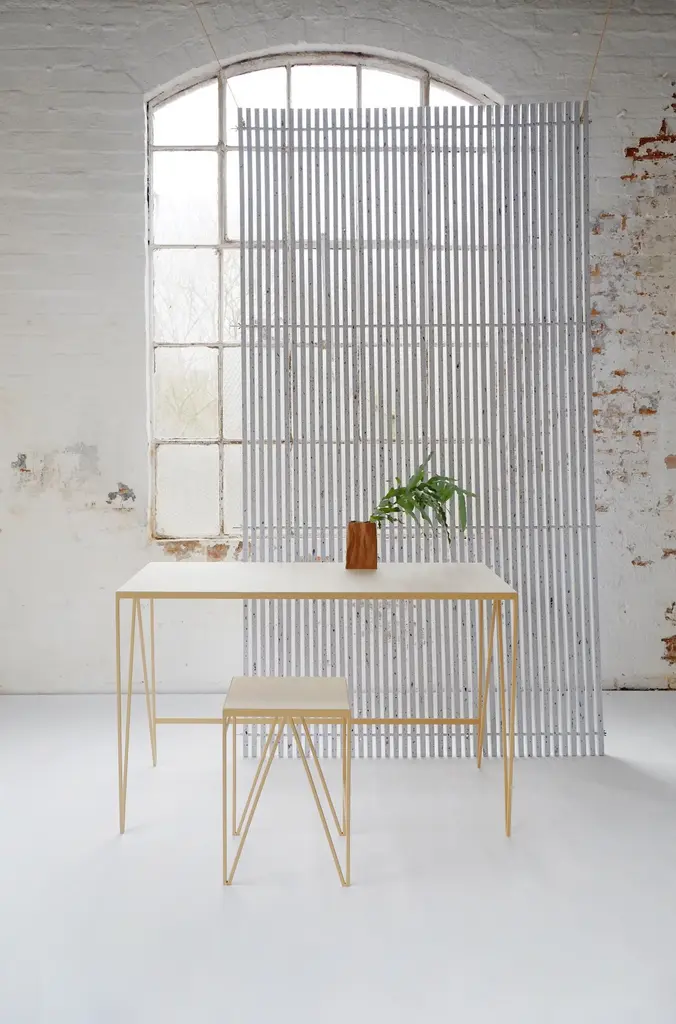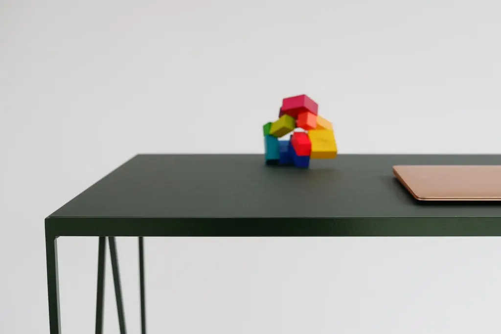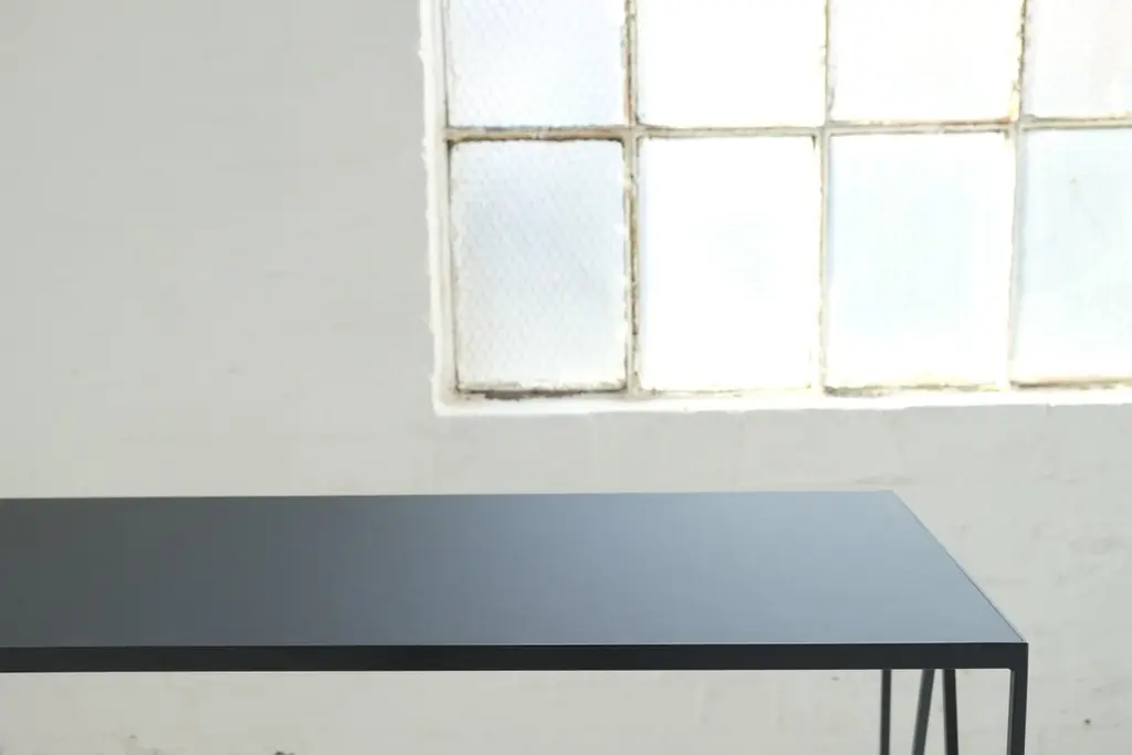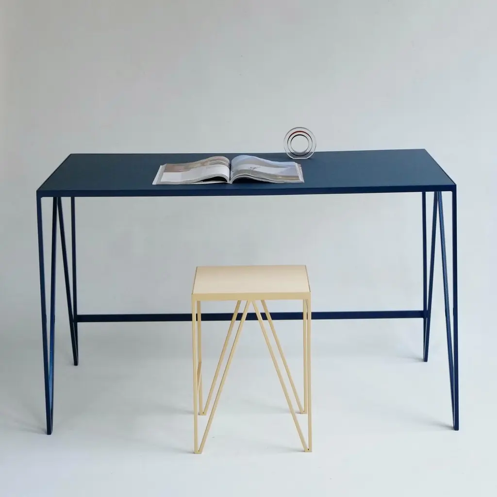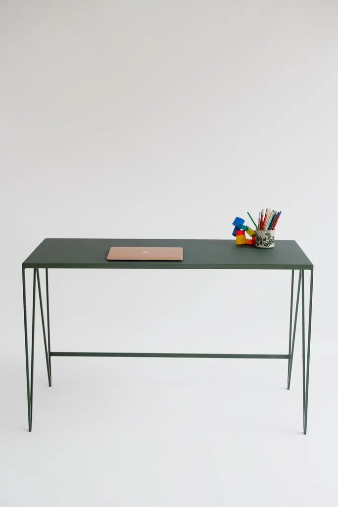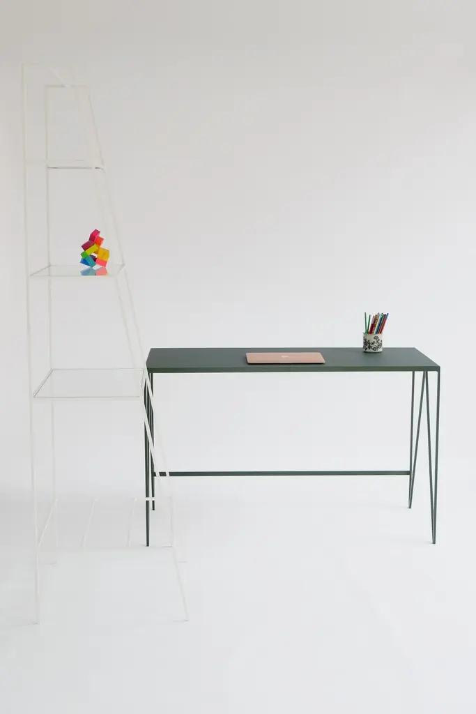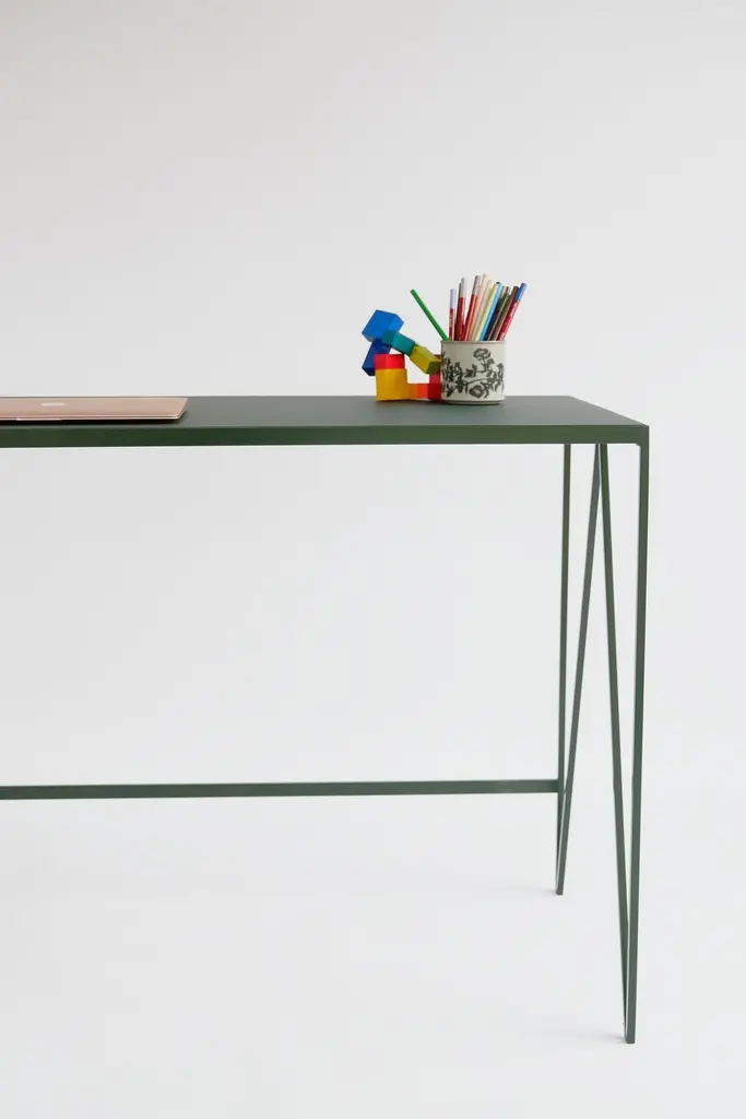 The &New Study desk is made with a deep green powder-coated steel frame and a color-matched natural linoleum tabletop. The linoleum for our desks is selected for the ecological properties of the linseed of which it is made. It also has a smooth and hard-wearing finish. This compact desk has been designed to be a minimal airy piece for a home study or office which looks great against both period details and in modern surroundings. Available with or without a drawer or shelf underneath the tabletop. Each table is handmade to order and made to last in high-quality materials. Colour samples available to order from our storefront - LU2894331610202 We can make our desks to any bespoke size and it is available in 15 powder-coated colors with a choice of linoleum colors for the tabletop.All &New products are manufactured in Britain in small batches. The result is a collection of furniture that celebrates the handmade qualities that make objects beautiful.The desk measures: 115 cm long x 52 cm deep x 72 cm high.Mirka & Jo&New - Modern British Furniture.Study desk/ Community registered design number: 002391839-0001.