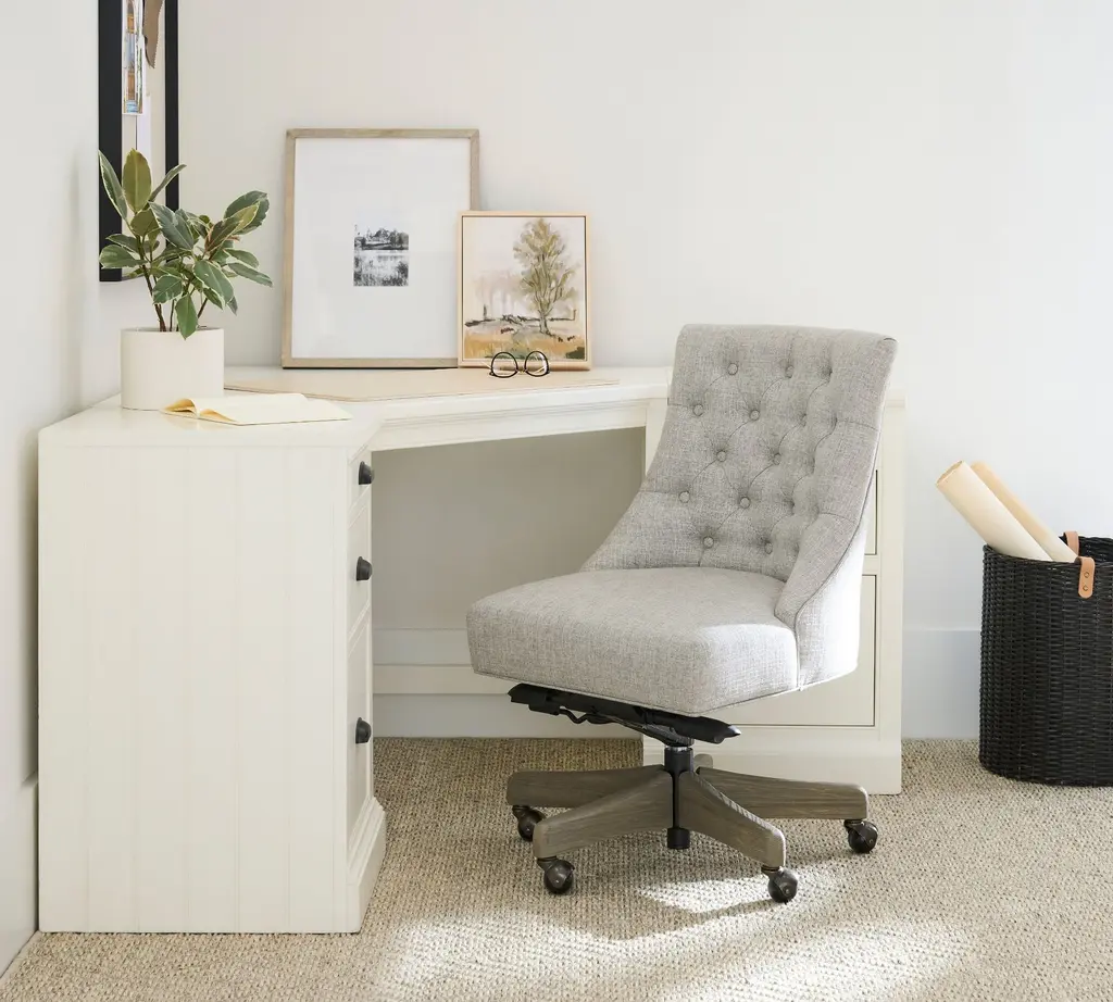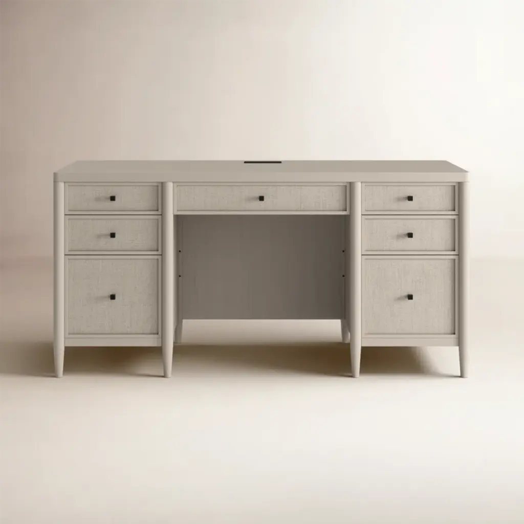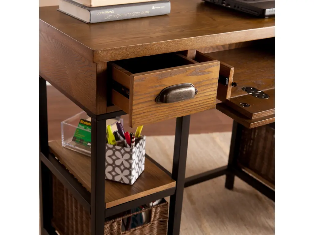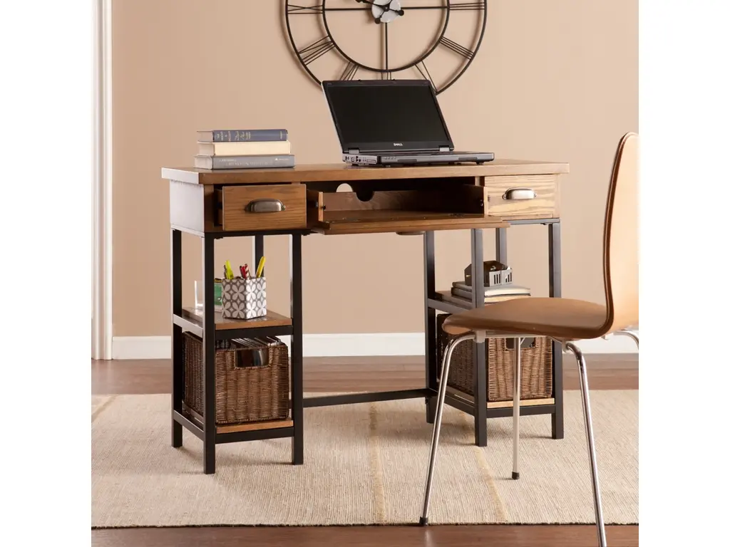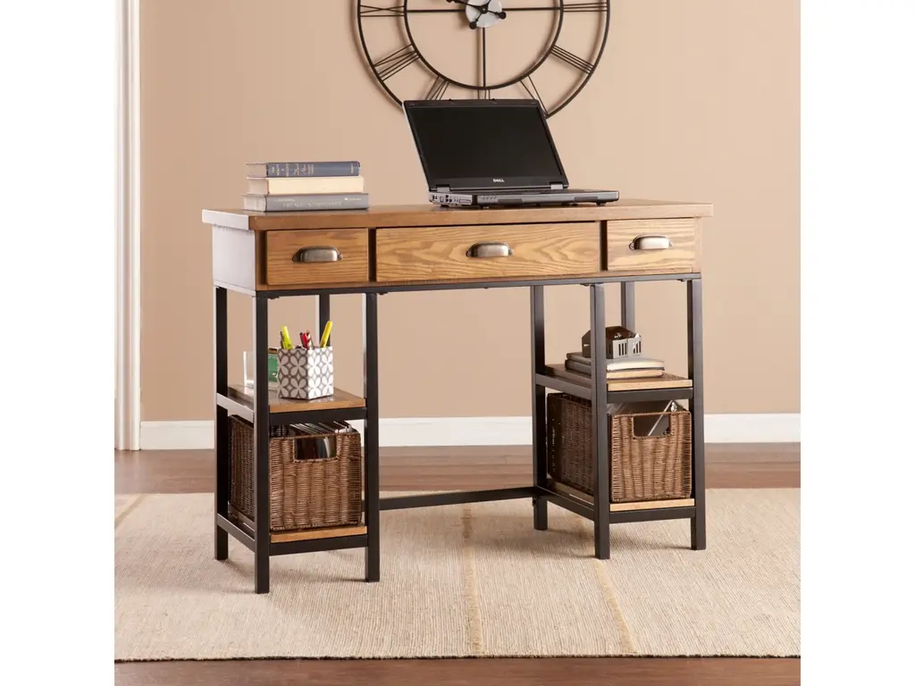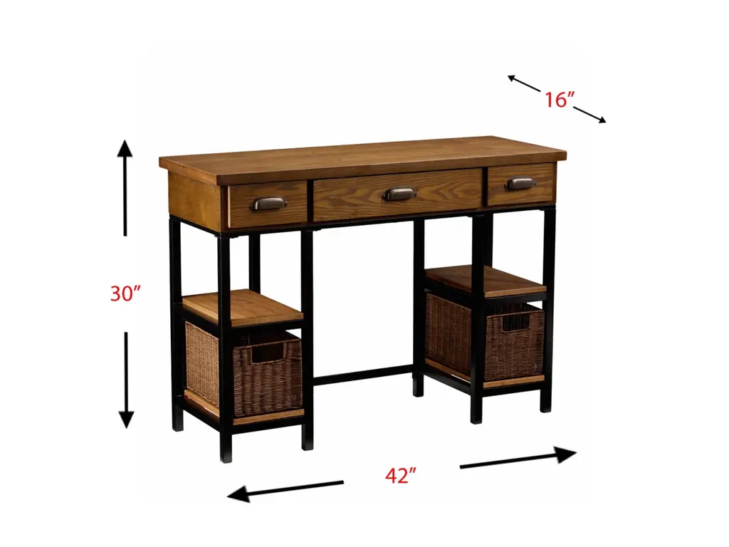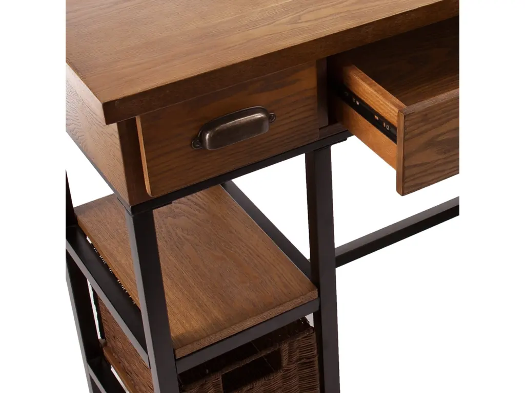 Stop at the crossroads of farmhouse and industrial style and pick up a rattan basket along the way with this unique desk. Its weathered look contrasts with a matte black frame, and apothecary-style handles add an alchemist touch. Storage abounds with shelves, baskets and drawers, while the sweeping desktop leaves plenty of room for monitors, office supplies, and working space. Turn your home office into a mixed-media haven, or place this eclectically cool piece in an eat-in kitchen for a fun storage option.
