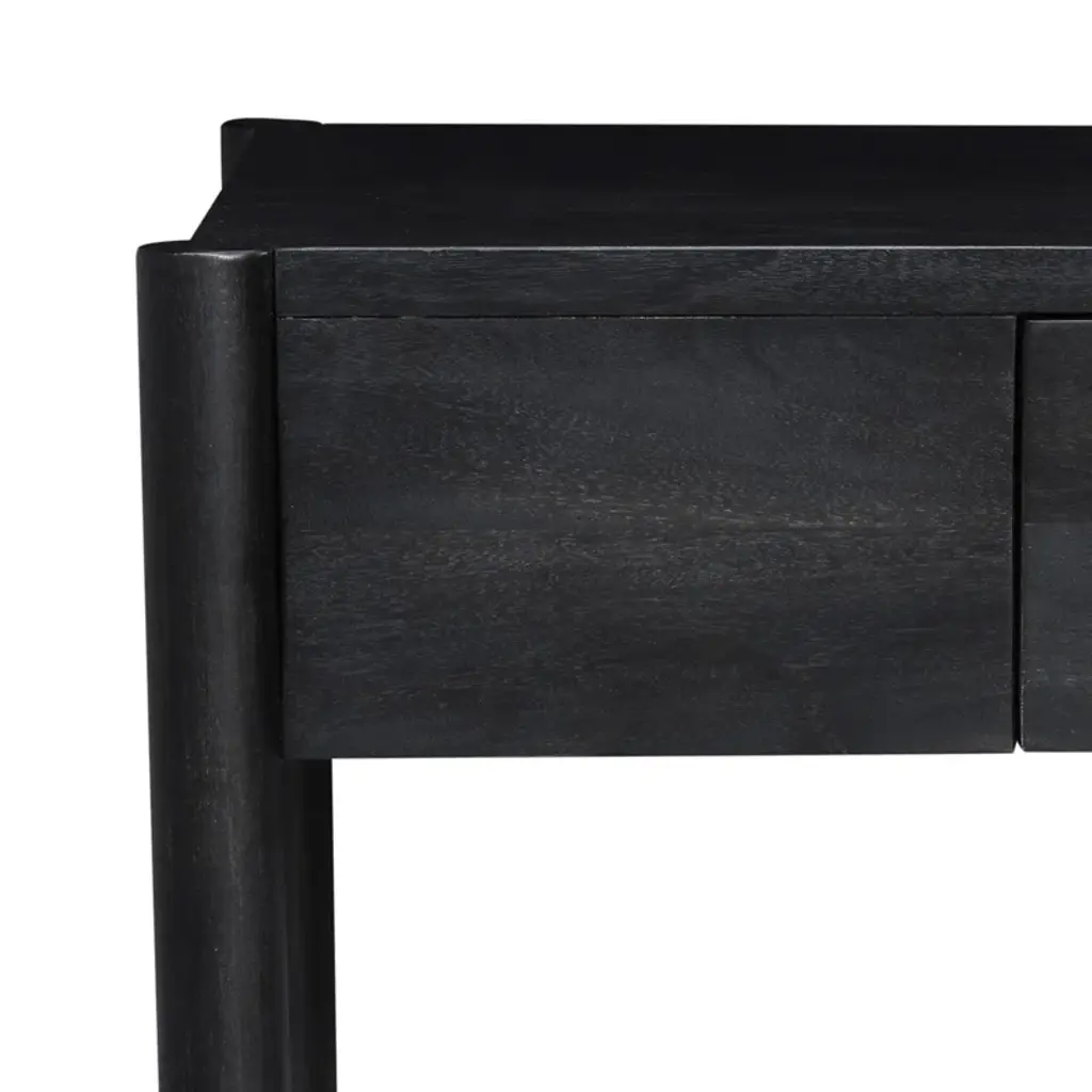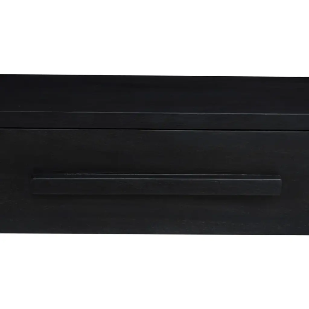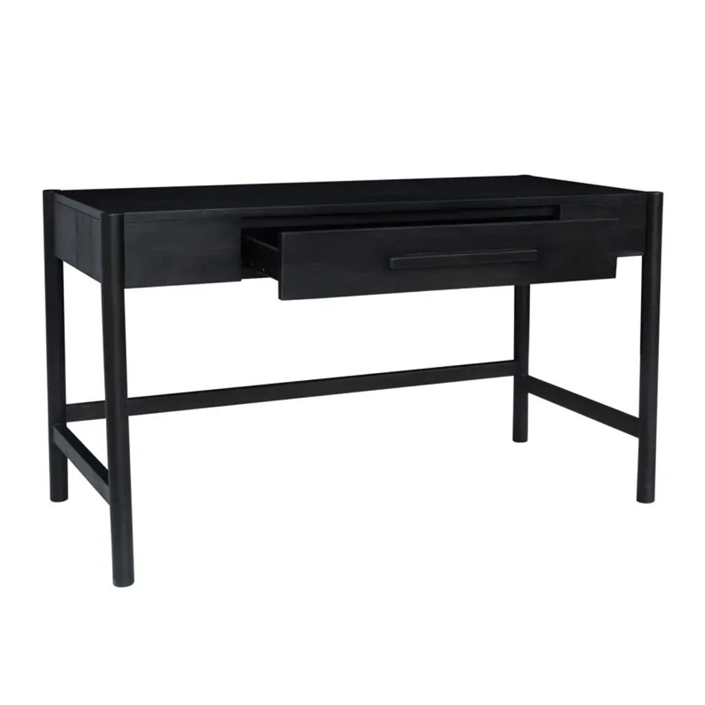 Minimalist marvel. Hand-finished in a matte black hue, our writing desk is the ideal centerpiece for your home office or study space. The solid wood base and wooden top create a clean silhouette that complements any decor. A single drawer offers hidden storage to keep your workspace organized, while the finished back allows for versatile placement. Embrace simplicity and elevate your space with this understated yet functional desk.