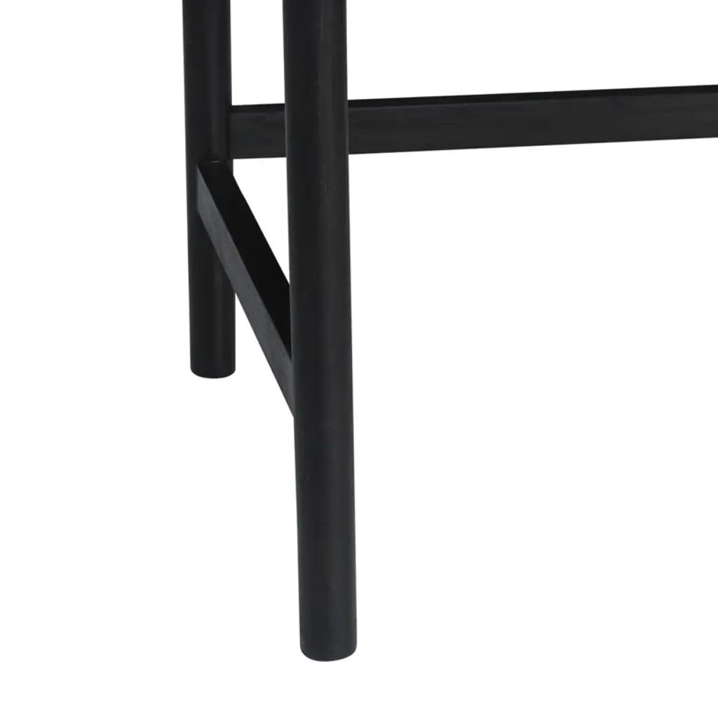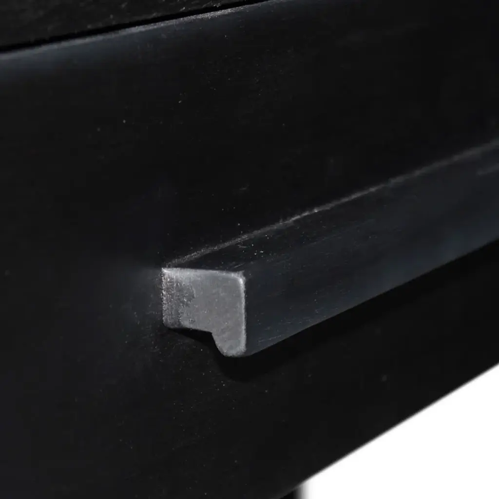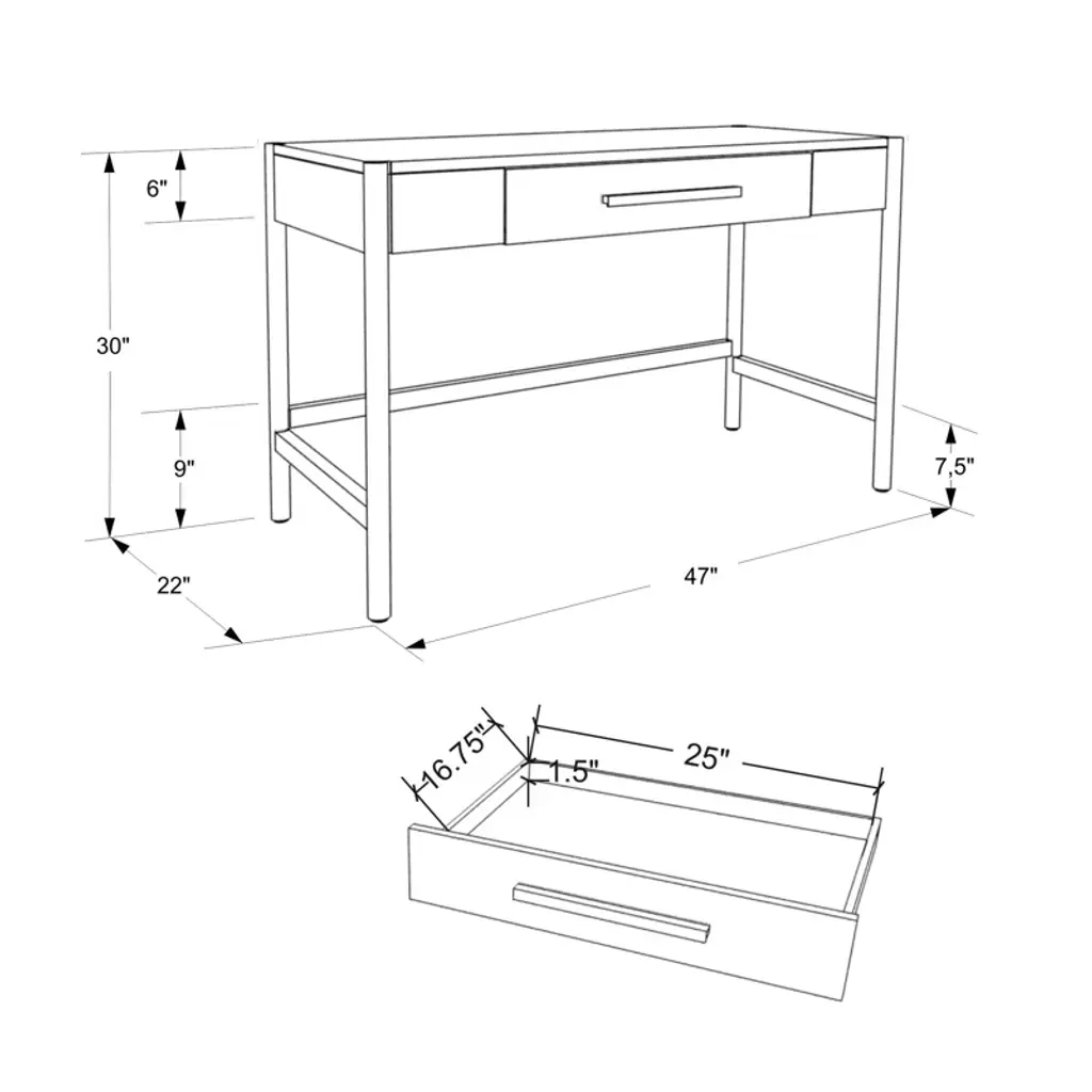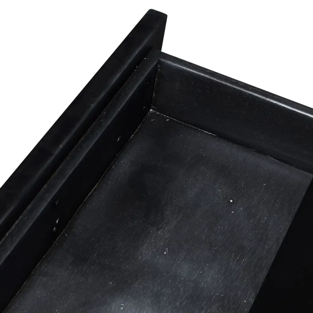 Minimalist marvel. Hand-finished in a matte black hue, our writing desk is the ideal centerpiece for your home office or study space. The solid wood base and wooden top create a clean silhouette that complements any decor. A single drawer offers hidden storage to keep your workspace organized, while the finished back allows for versatile placement. Embrace simplicity and elevate your space with this understated yet functional desk.