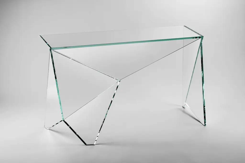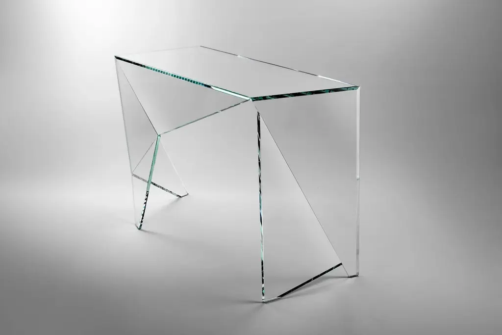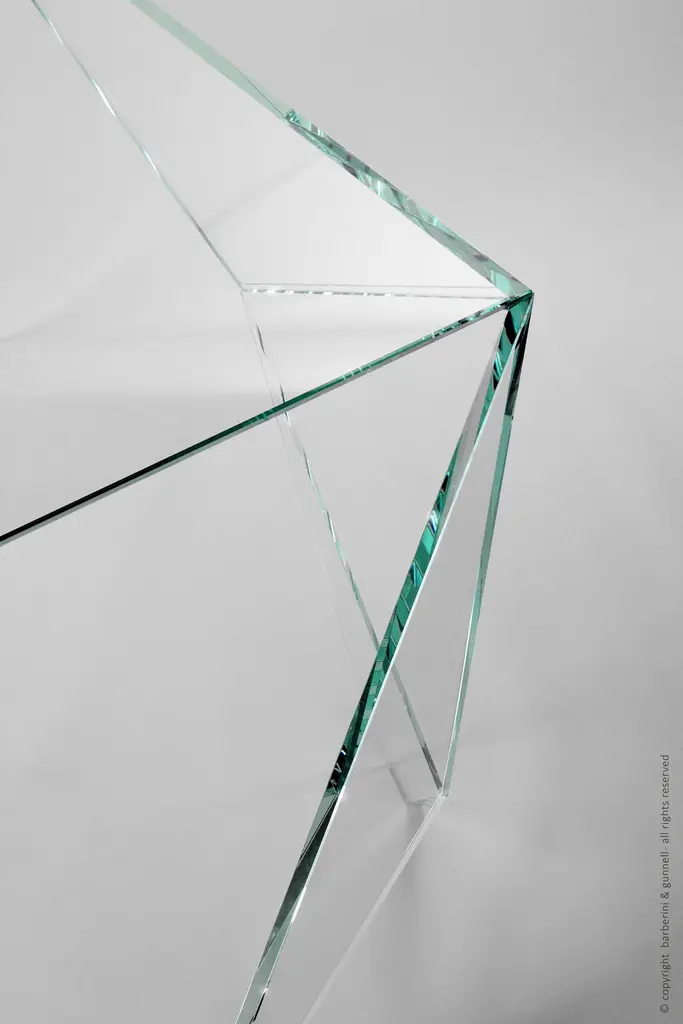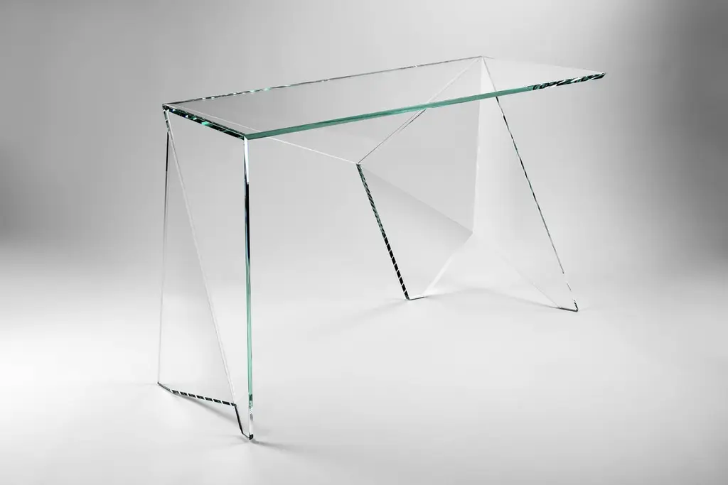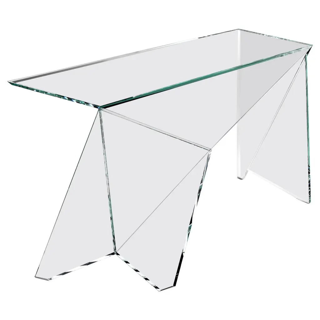 The desk 'Origami' is made of extra-clear crystal glass. Each sheet of extra-clear crystal glass is cut and ground with extreme precision, then the sheets are assembled by hand, having to fit together perfectly, the gluing operation requires extreme precision and experience. The final result is spectacular, the sloping edges of the glass create wonderful reflections and crystalline transparencies.Origami desk dimension: W 126 x D 50 x H 75 cm. Dimensions are customizable.Limited Edition of 35.Each table is hand signed by the artists (engraved), 100% handmade in Italy and comes with a “Certificate of Authenticity”.The inspiration for 'Origami' came from the observation of a simple piece of paper which, being folded a few times according to an antique Japanese technique, transforms into complex and delicate figures of innate fascination and beauty: The origami.The idea starts off with the concept of taking advantage of the resistance of glass appreciating its optical lightness with the intent to unveil the similarity between the complex art of origami and the workmanship of glass showing its magic transparency.Both, paper with its light sense of touch and opacity and glass with its physical heaviness and transparency present contrary features but have also a strong attribute in common: The concept of lightness. The tables origami were created as a result of this theory.The artworks by Barberini & Gunnell are regularly shown at international art fairs, such as PAD London, PAD Genève, PAD Monaco, Salon Art + Design New York, ArtMiami.IMPORTANT INFORMATION REGARDING SHIPPING:Please contact us for an independent shipping quote as we provide high quality shipping at competitive prices due to our frequency of shipping, relations with international shipping companies and the possibility to organize directly from Italy.We take care of the entire customs procedure and paperwork. On request we organize a white glove delivery and installation of the artwork inside of the property of the client. All shipments are ALL-RISK insured.We carefully pack all artworks in strong wooden crates to ensure safe transport. This service is done directly in our atelier and is complimentary.All of our artworks travel with a shock watch system in order to monitorate rough handling by shippers and movers.