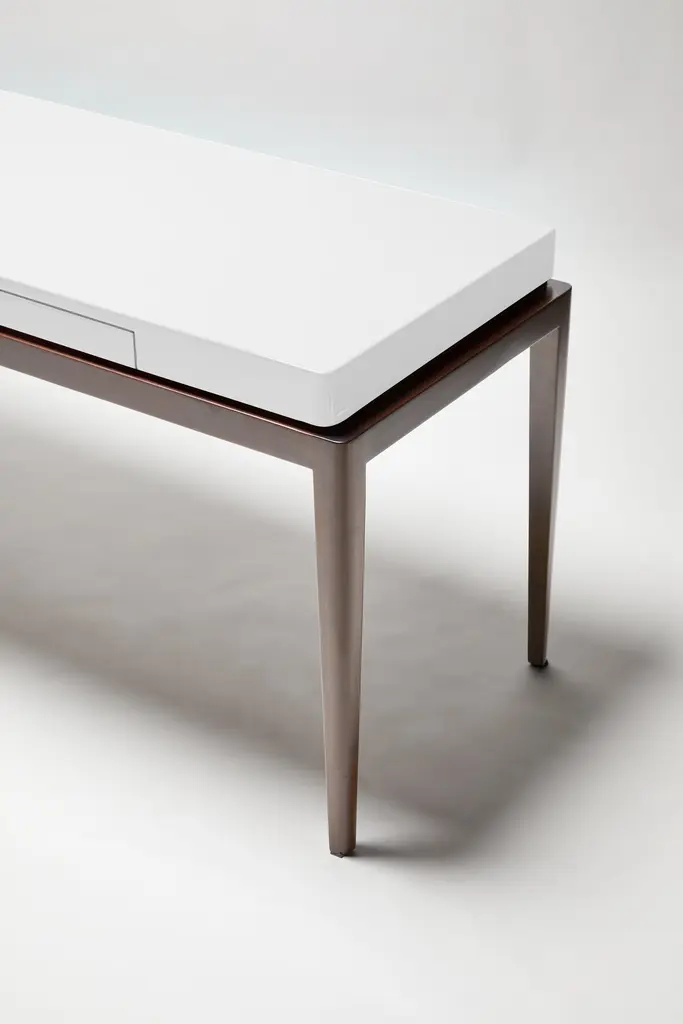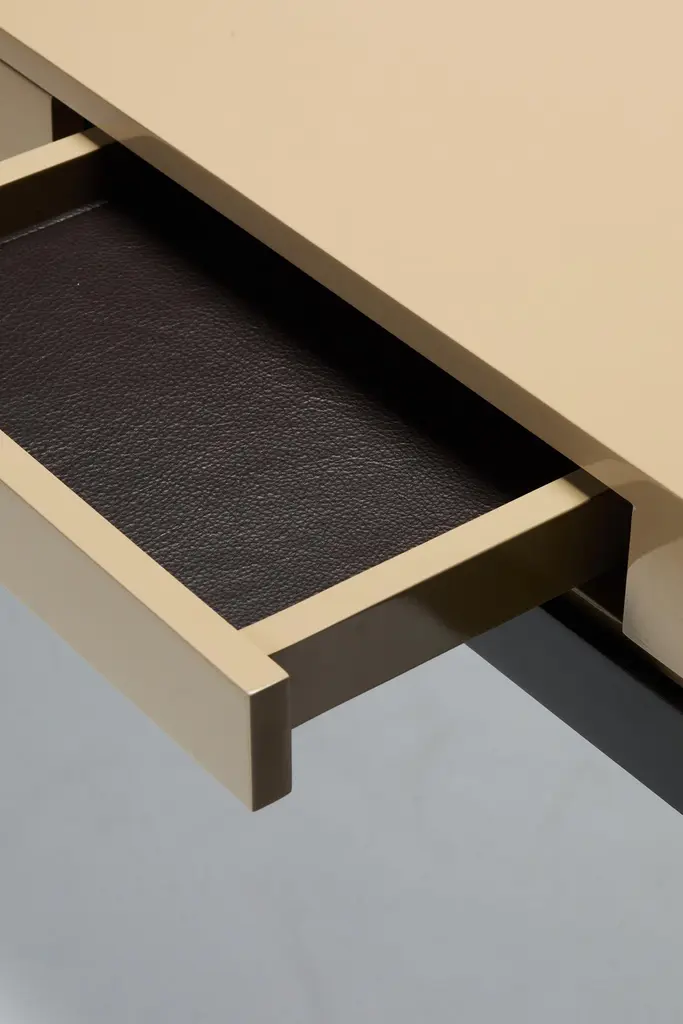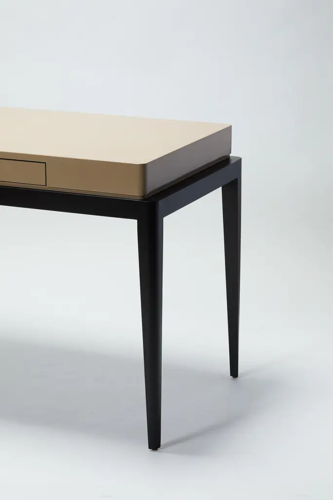 The perfect interior writing desk. Size: 140cmFlat surface, smooth, purity of the line only asking to be inhabited. If it is aconsole or a desk, TARA is a piece that distinguish itself with the power of itsminimalism. It is enough to dress up any interior. The glossy or matte lacquered top exists in several colors, the same ones as the dot table and offer to the sight a dive into intensity of material. A piece allowing to forge intimacy.Walnut legs, 2 drawers, leather finish inside the drawers.Special size and color made to order. Exits also as a console.Designed by Reda Amalou, 2019Availability on request.Please contact us for more information or for a bespoke order