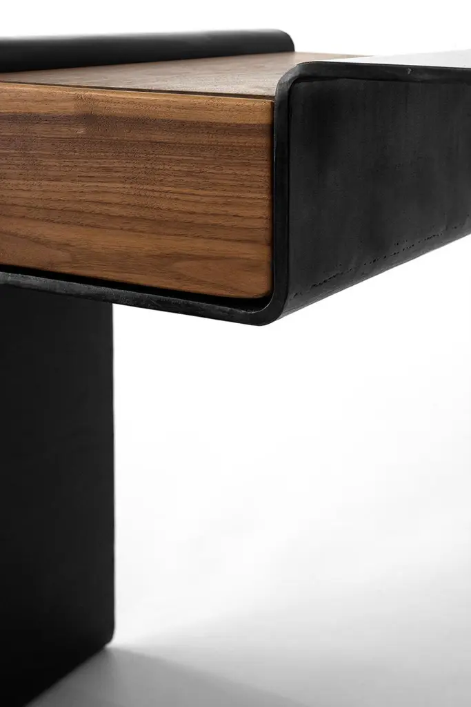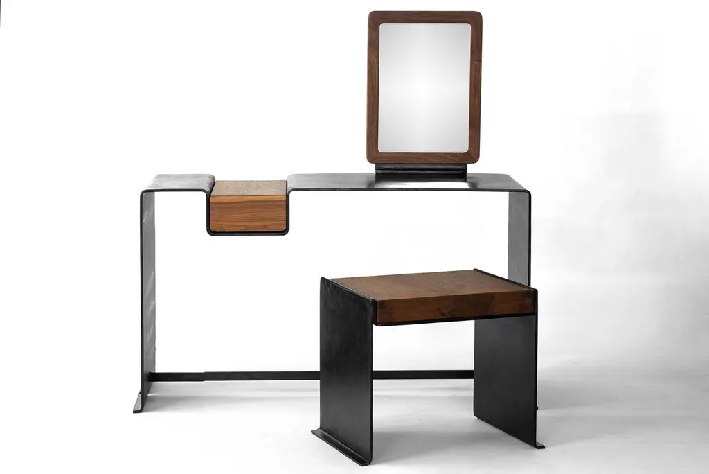 DESK NO. 1J.M. Szymanskid. 2023With the combined power of our steel smith and the modern machine, this desk/vanity is hydrology bent from 3/8” thick solid steel. The table is hand finished in a rich and warm black patina. A modern classic for generations to come. Custom sizes available. Made in the Bronx, New York, USA.Our products are fabricated and finished by hand, so variations in size, shape, and patina color are a natural result of this process. Tooling marks and surface scratches are part of the character of many finished pieces. All products are sealed with oil and wax, which, over time, are not impervious to moisture. Our blackened steel pieces installed outside or in areas exposed to moisture indoors, especially in marine environments, will rust. Condensation from hot and cold drinks will leave rings on blackened steel table tops. Coasters or placemats can protect the finish. Periodic maintenance of blackened steel items may be required.