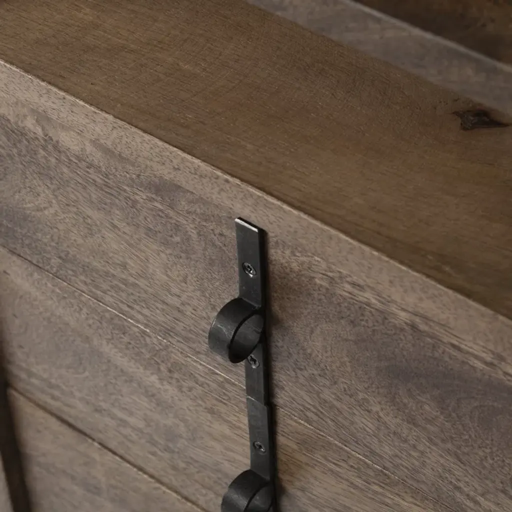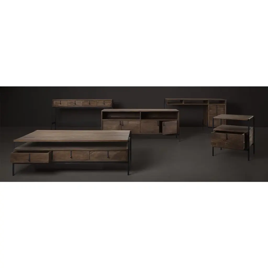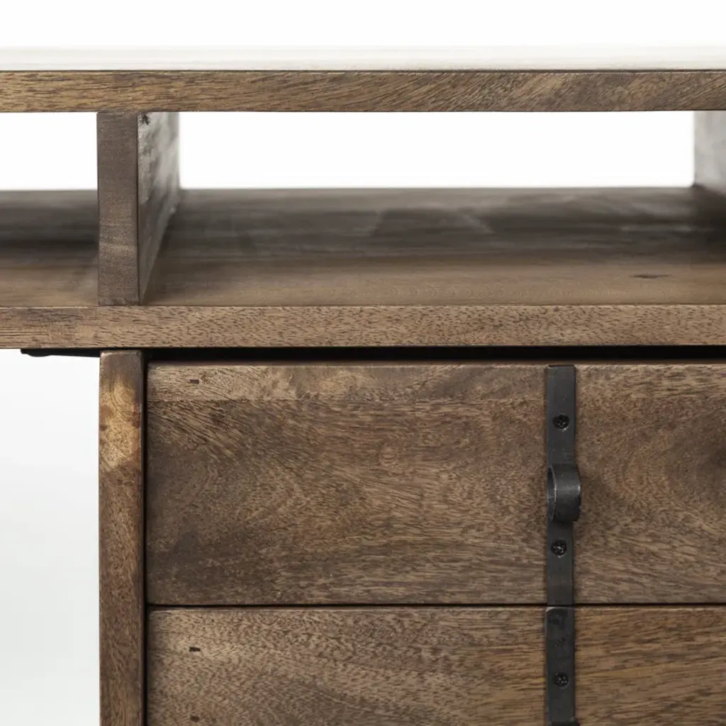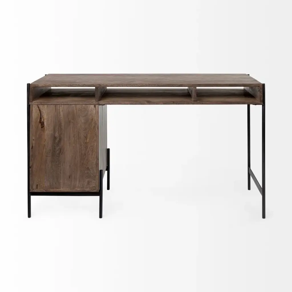 This writing desk nails the mixed-material look we love with its clean lines and industrial accents. It's crafted from solid and engineered wood with a medium brown finish that highlights the wood's grain. We love that the desktop gives you ample room to spread out your work, while three shelves feature an open design to keep your cords right where you want them – out of sight. Best of all, this desk has a finished back, so you're free to style it wherever inspiration strikes.