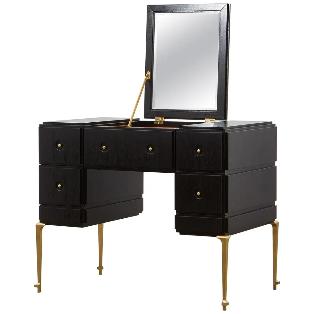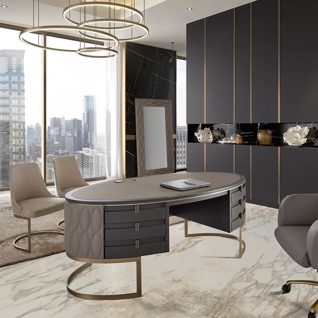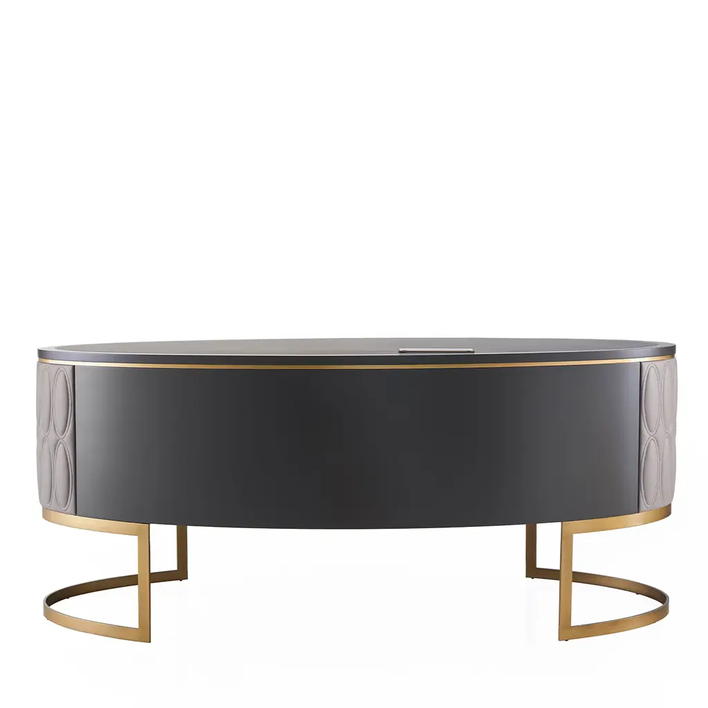 A one-of-a-kind creation, this desk embodies functional elegance with its modern design and luxurious materials. The curved matte slate-lacquered wood structure rests on a bronzed metal base, while the top features wood and quilted 'Chalky' leather. Six soft-closing drawers with light wood interiors offer both style and practicality. Quilted leather accents make it the focal point of any executive office or presidential study. Optional customizable power strip available.