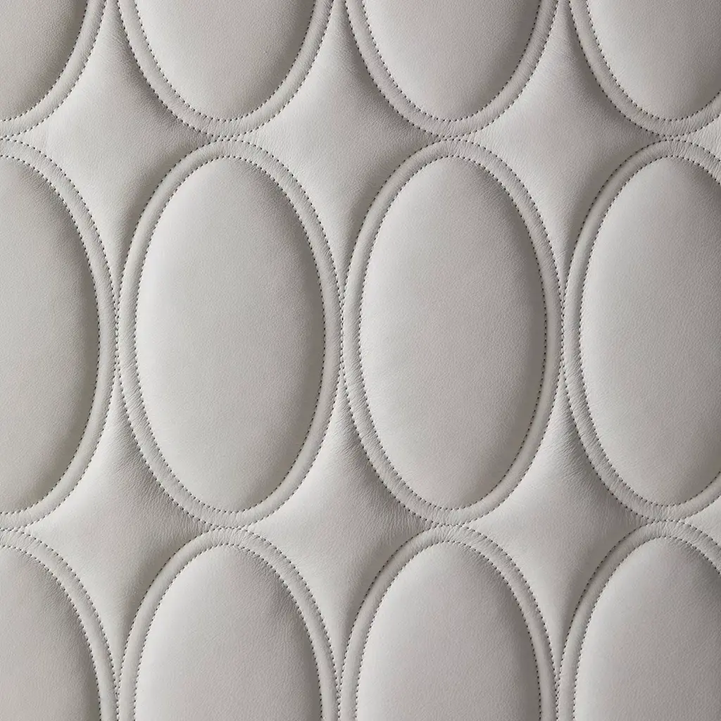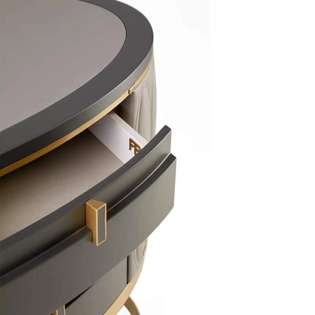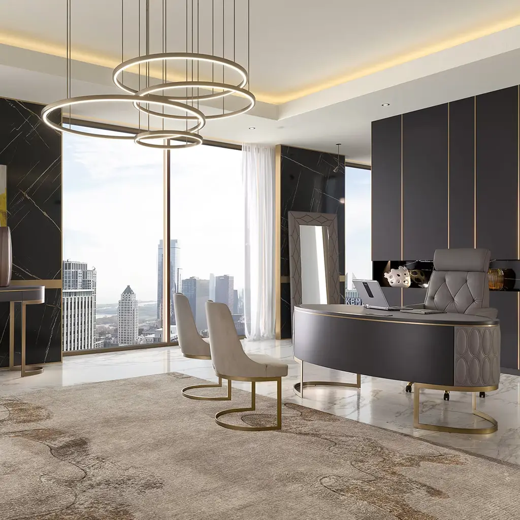 A one-of-a-kind creation, this desk embodies functional elegance with its modern design and luxurious materials. The curved matte slate-lacquered wood structure rests on a bronzed metal base, while the top features wood and quilted 'Chalky' leather. Six soft-closing drawers with light wood interiors offer both style and practicality. Quilted leather accents make it the focal point of any executive office or presidential study. Optional customizable power strip available.