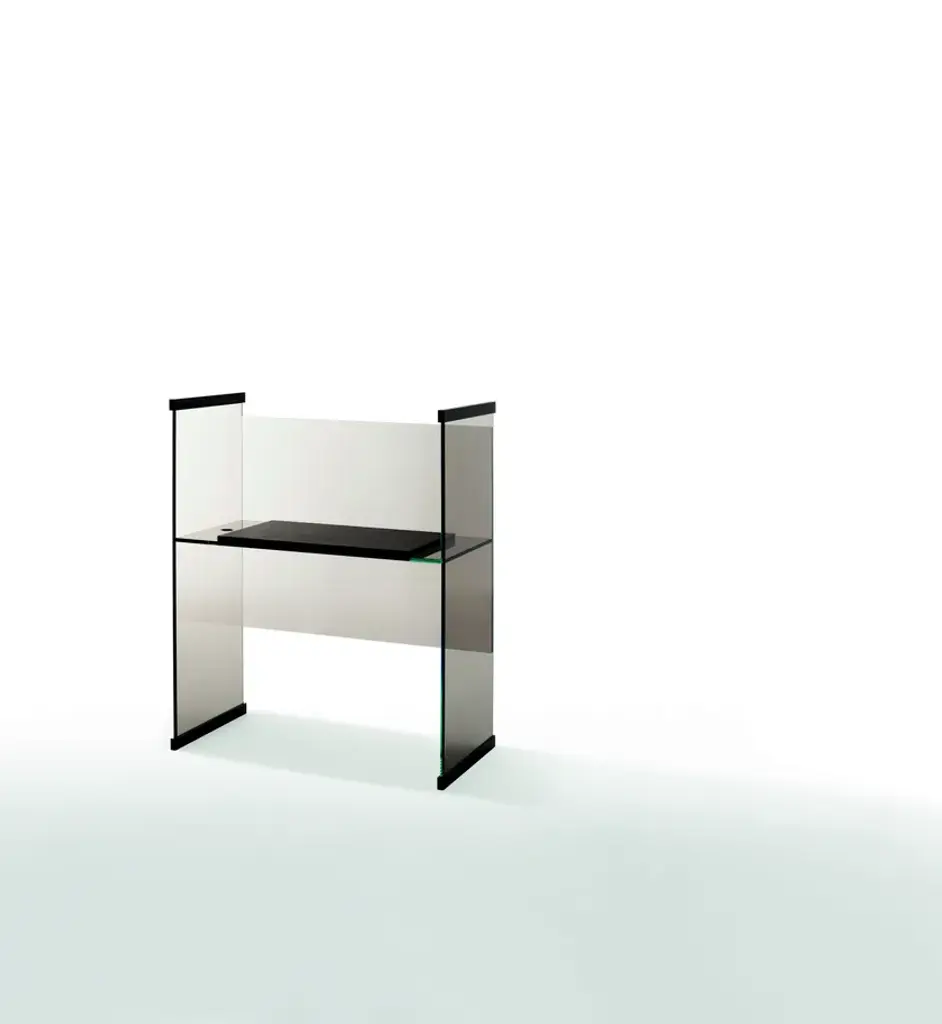 Diapositive is a collection comprising a bench, sofa, desks and small bookcase in transparent extralight, laminated and thermo-welded glass with elements of solid natural ash or dark brown oak at the outer edges of the supporting sides. A monochromatic version is available in transparent glass in the following finishes: extralight, clear grey, dark grey, lilac or orange. There is also a second version in two colours, still in transparent glass, available in two different combinations: a) orange back, clear grey sides, top/seat. b) lilac back, extralight sides and top/seat. The bench is available only in the monochromatic version. The seats are supplied with a cushion in black or mélange grey 12mm thick felt. A panel in natural ash wood or in dark brown oak lays on the desks tops. The bookcase and the desks are available with cable outlet.