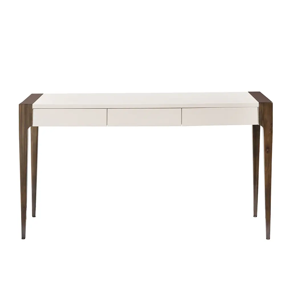 The Dior Desk is an interesting blend of materials. The faceted legs and table ends are elm in a medium walnut finish while the mid-table is a white lacquer faux parchment. Ships In 4-5 Weeks Three drawers Elm wood finish White lacquer, faux parchment top This image is for illustrative purposes only. The colors shown are accurate within the constraints of lighting, photography, and the color accuracy of your screen.