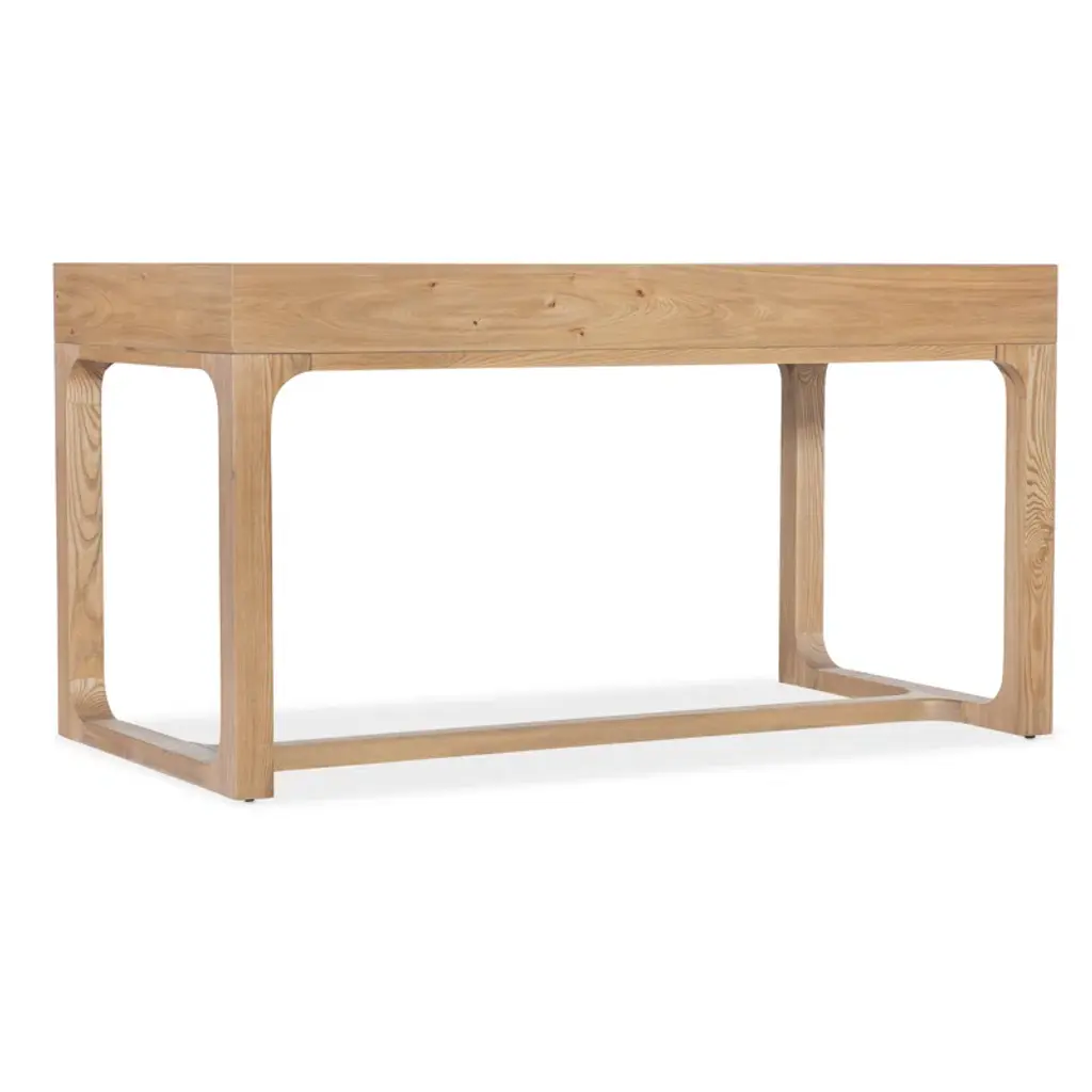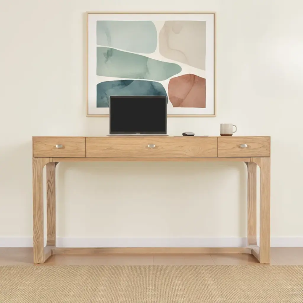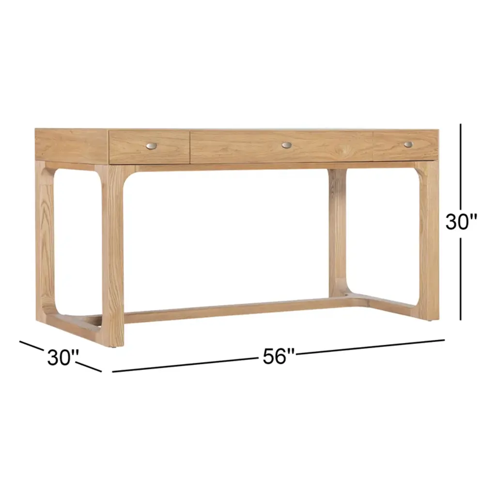 A sleek silhouette combines with a light natural pecan finish over pecan veneers to create a simple chic design. The Documents desk has 3 drawers. The center drawer has a drop-front for keyboard use and the left and right drawers have removable dividers and a writing slide and drawer organizer that can be used in either drawer. Pewter oval knobs add a finishing touch.