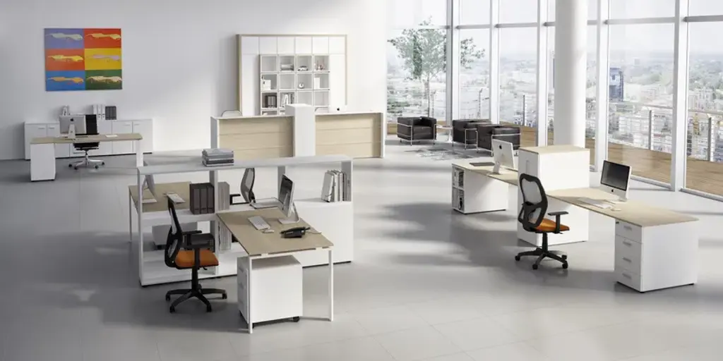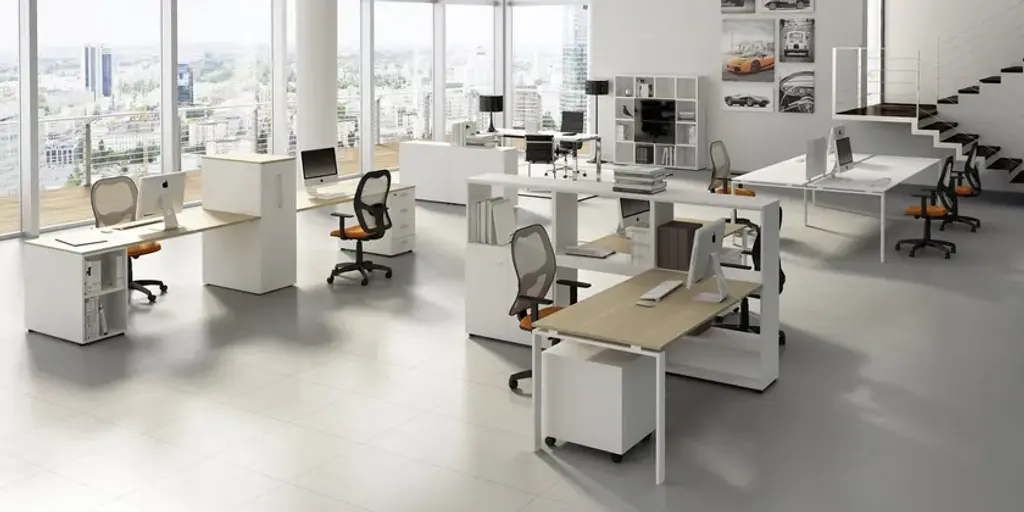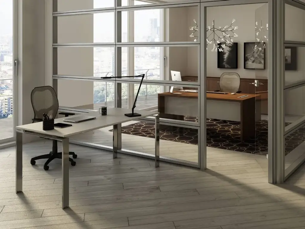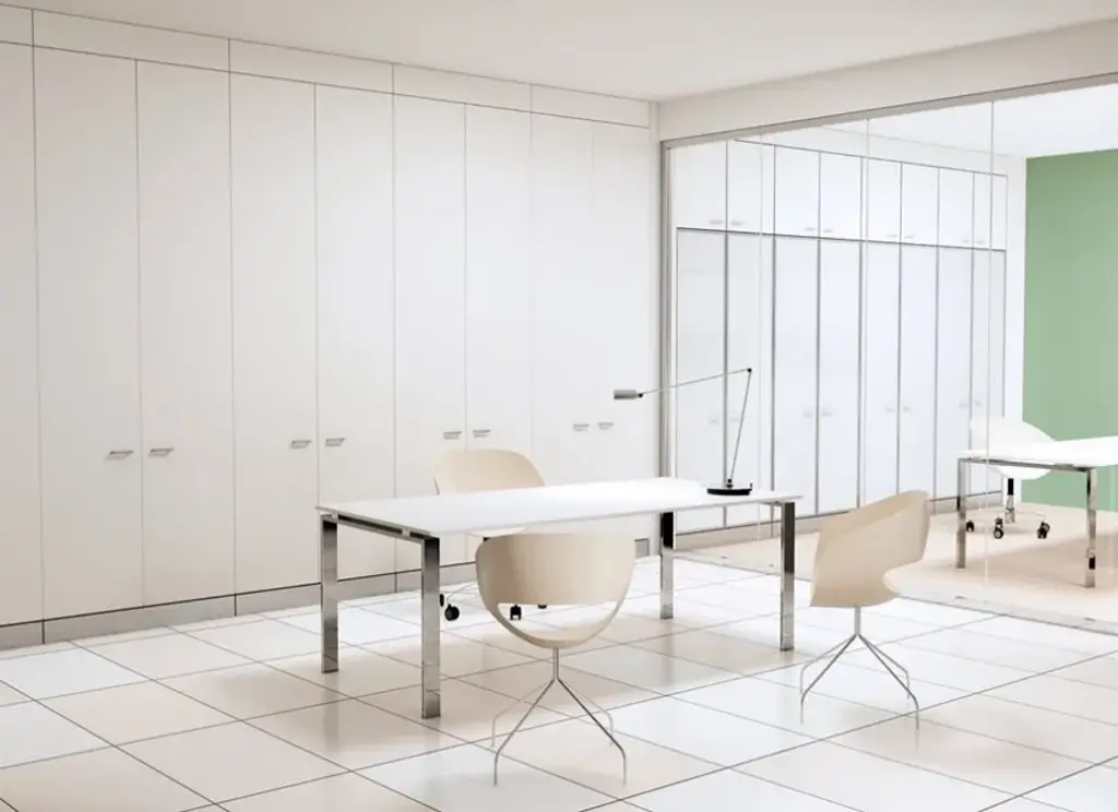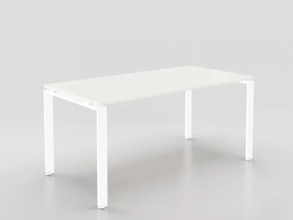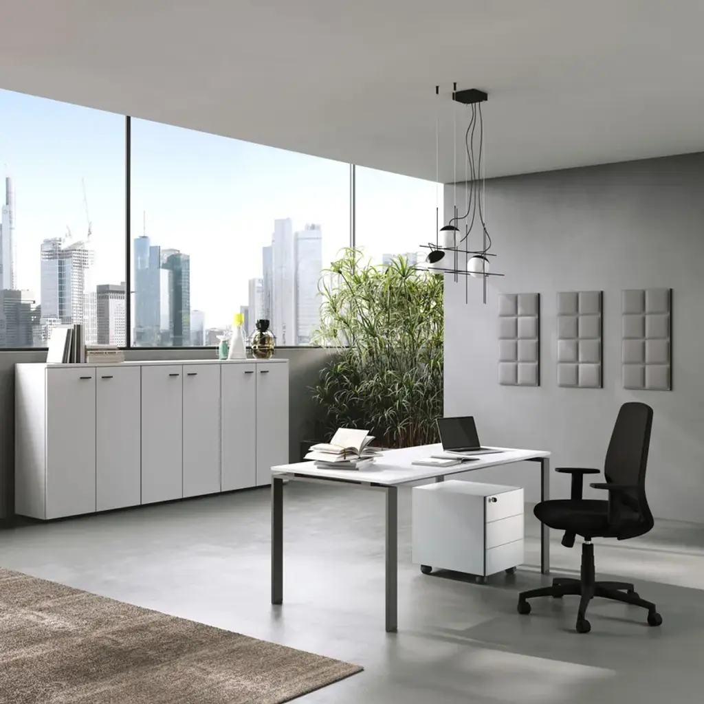 The worktops are made of melamine enamelled wooden conglomerate 18 mm thick, with a low formaldehyde content. The worktops are available in white, lightly veined, oak or dove-coloured solid finishes, with coloured ABS edge. The three standard finishes are available in rapid delivery. The collection is completed by a wide range of single linear desks, with multiple workstations, long shelves that can be aggregated at 90 degrees; in addition to the range of table tops that can be combined in line (bench), available with or without load-bearing drawer units. The structure of the Doria line consists of a pair of under-storey beams and a pair of “bridge” terminal legs. The legs are made of pickled metal tubular tubular metal with rectangular section 70×20 mm. and a thickness of 2 mm, laser cut and perforated. In addition to single legs and shared legs for multiple workstations, the system also includes a series of asymmetric legs that allow the use of load-bearing filing cabinets. Adjustable ground adjustable feet complete the metal legs. The metal beams have a “C” section that gives them the necessary flexural strength. They are made of pickled sheet metal P11 2 mm thick, the cutting and processing are carried out by punching and subsequent press-folding. All metal parts are available in white Ral 9003 finish with a smooth matt finish, or in bonderized grey or chrome finish.