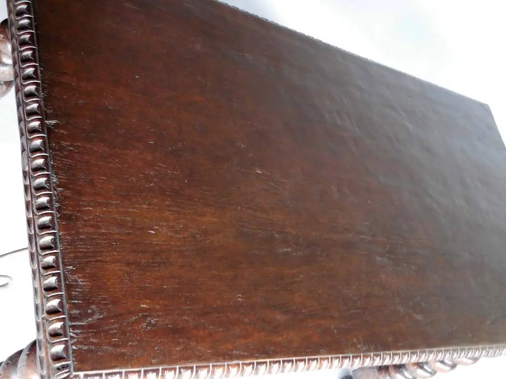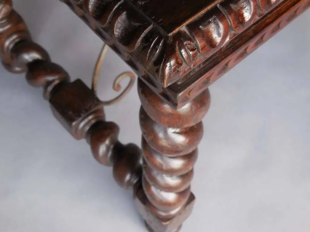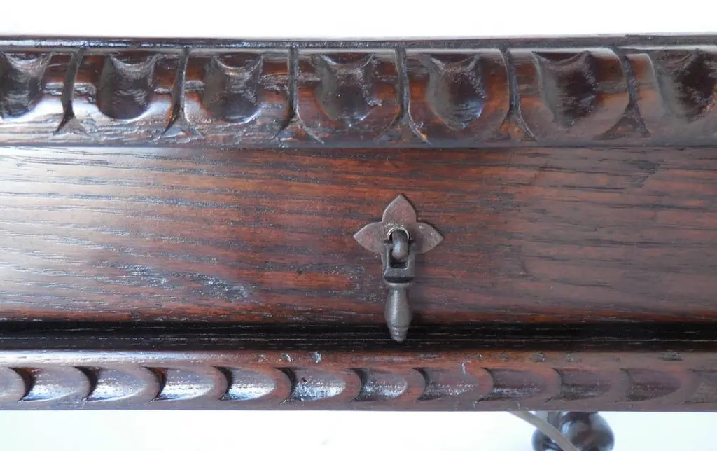 Our Custom Salamanca two-drawer oak writing desk with iron supports. Hand-carved details throughout. Iron pulls. Beautiful patina. Can be made in any size, and finish. Can also be making in walnut and mahogany. Bench made in Los Angeles by Dos Gallos Studio. Lead time 8 to 12 weeks.CUSTOM PRICES ARE SUBJECT TO CHANGE. PLEASE INQUIRE BEFORE PLACING AN ORDER. CUSTOM ORDERS ARE NON RETURNABLE. FINAL SALE