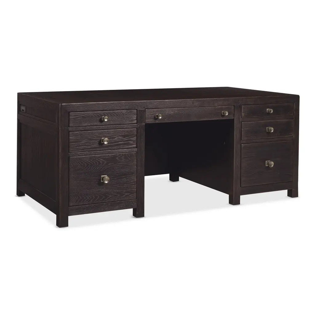 A commanding centerpiece for the executive home office, the Driftwood Desk from Hooker Furniture blends rustic character with professional performance. Its distressed, sun-faded finish highlights the wood's natural knots and texture. This desk is a true workstation, featuring seven drawers, a drop-front keyboard tray, and integrated wire management for seamless organization. With locking file drawers and discreet storage on the visitor's side, it’s designed for those who value both heritage style and modern function. Highlights: